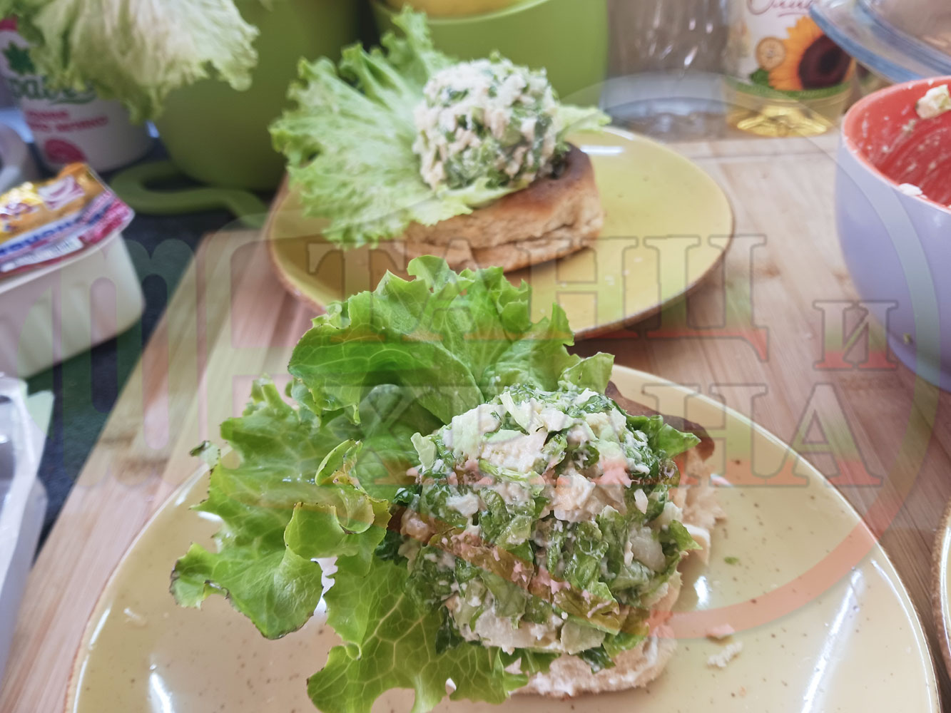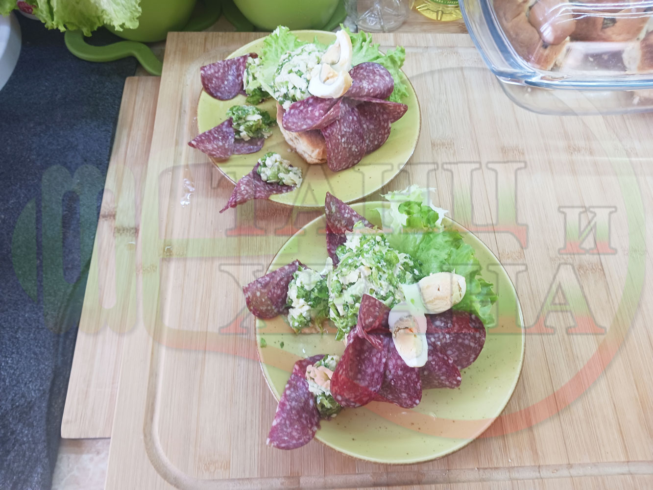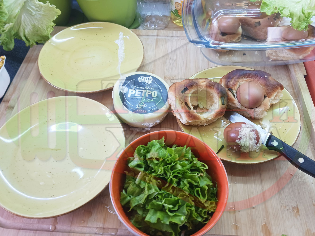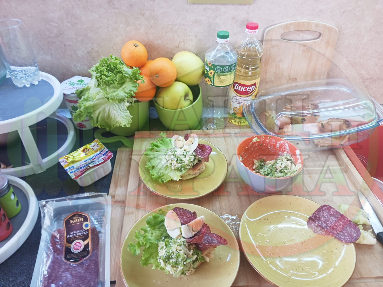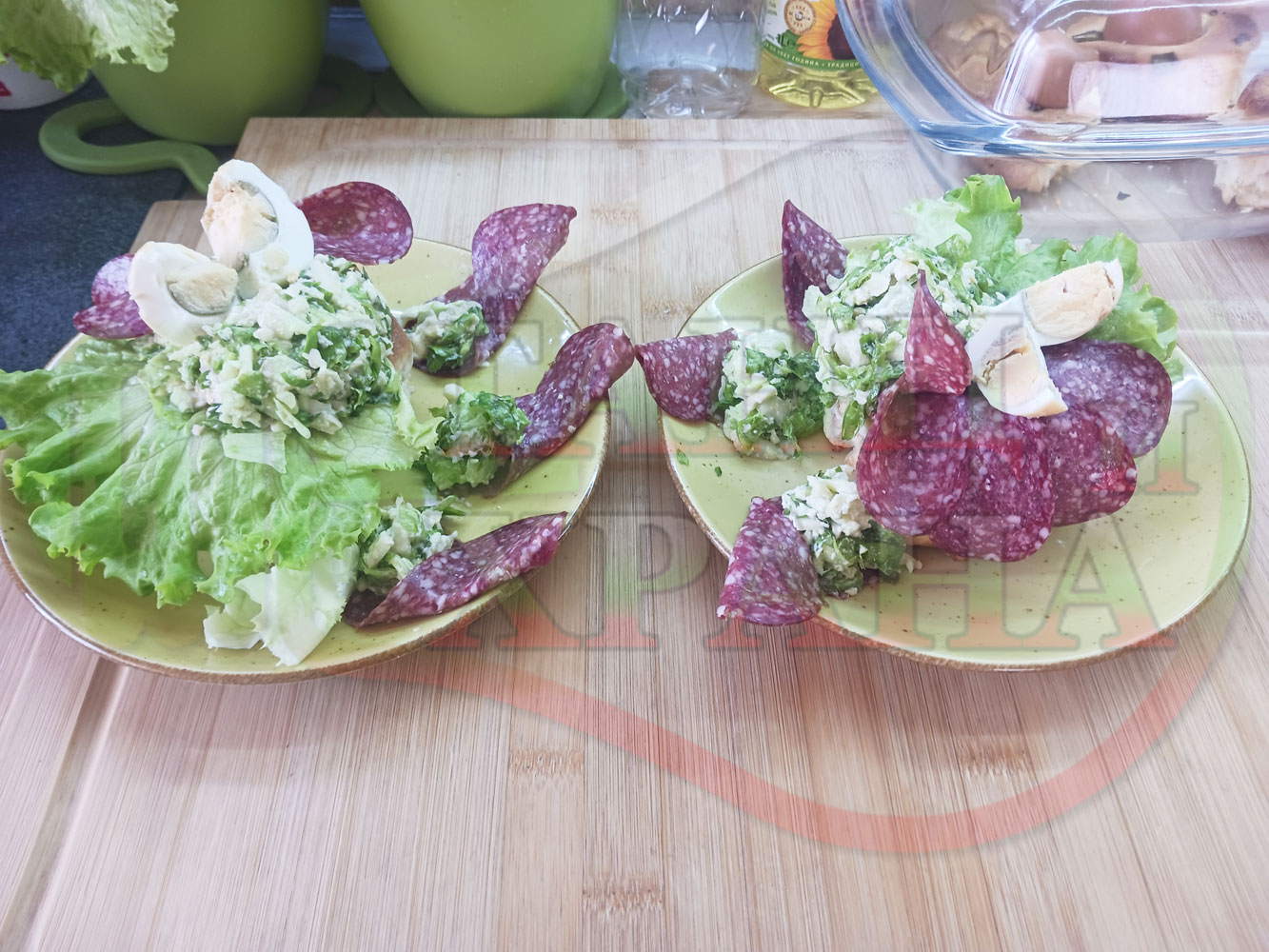 Приготвих кашкаваления крем със свежа маруля, яйце от коколниците, настърган на едро млечен кашкавал и майонеза. Гарнирах българските коколнишки сандвичи с панагюрска луканка и яйце.