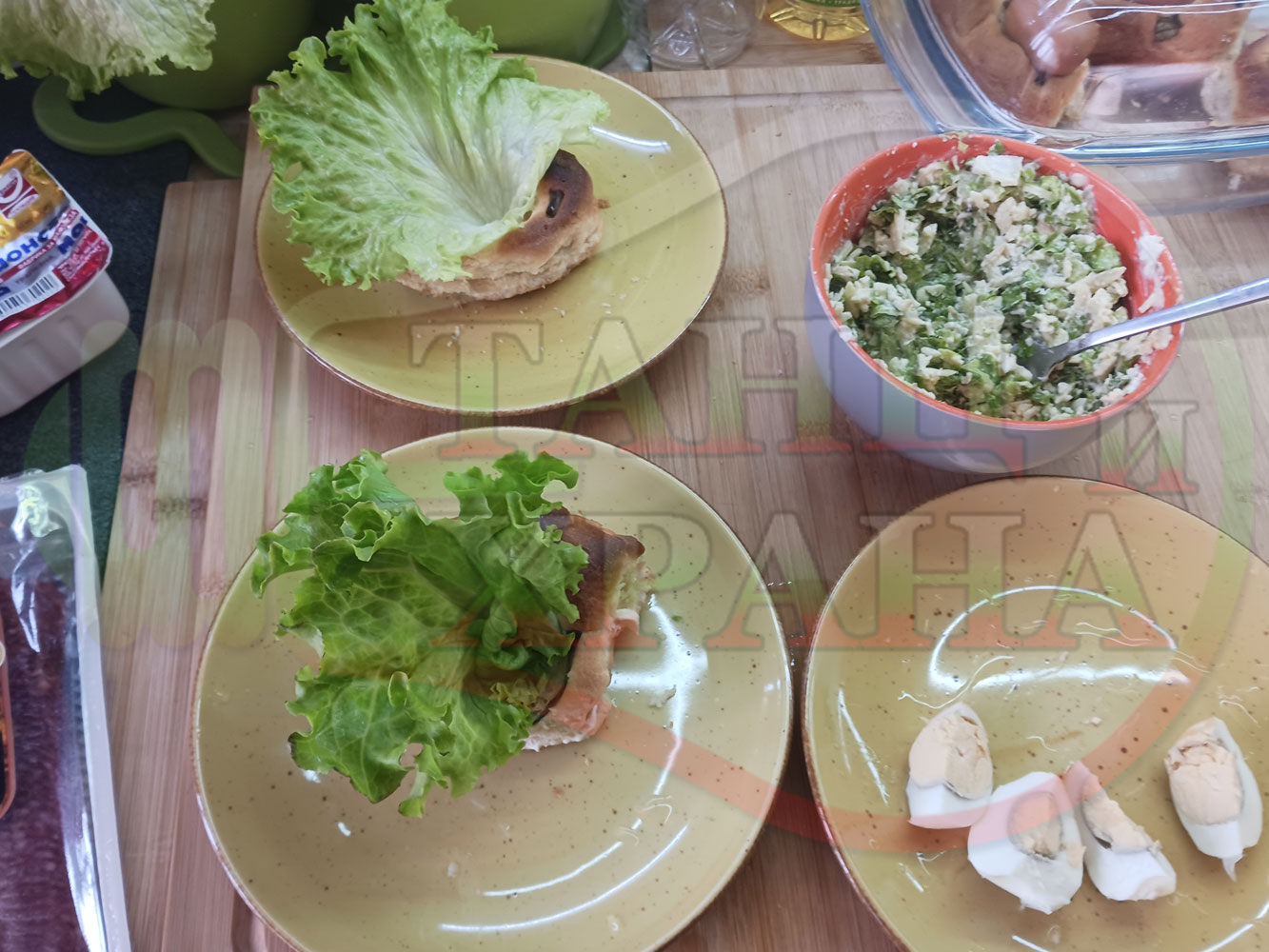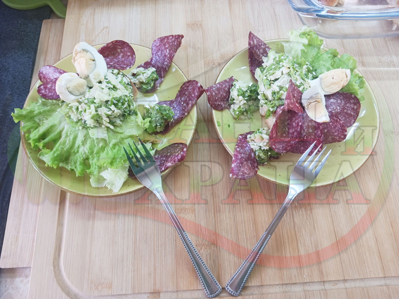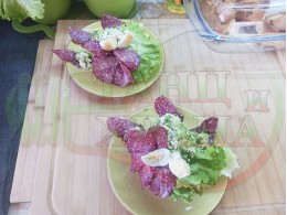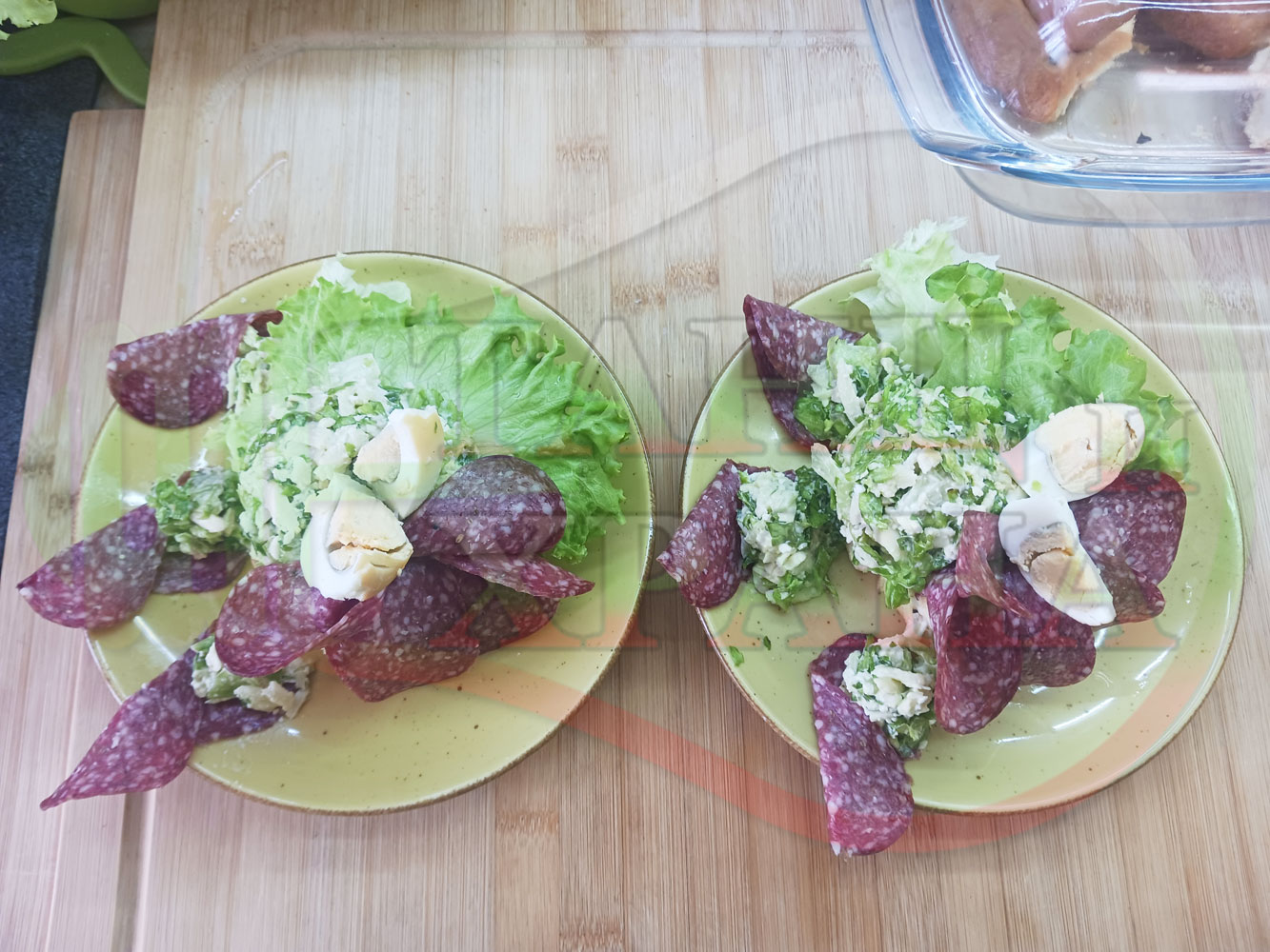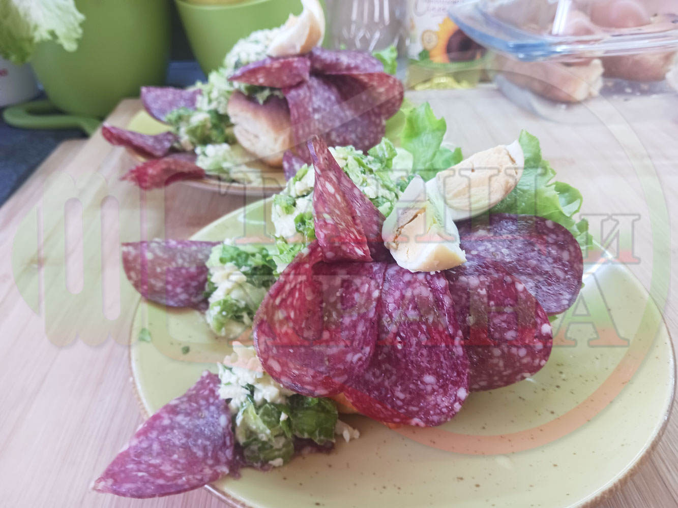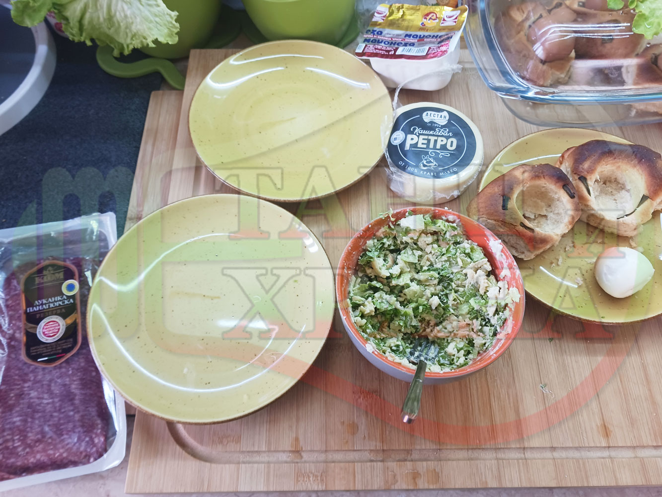 Приготвих кашкаваления крем със свежа маруля, яйце от коколниците, настърган на едро млечен кашкавал и майонеза. Гарнирах българските коколнишки сандвичи с панагюрска луканка и яйце.