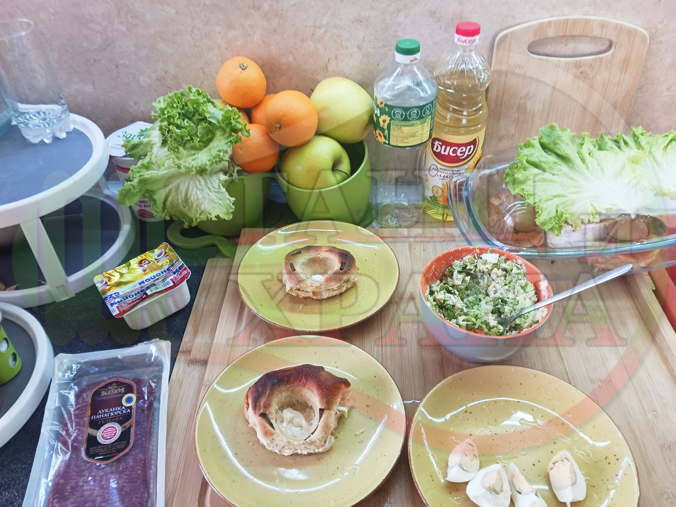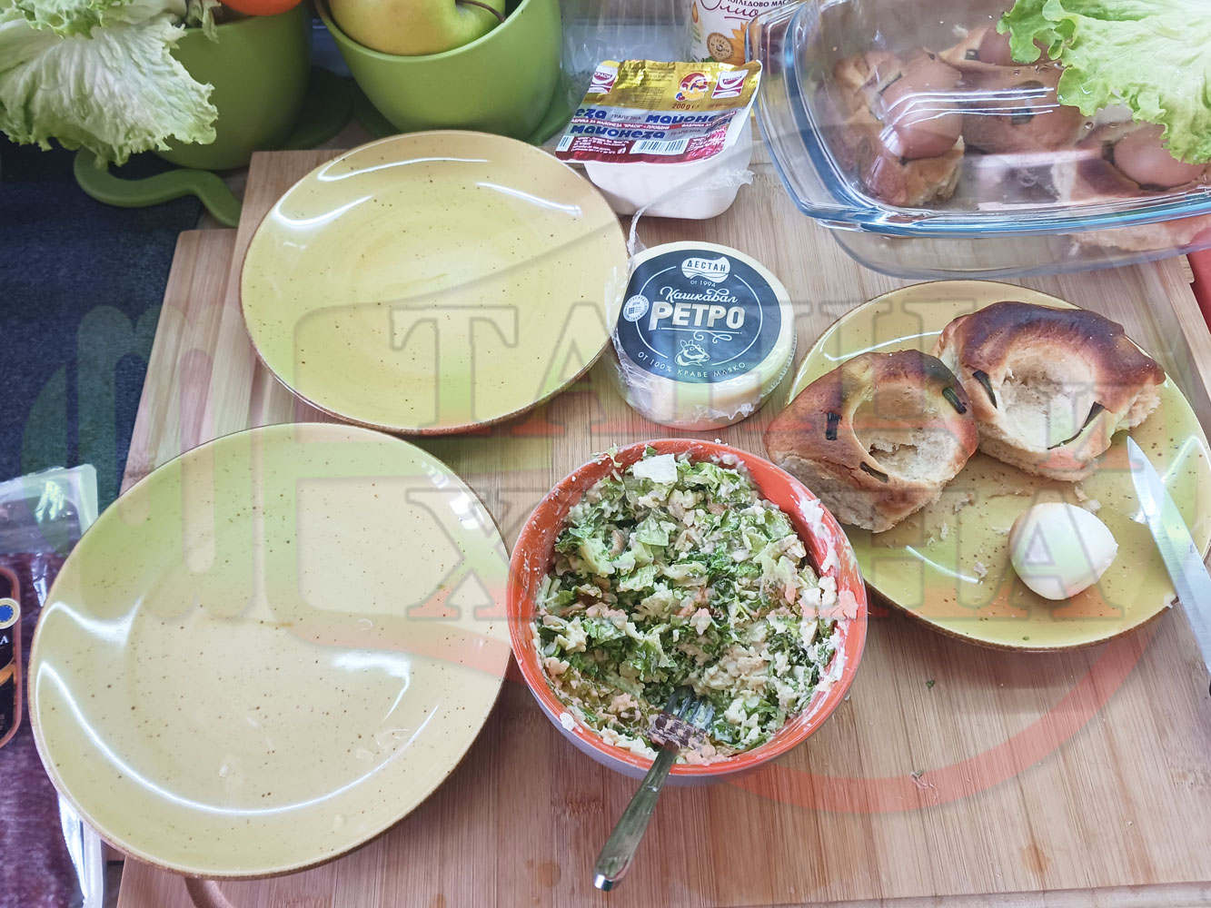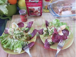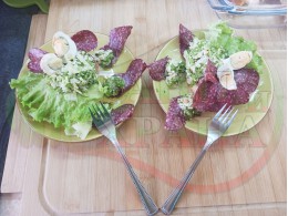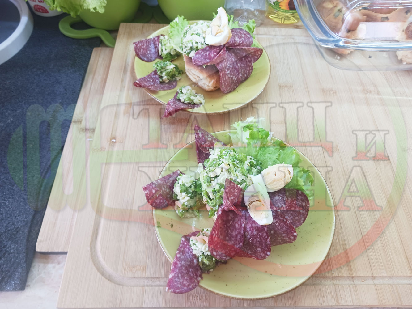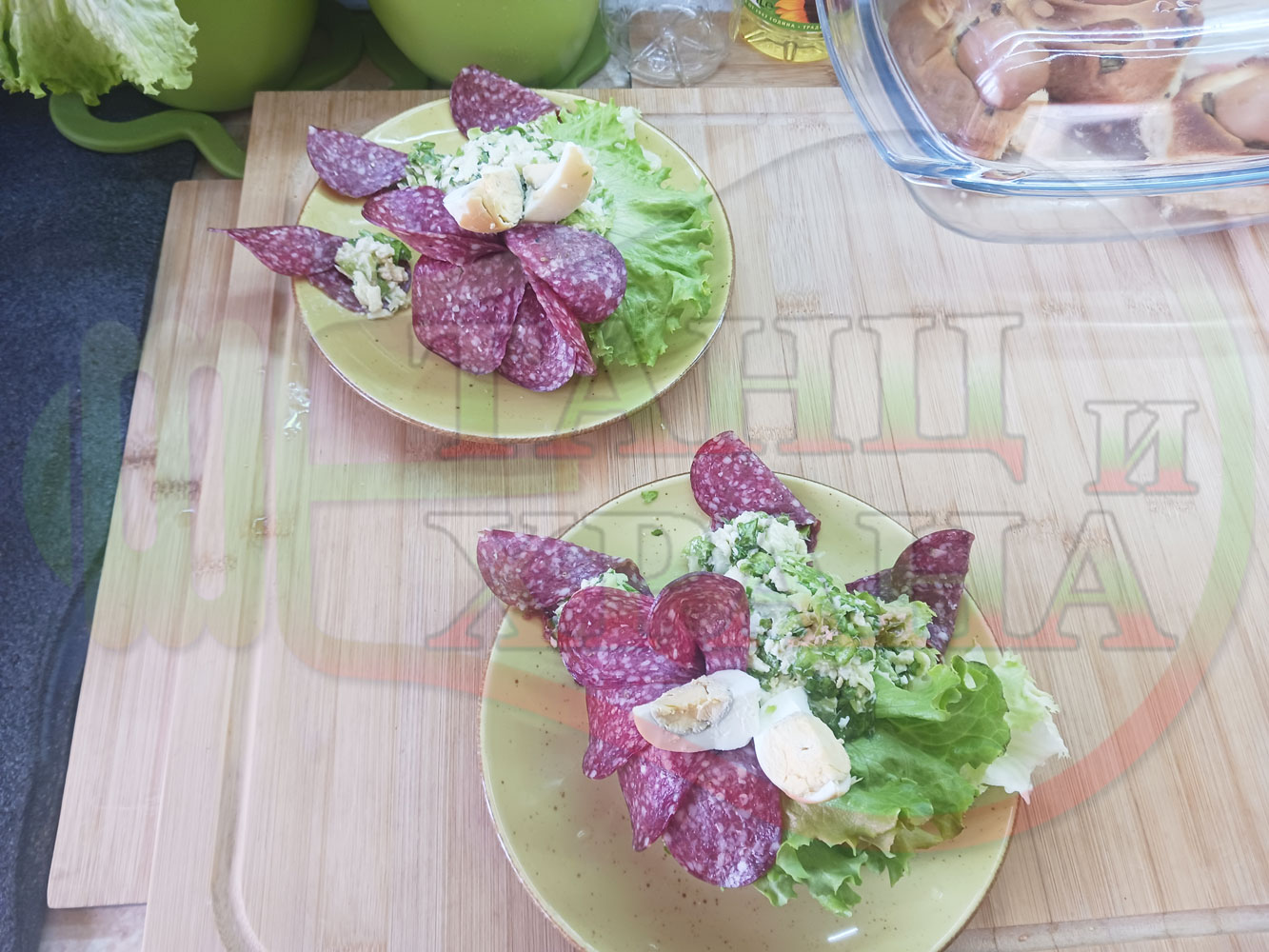 Приготвих кашкаваления крем със свежа маруля, яйце от коколниците, настърган на едро млечен кашкавал и майонеза. Гарнирах българските коколнишки сандвичи с панагюрска луканка и яйце.