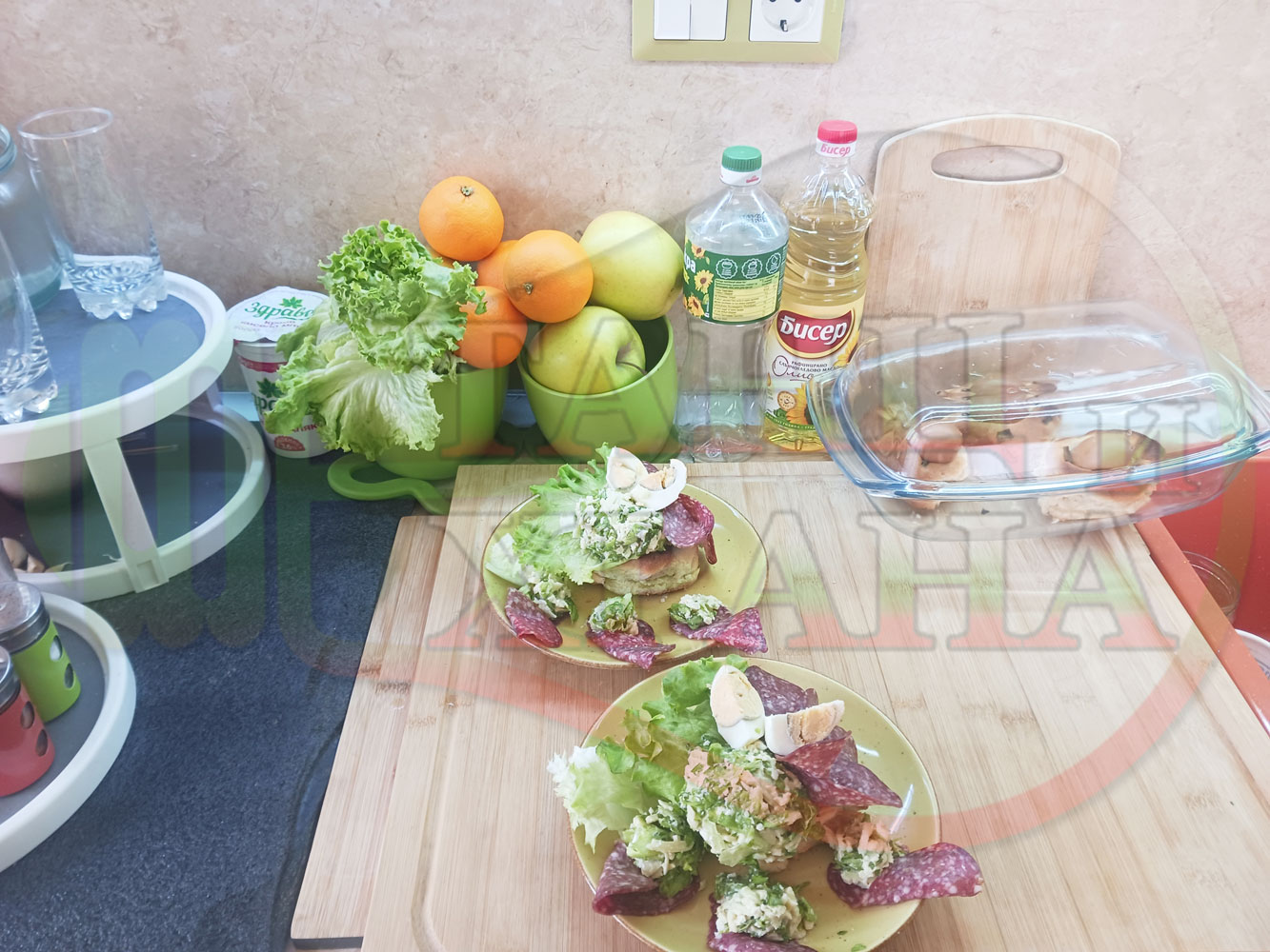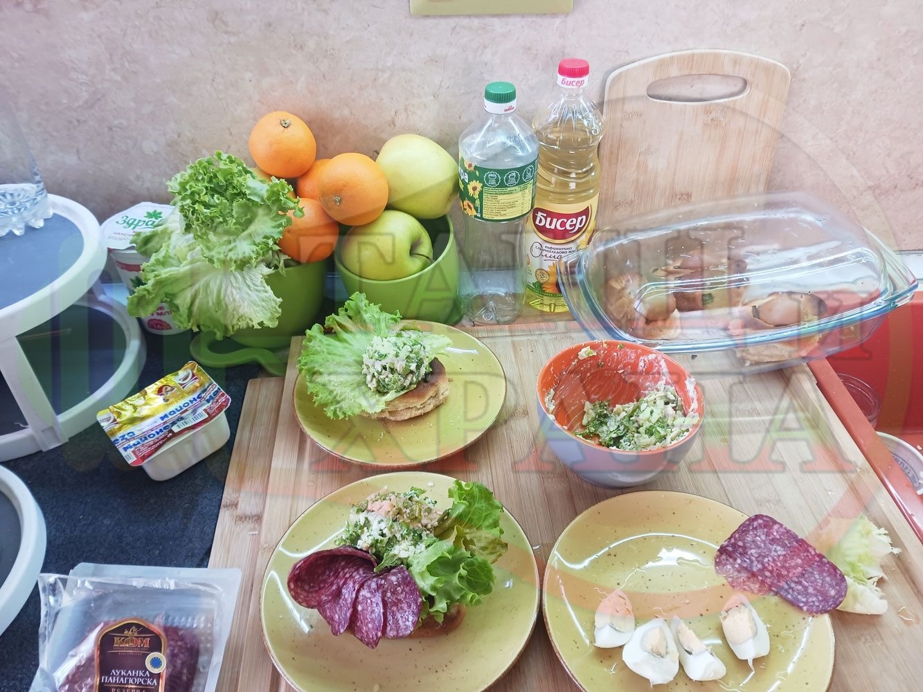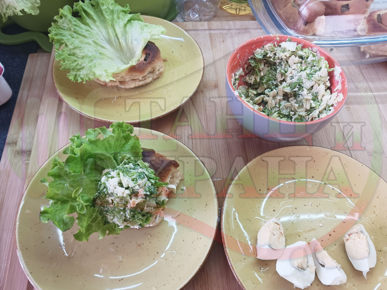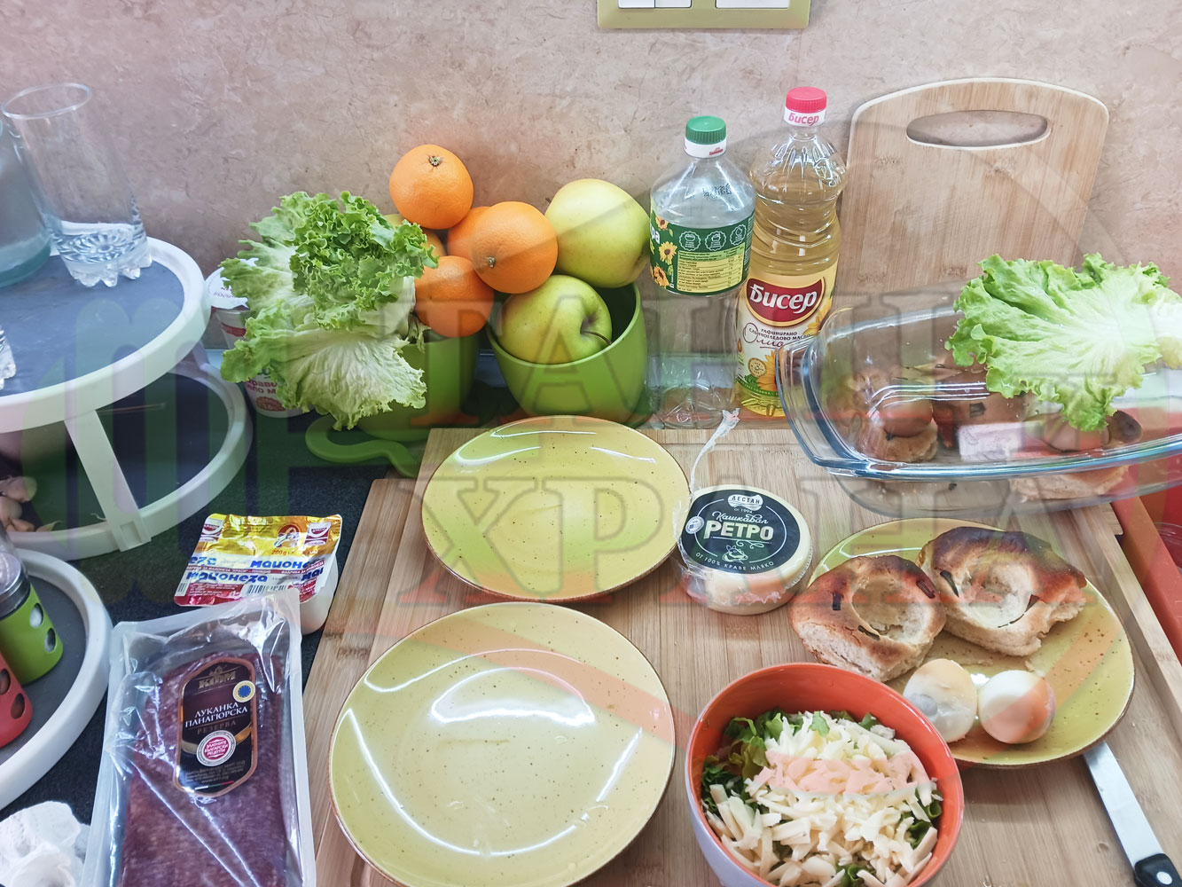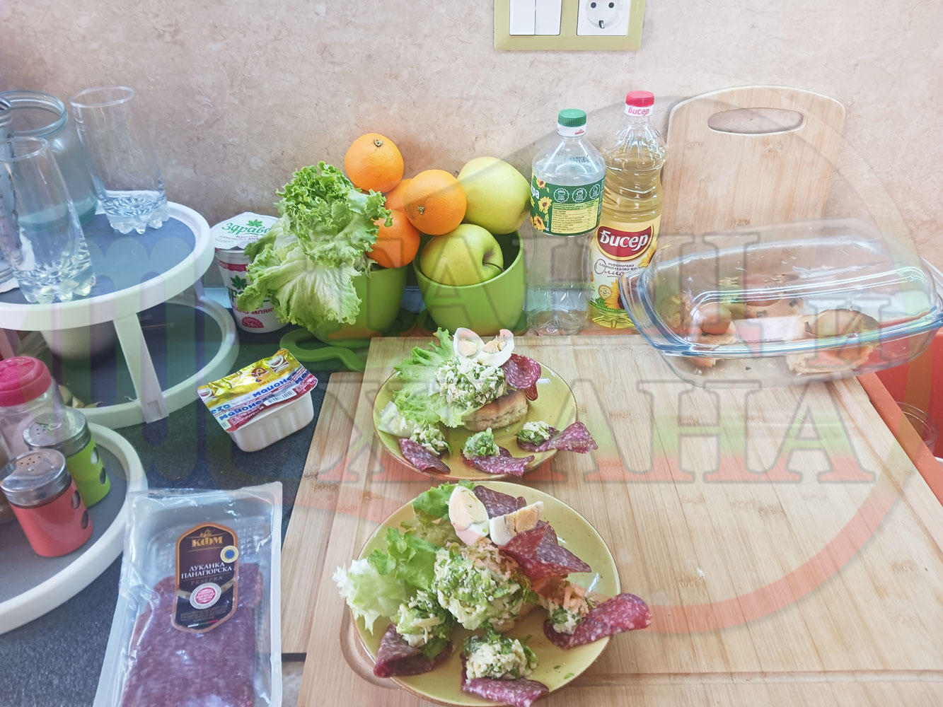 Приготвих кашкаваления крем със свежа маруля, яйце от коколниците, настърган на едро млечен кашкавал и майонеза. Гарнирах българските коколнишки сандвичи с панагюрска луканка и яйце.
