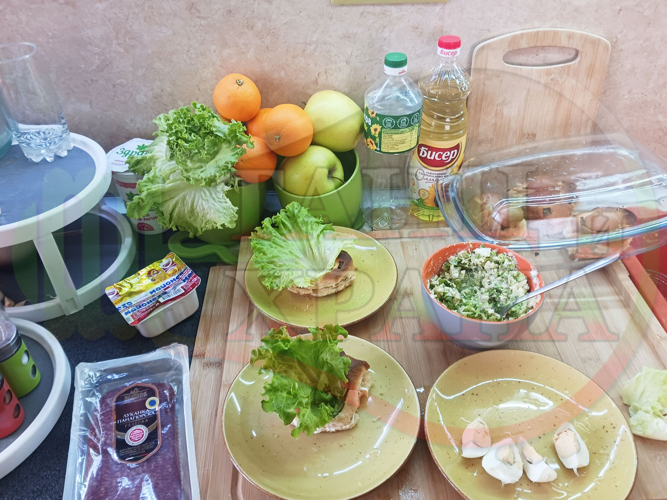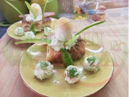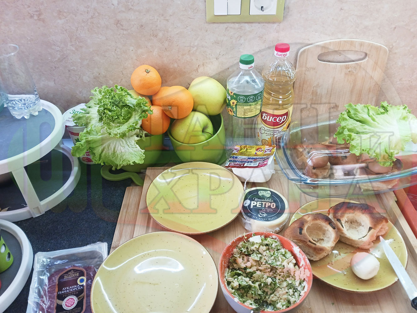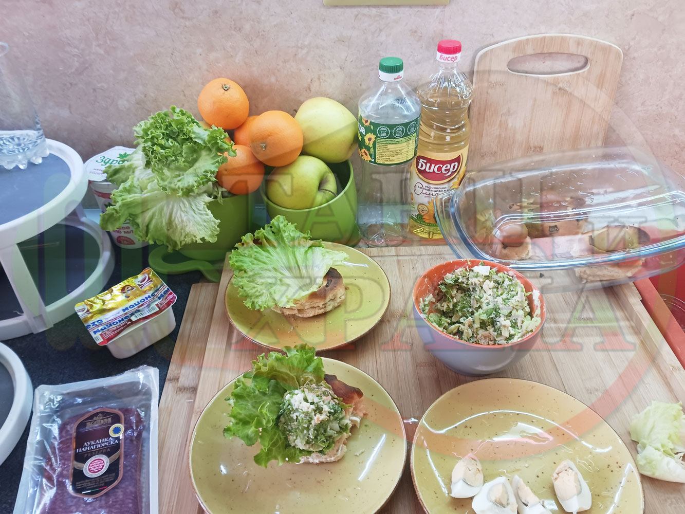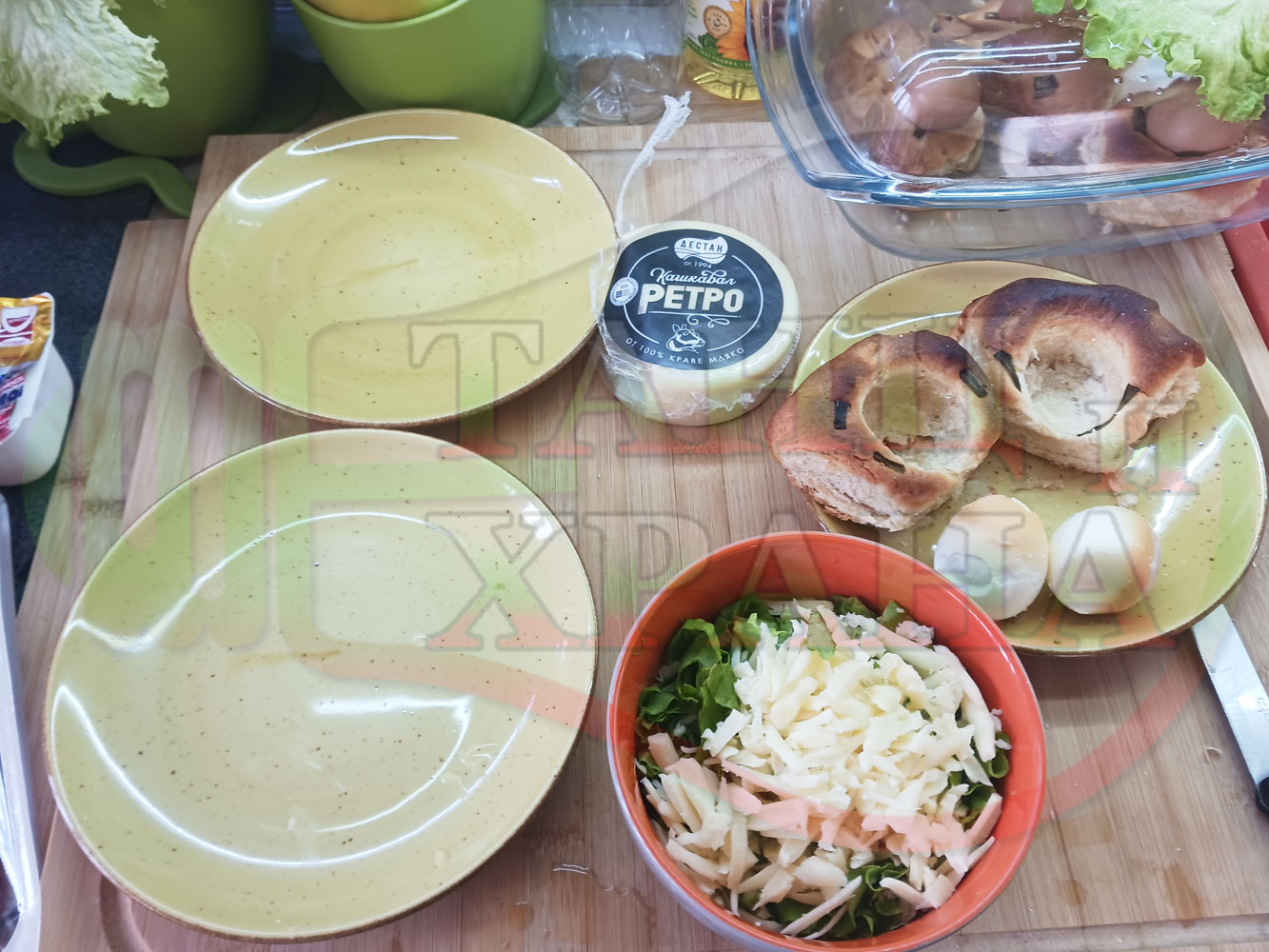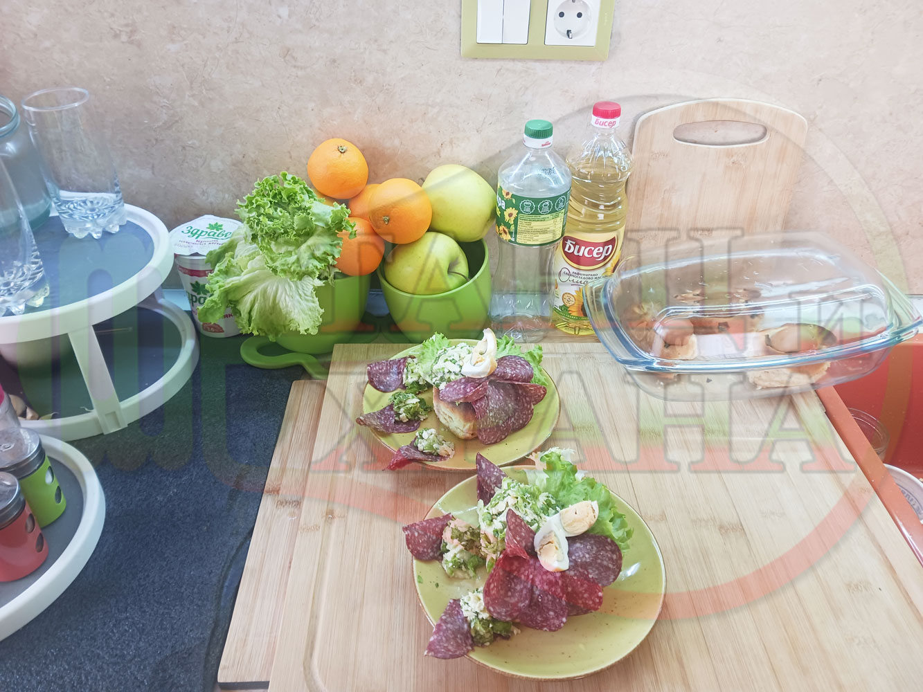 Приготвих кашкаваления крем със свежа маруля, яйце от коколниците, настърган на едро млечен кашкавал и майонеза. Гарнирах българските коколнишки сандвичи с панагюрска луканка и яйце.