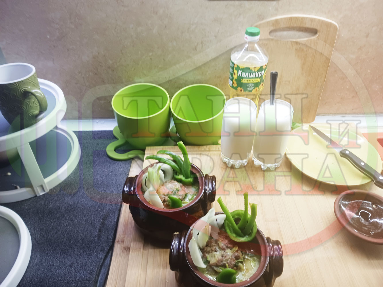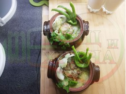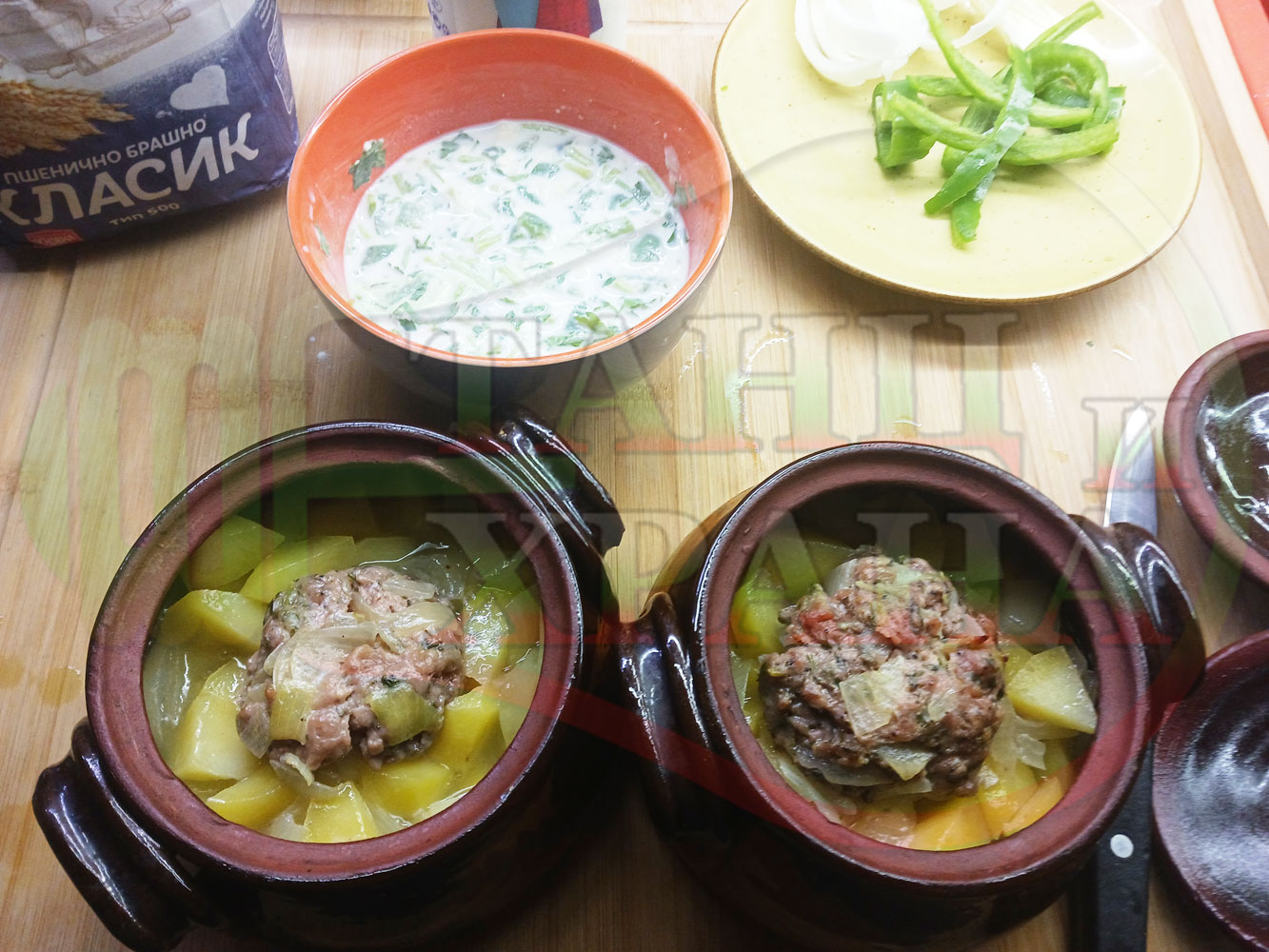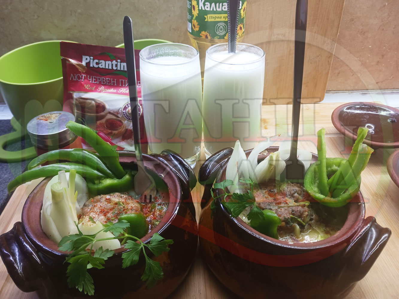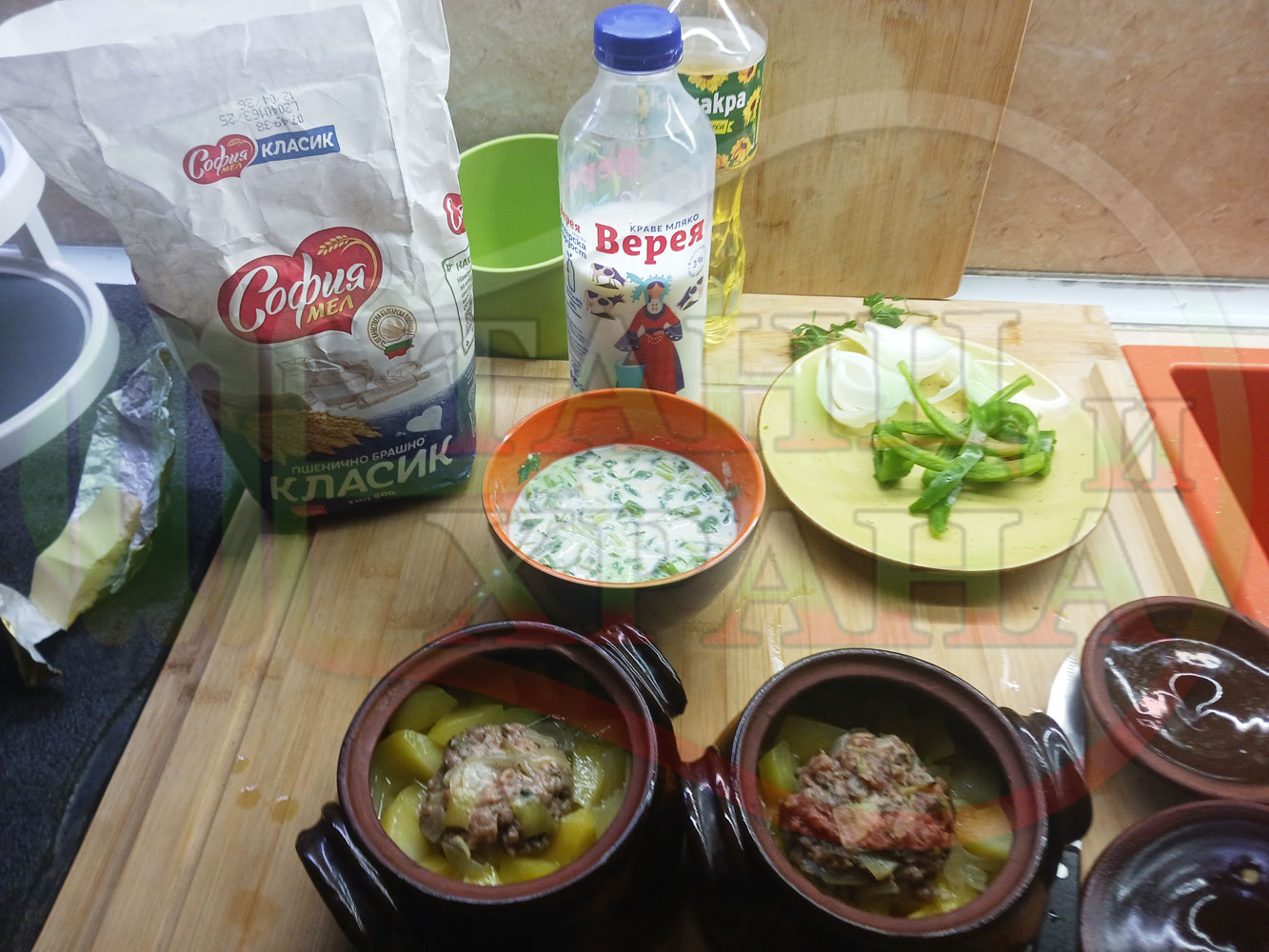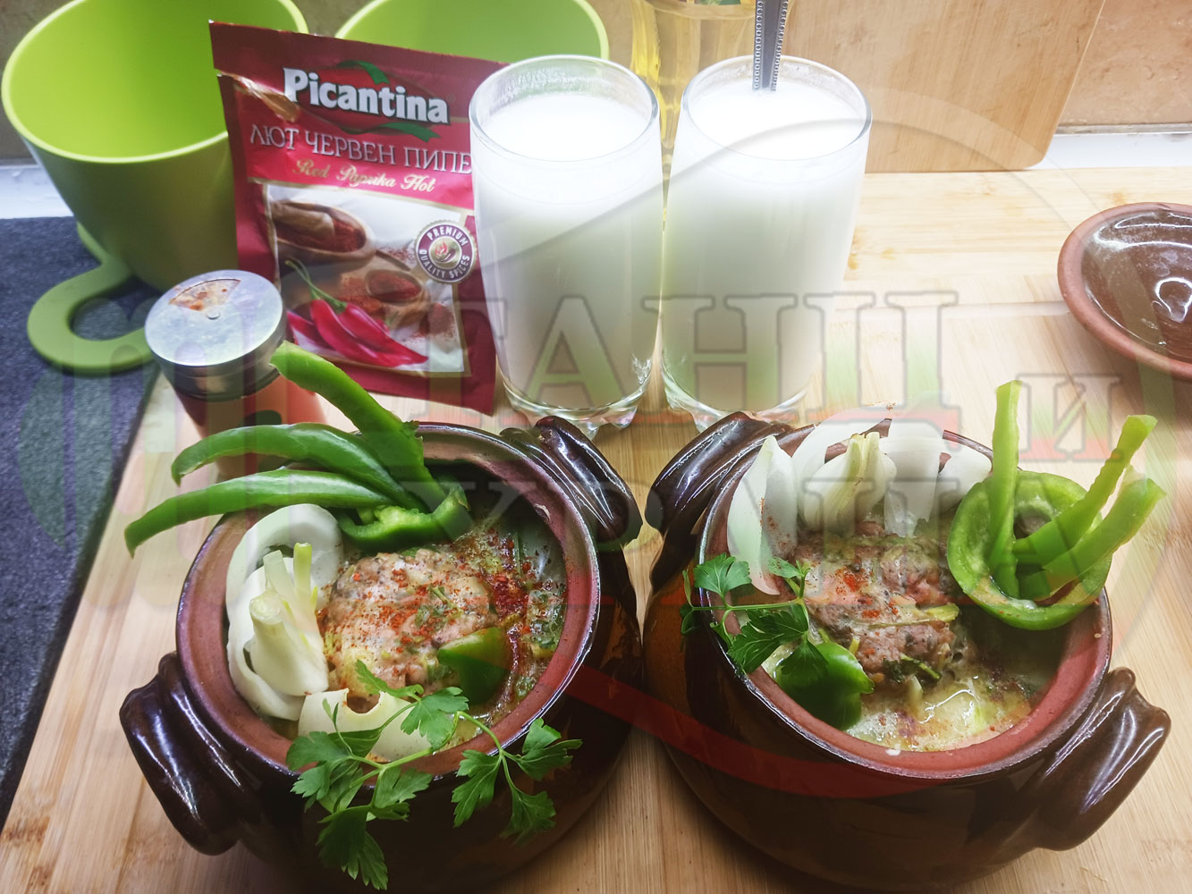 Гювечета с кюфтета "Каймяни картофенолучени чушковопрясномлечни" приготвени от домашно овкусена кайма с ронена чубрица, черен пипер и магданоз запечени на фурна с картофи, кромид лук и млечен сос с прясно мляко, брашно, масло и зелени пресни чушки