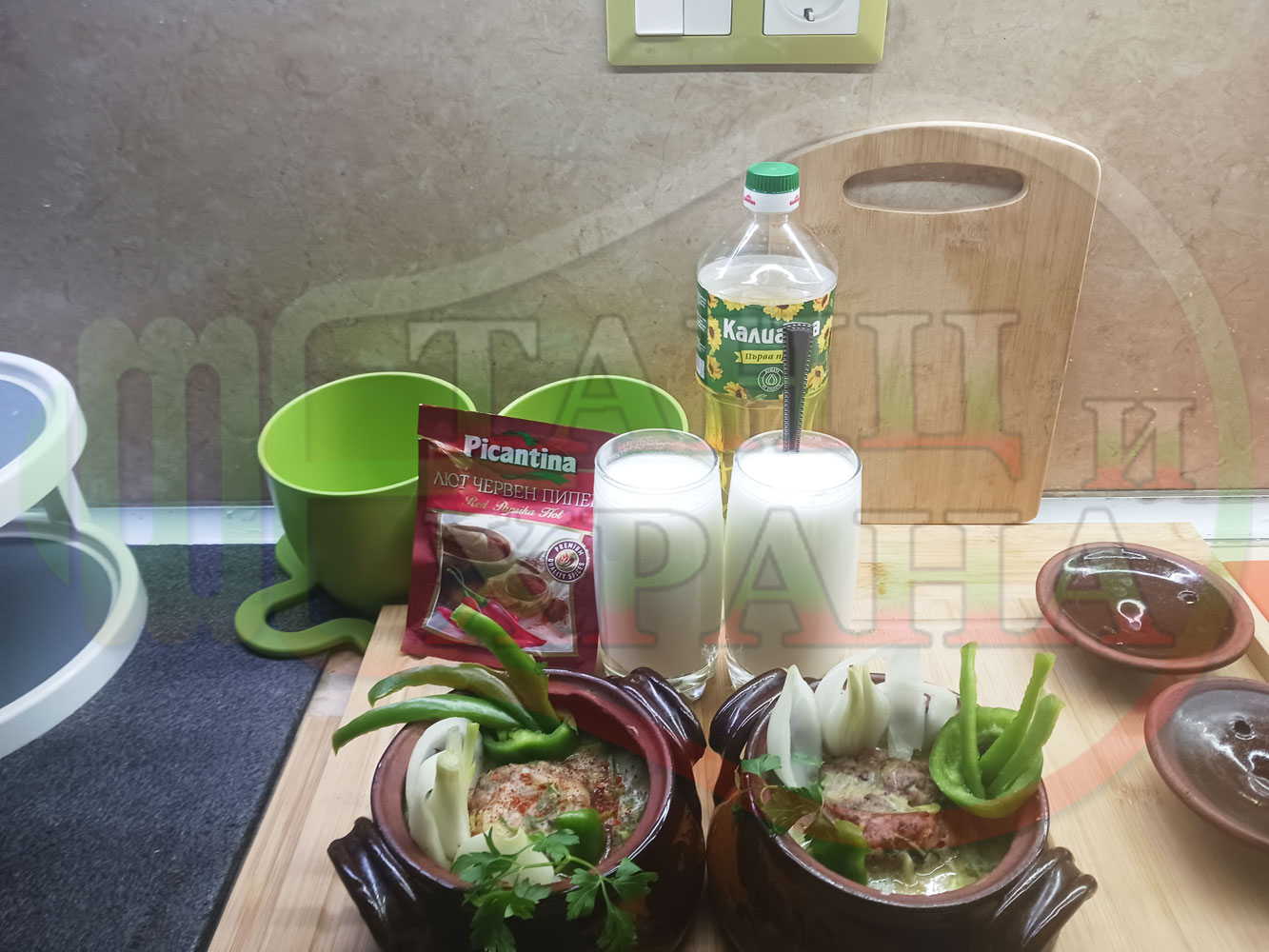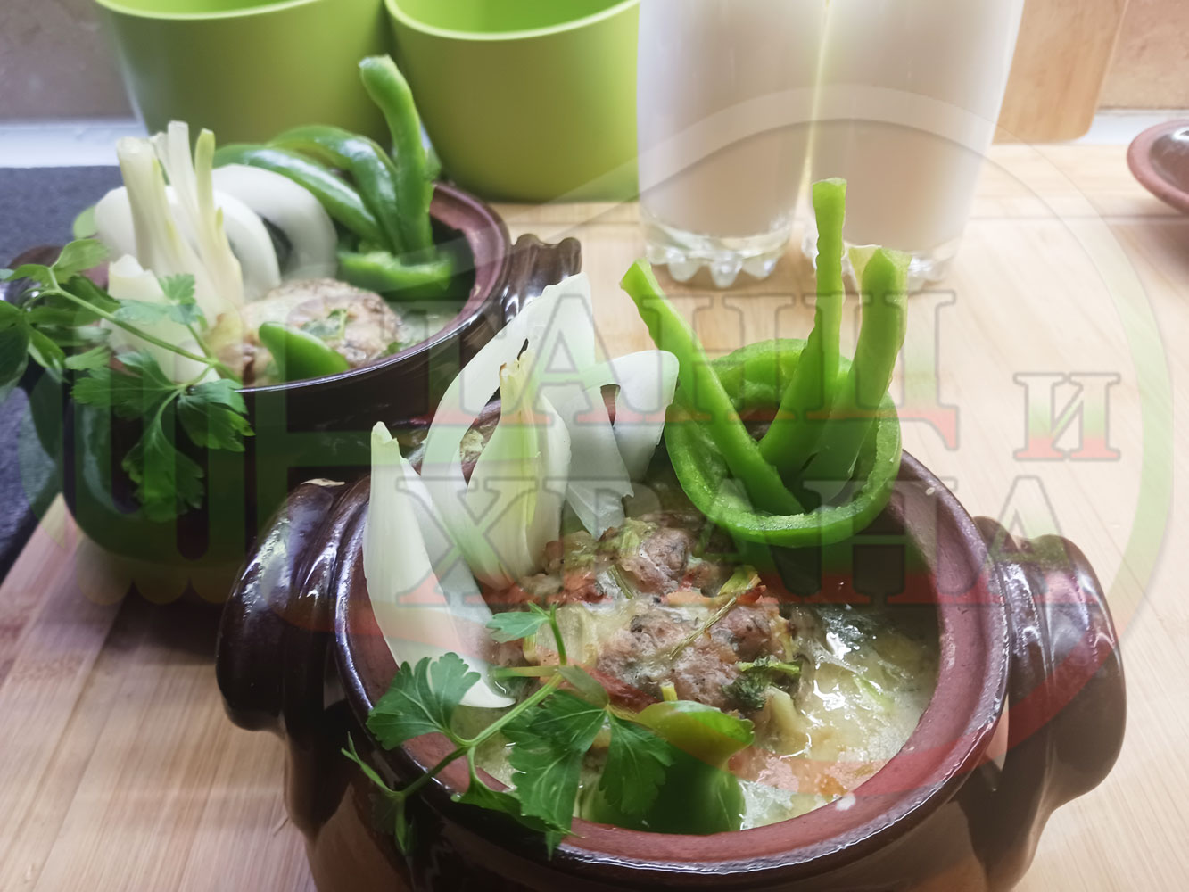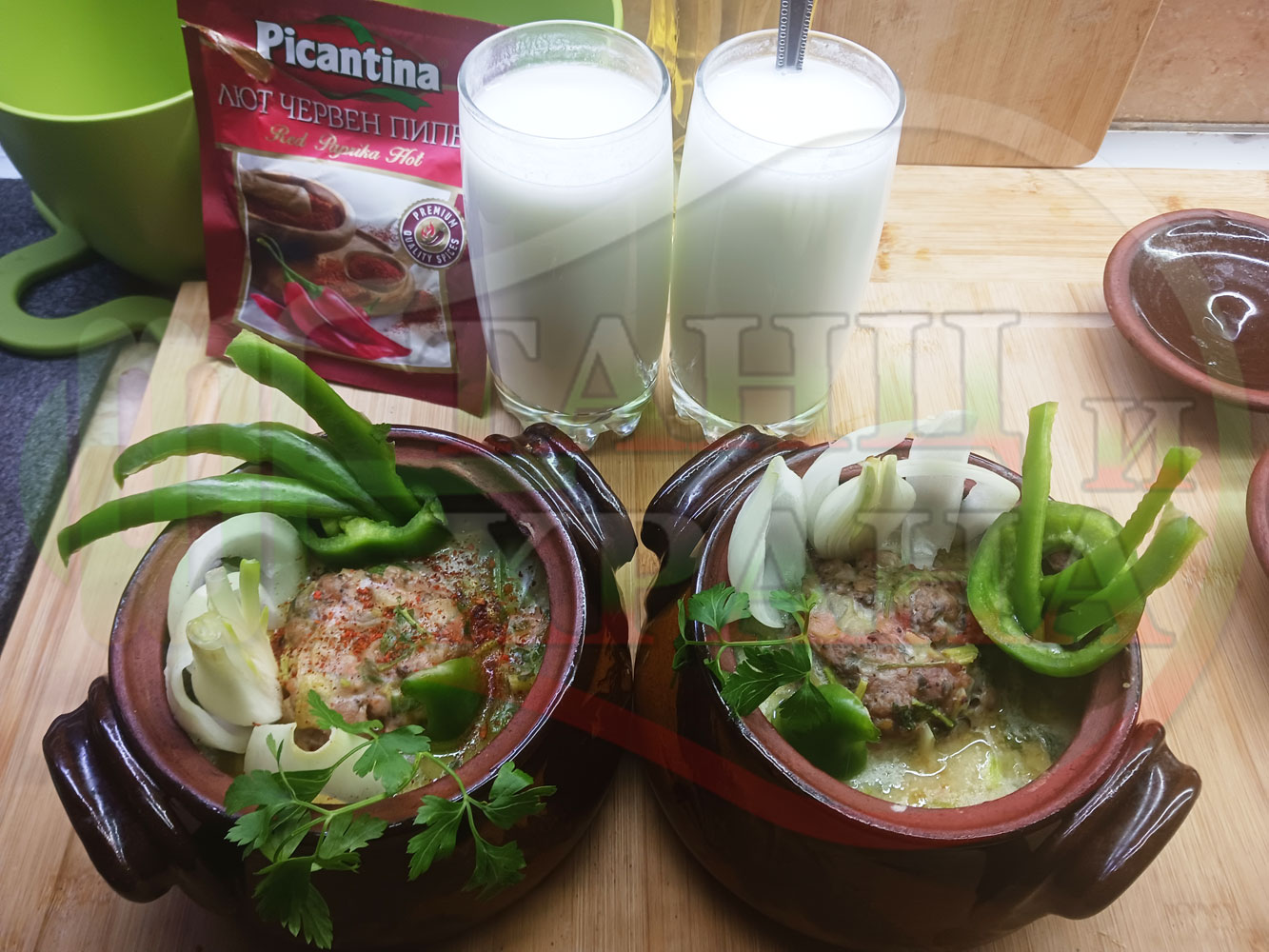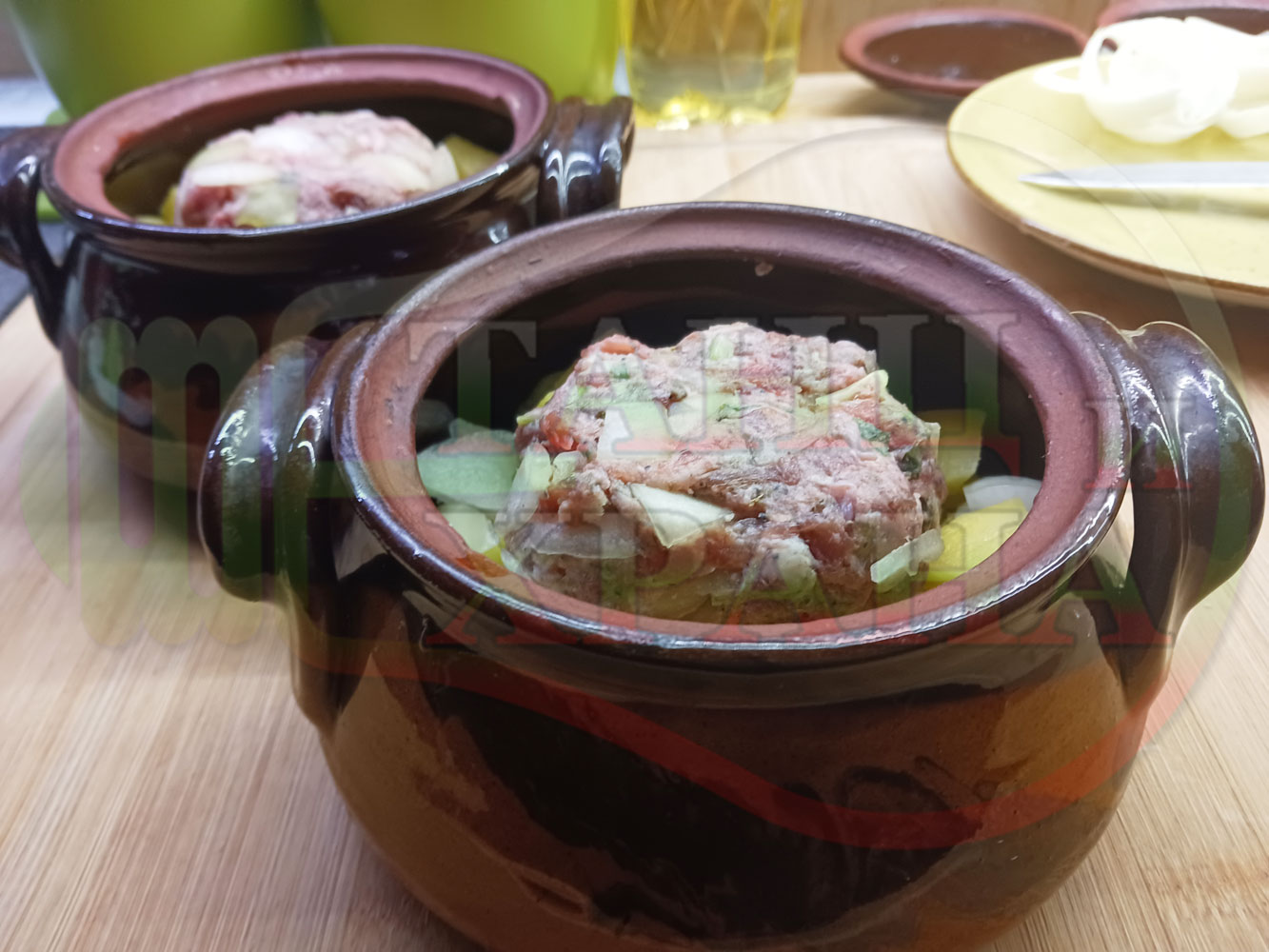 Гювечета с кюфтета "Каймяни картофенолучени чушковопрясномлечни" приготвени от домашно овкусена кайма с ронена чубрица, черен пипер и магданоз запечени на фурна с картофи, кромид лук и млечен сос с прясно мляко, брашно, масло и зелени пресни чушки