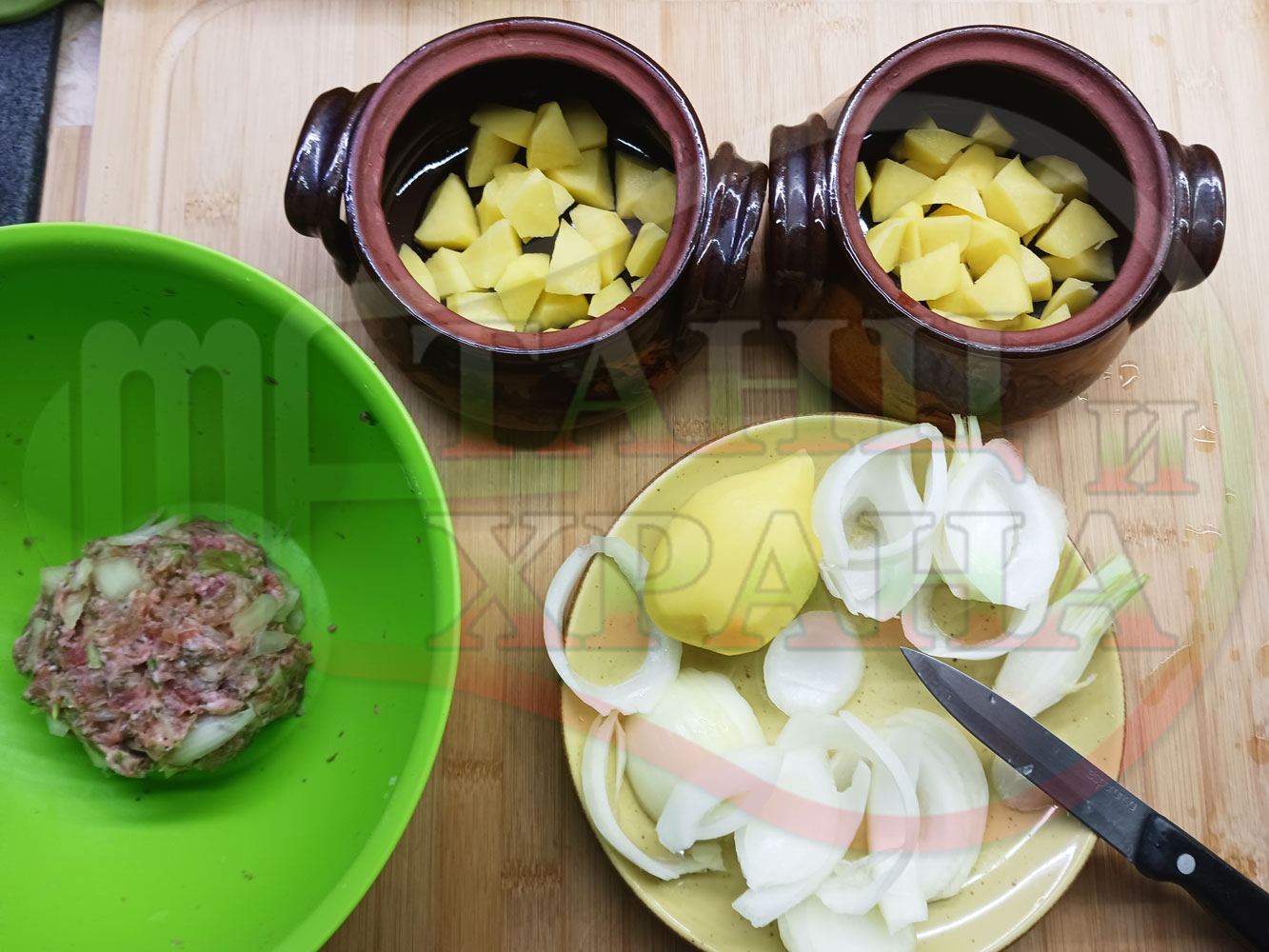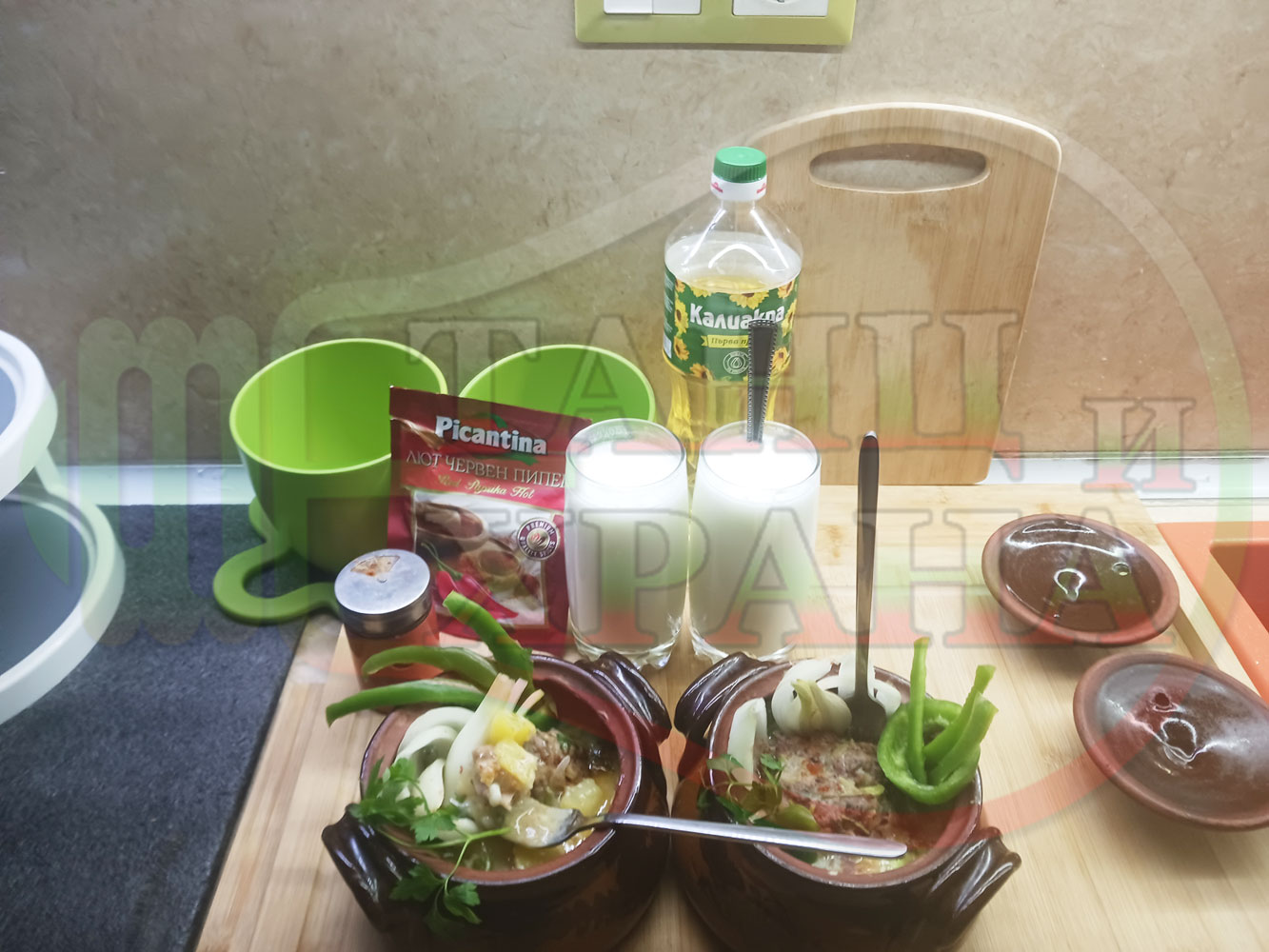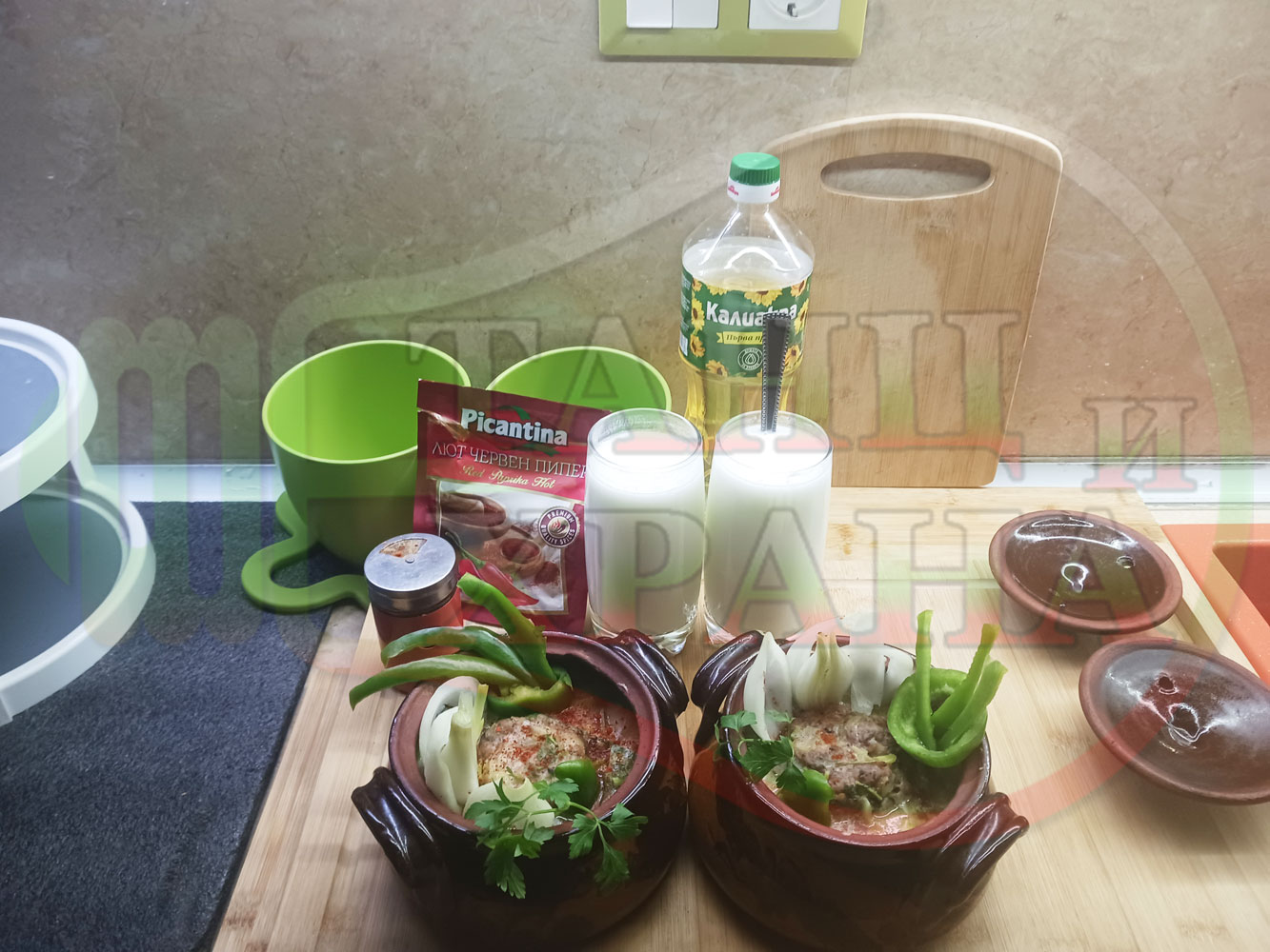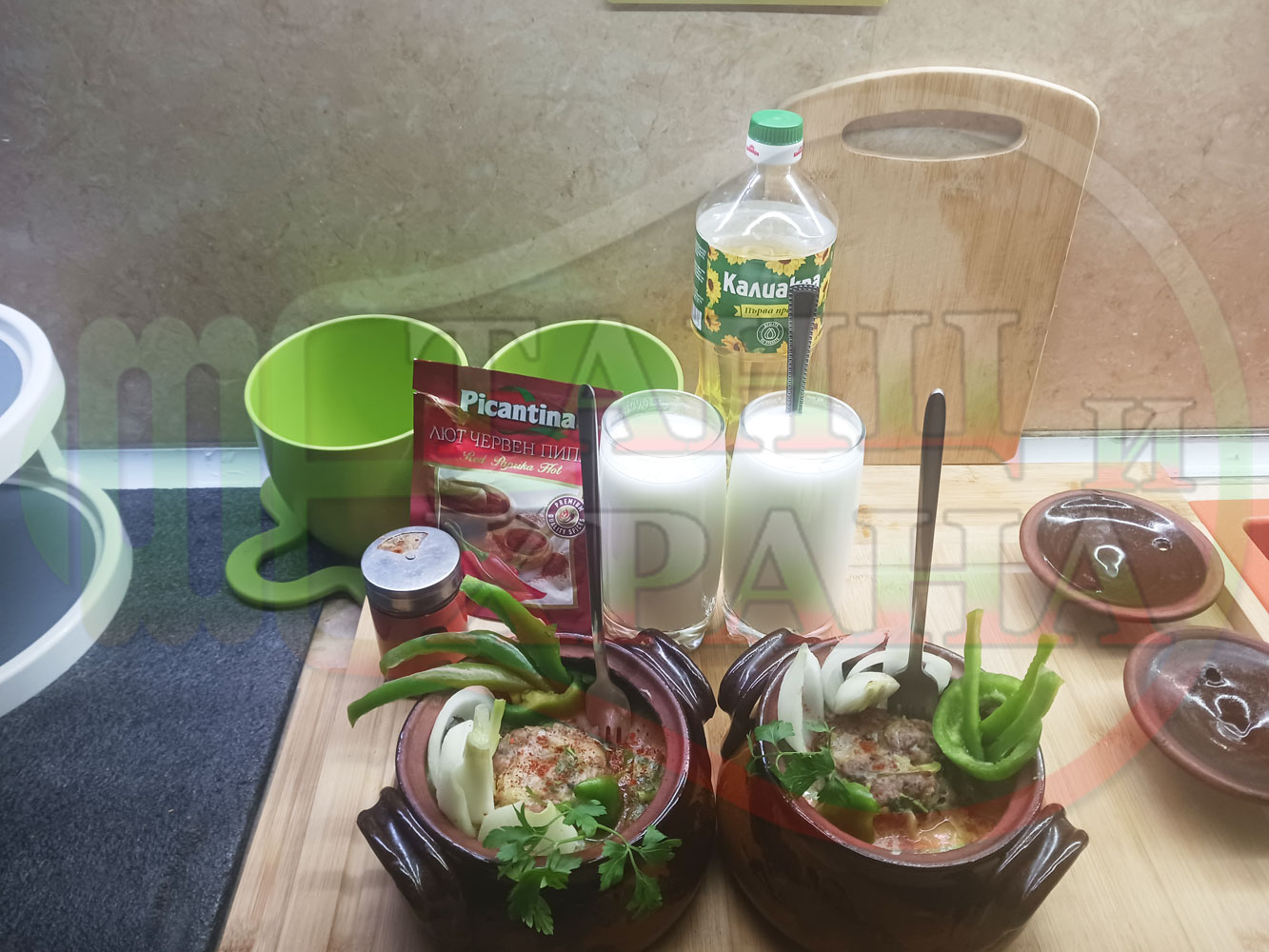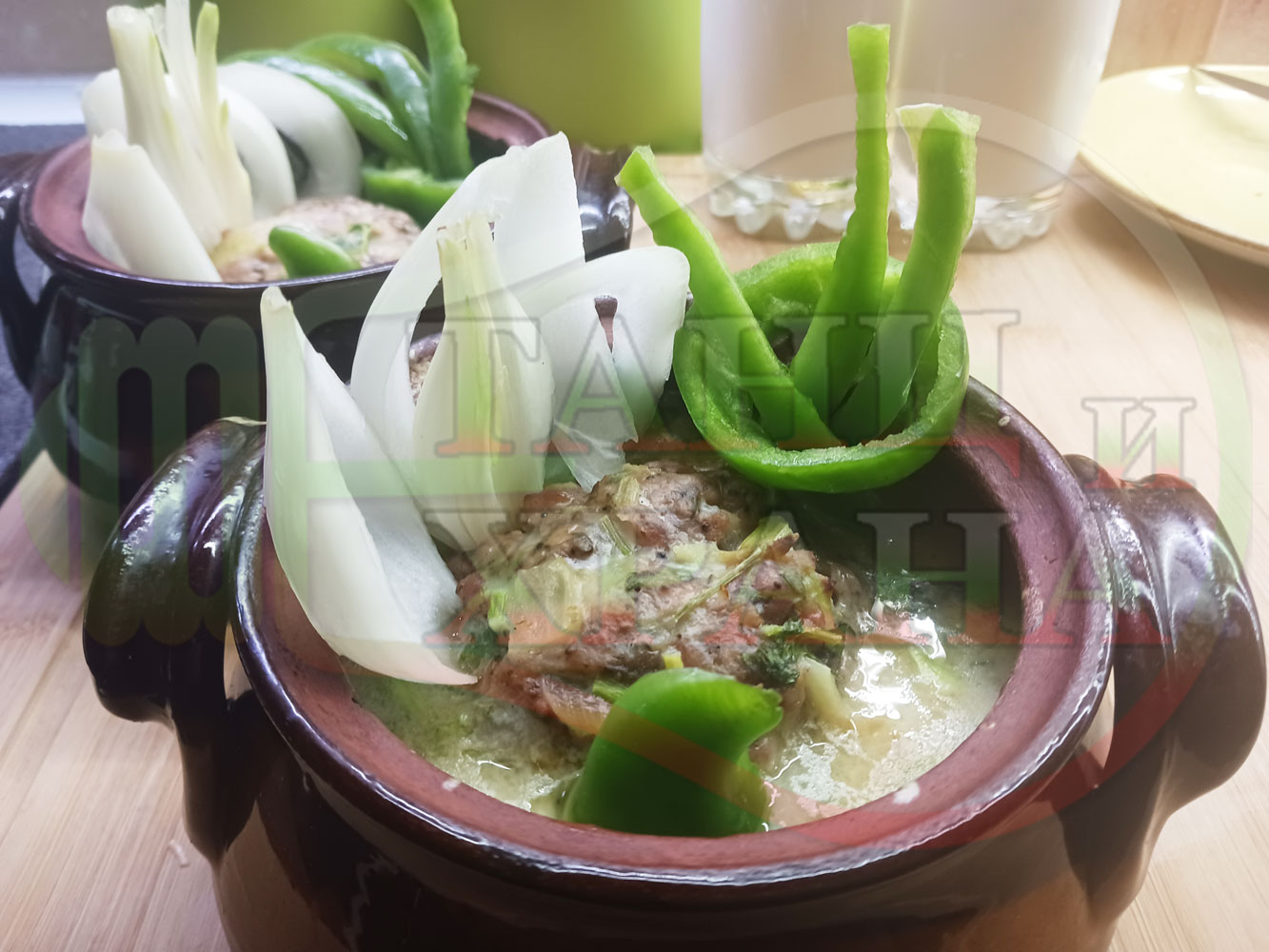 Гювечета с кюфтета "Каймяни картофенолучени чушковопрясномлечни" приготвени от домашно овкусена кайма с ронена чубрица, черен пипер и магданоз запечени на фурна с картофи, кромид лук и млечен сос с прясно мляко, брашно, масло и зелени пресни чушки