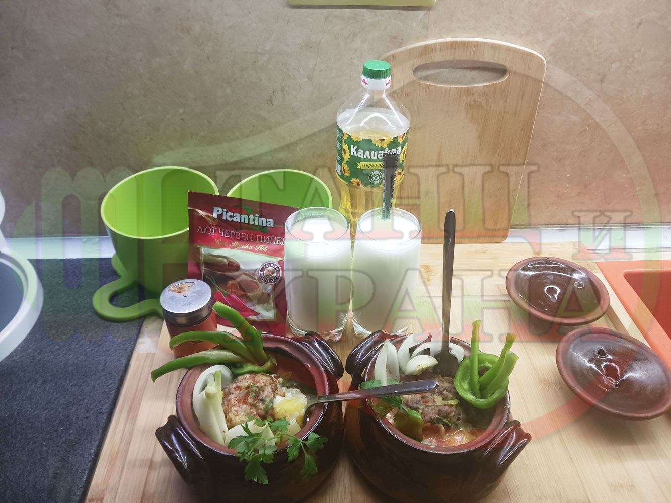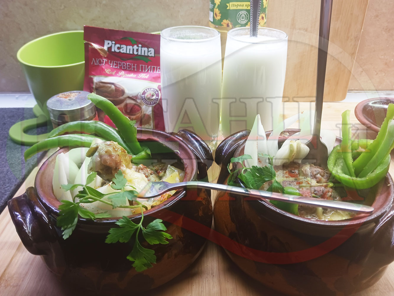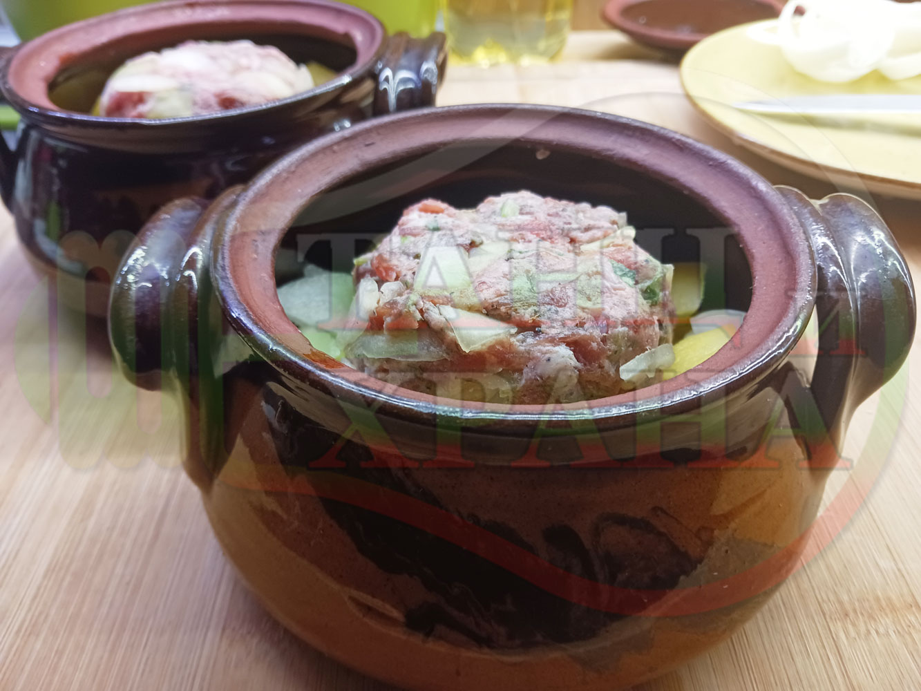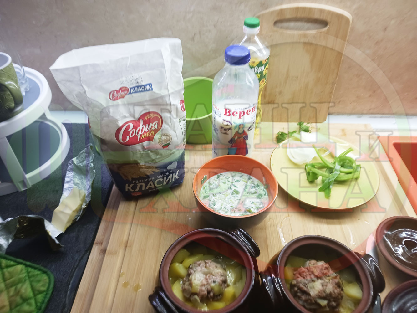 Гювечета с кюфтета "Каймяни картофенолучени чушковопрясномлечни" приготвени от домашно овкусена кайма с ронена чубрица, черен пипер и магданоз запечени на фурна с картофи, кромид лук и млечен сос с прясно мляко, брашно, масло и зелени пресни чушки