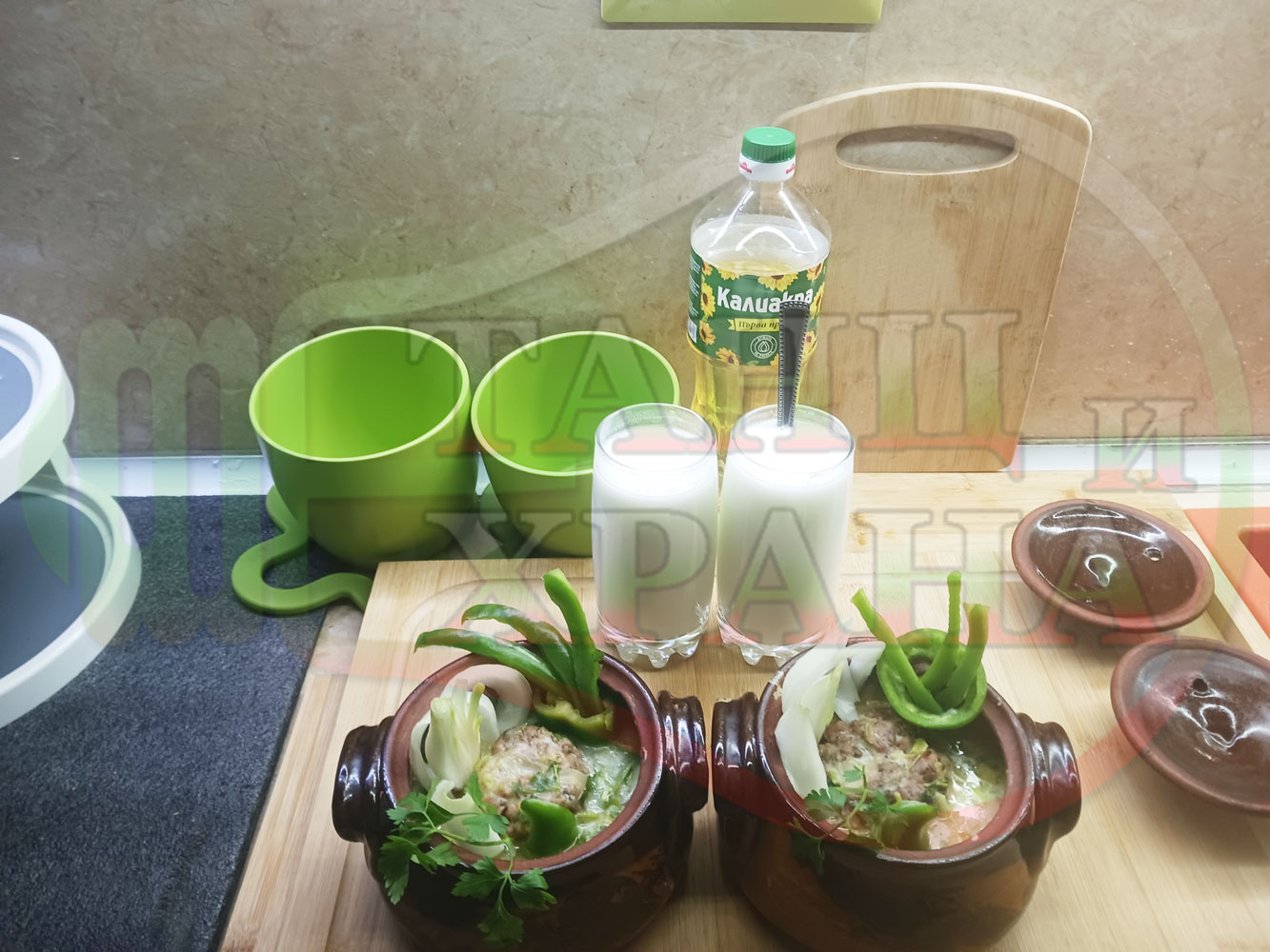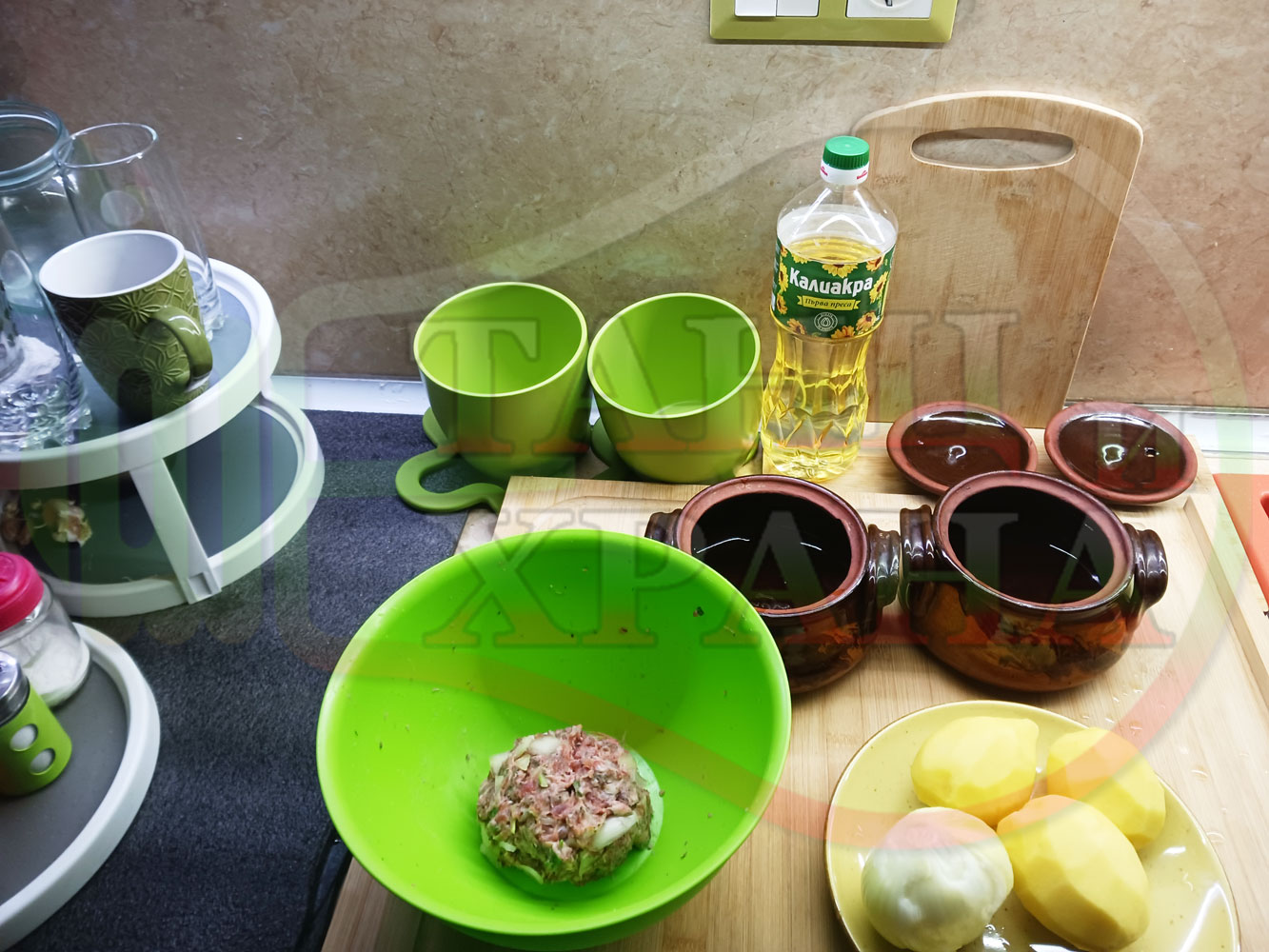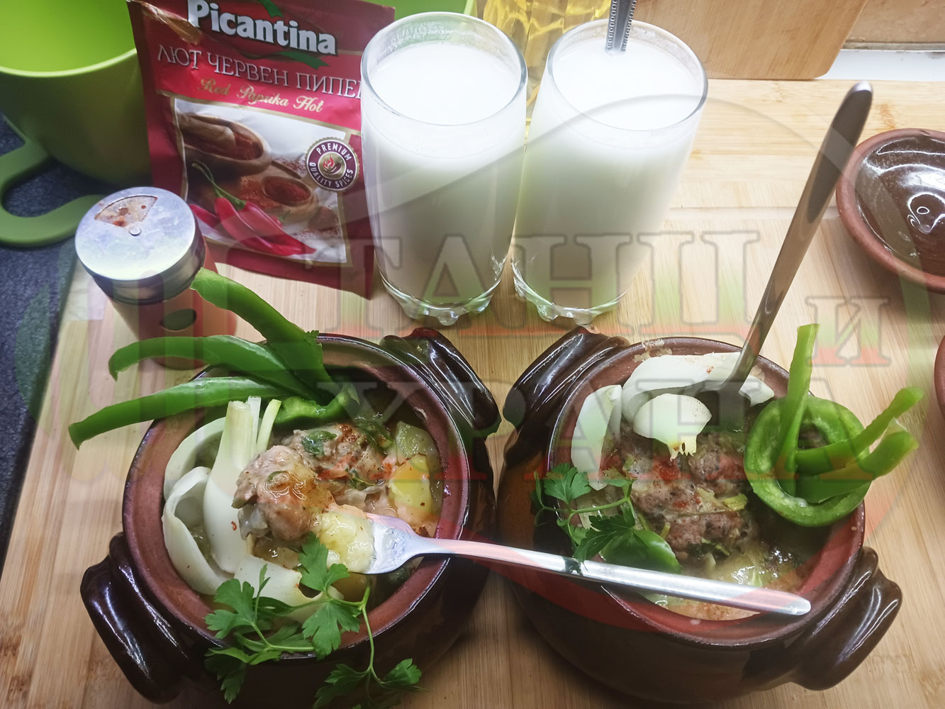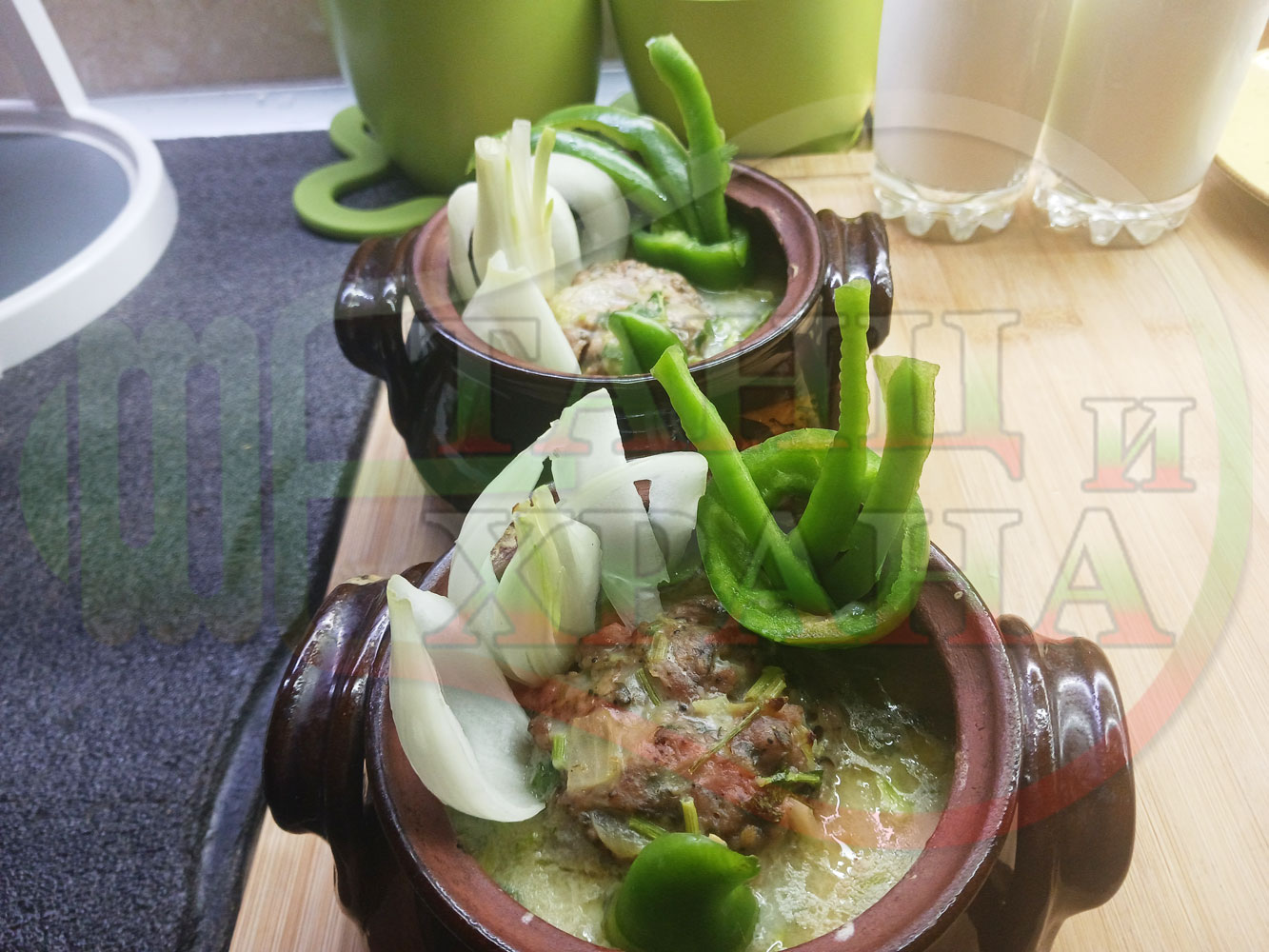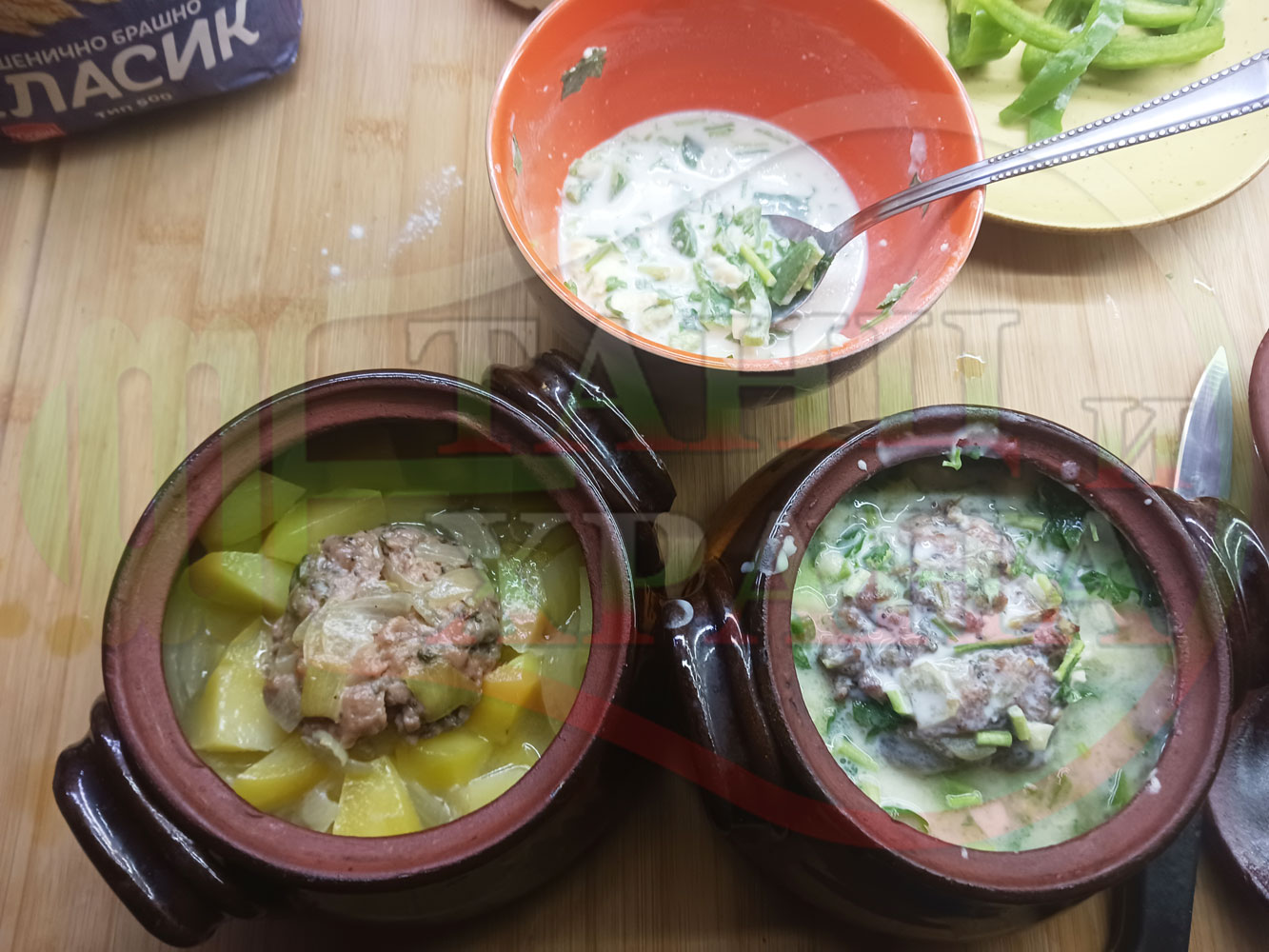 Гювечета с кюфтета "Каймяни картофенолучени чушковопрясномлечни" приготвени от домашно овкусена кайма с ронена чубрица, черен пипер и магданоз запечени на фурна с картофи, кромид лук и млечен сос с прясно мляко, брашно, масло и зелени пресни чушки
