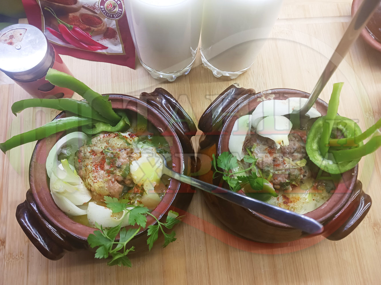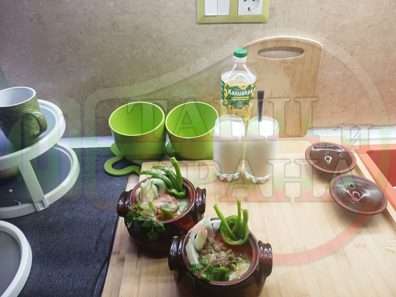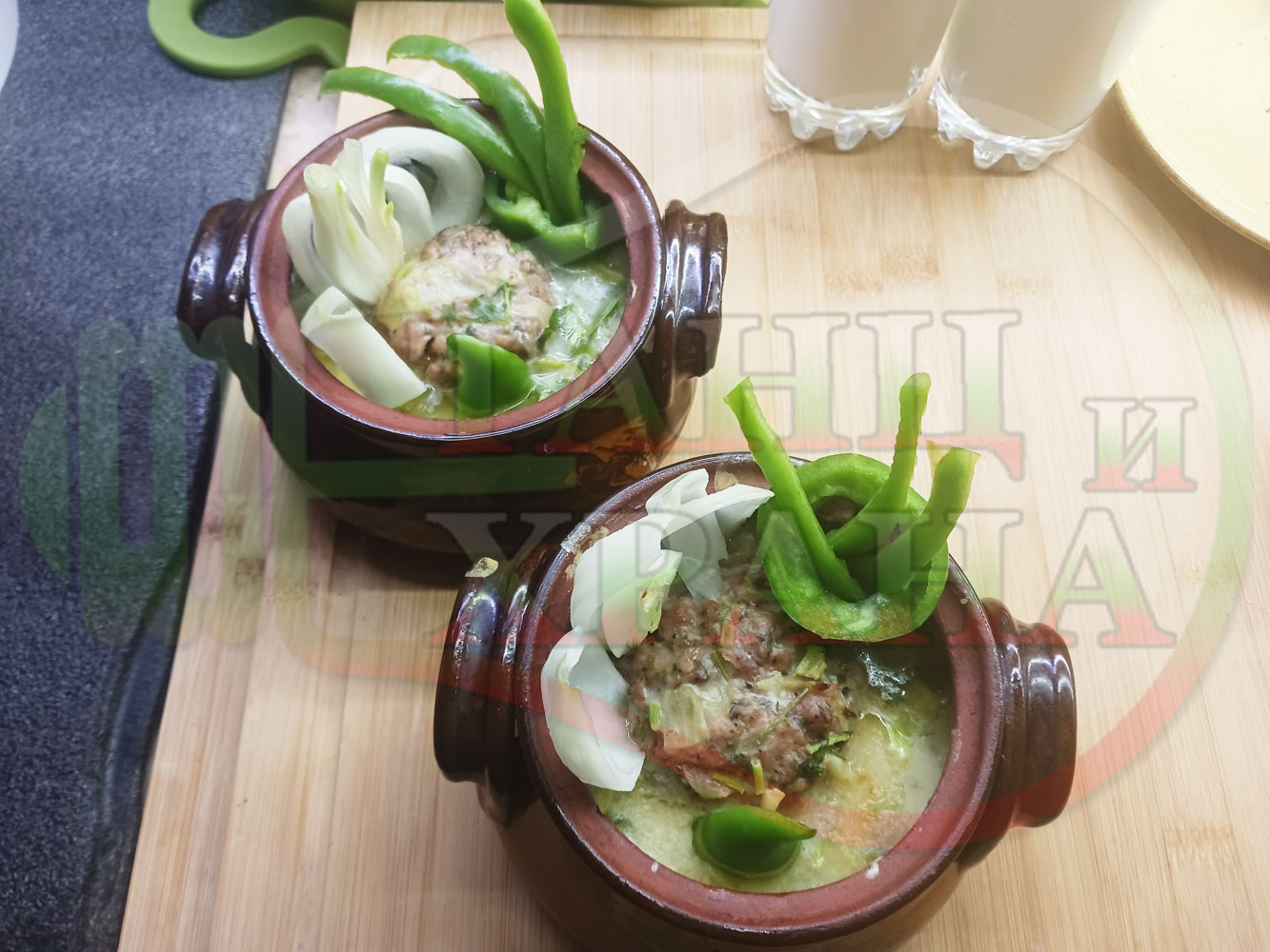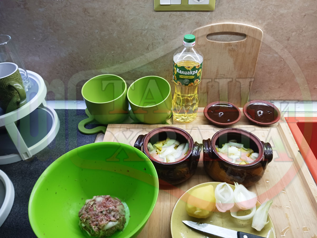 Гювечета с кюфтета "Каймяни картофенолучени чушковопрясномлечни" приготвени от домашно овкусена кайма с ронена чубрица, черен пипер и магданоз запечени на фурна с картофи, кромид лук и млечен сос с прясно мляко, брашно, масло и зелени пресни чушки