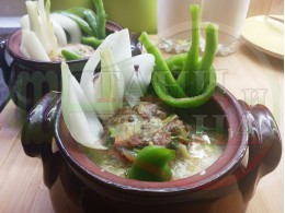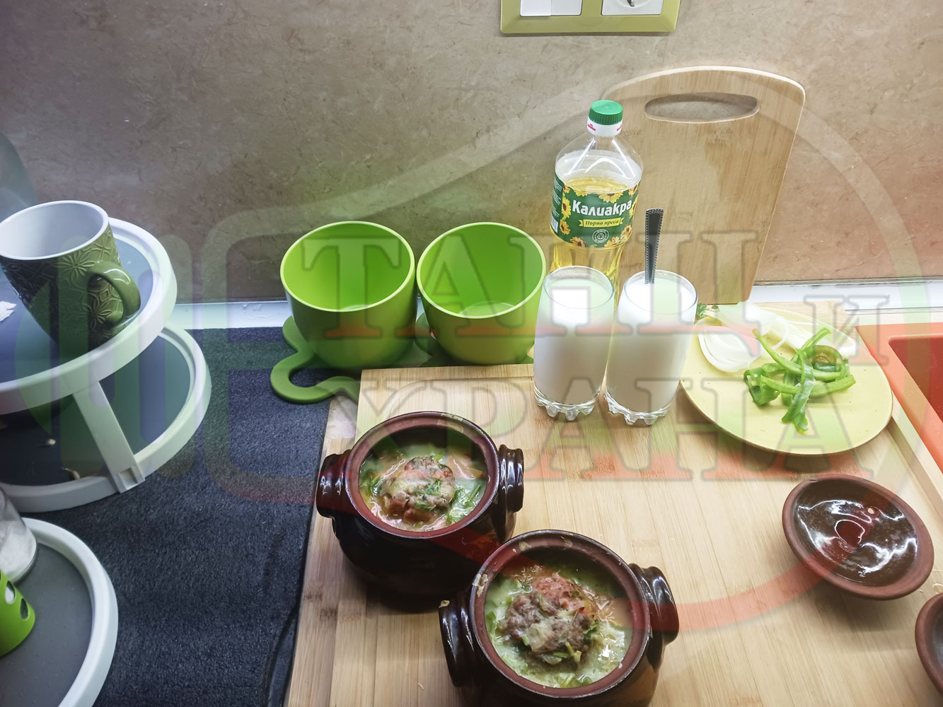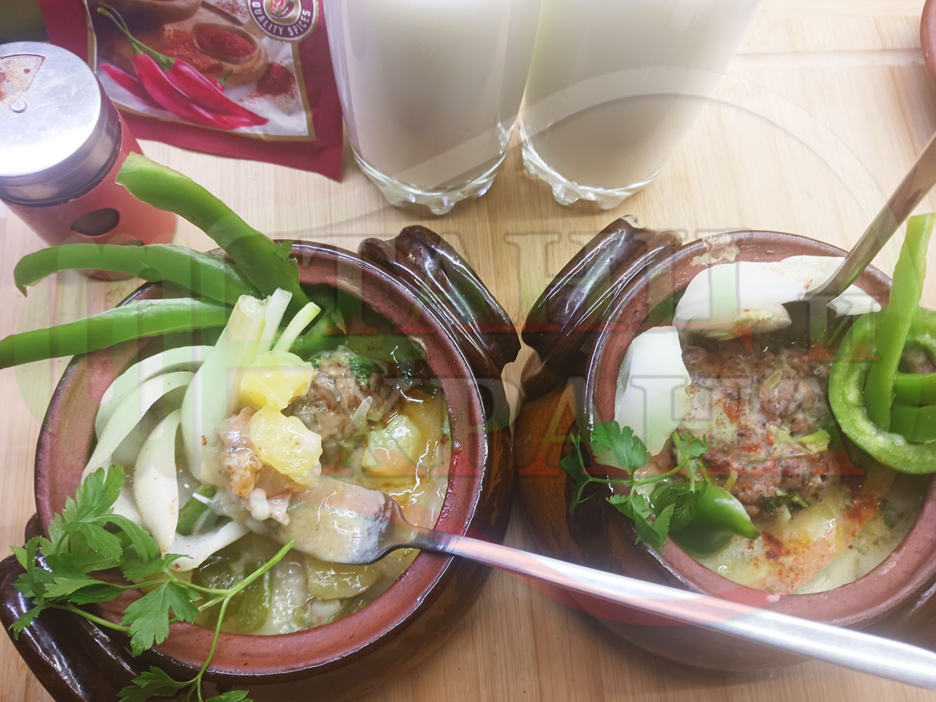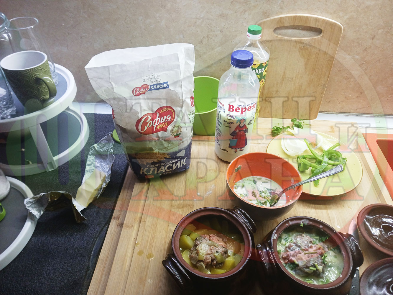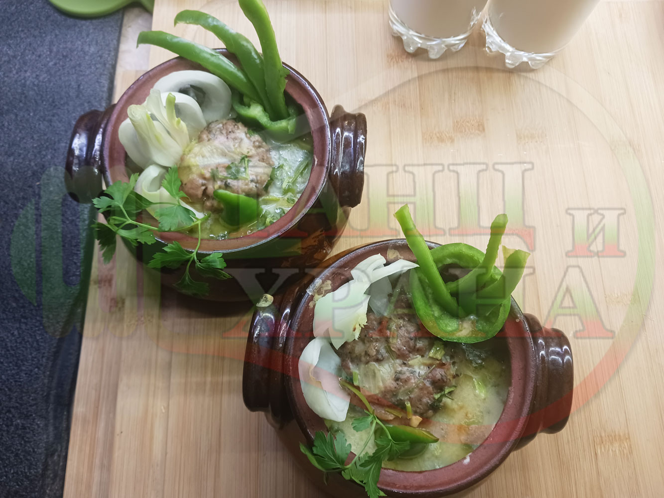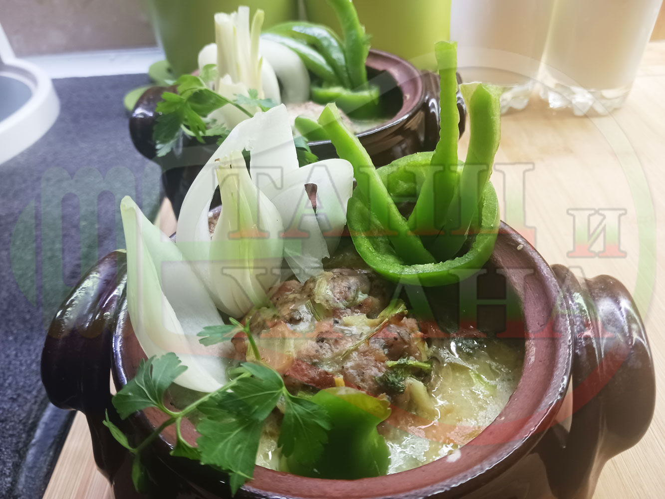 Гювечета с кюфтета "Каймяни картофенолучени чушковопрясномлечни" приготвени от домашно овкусена кайма с ронена чубрица, черен пипер и магданоз запечени на фурна с картофи, кромид лук и млечен сос с прясно мляко, брашно, масло и зелени пресни чушки