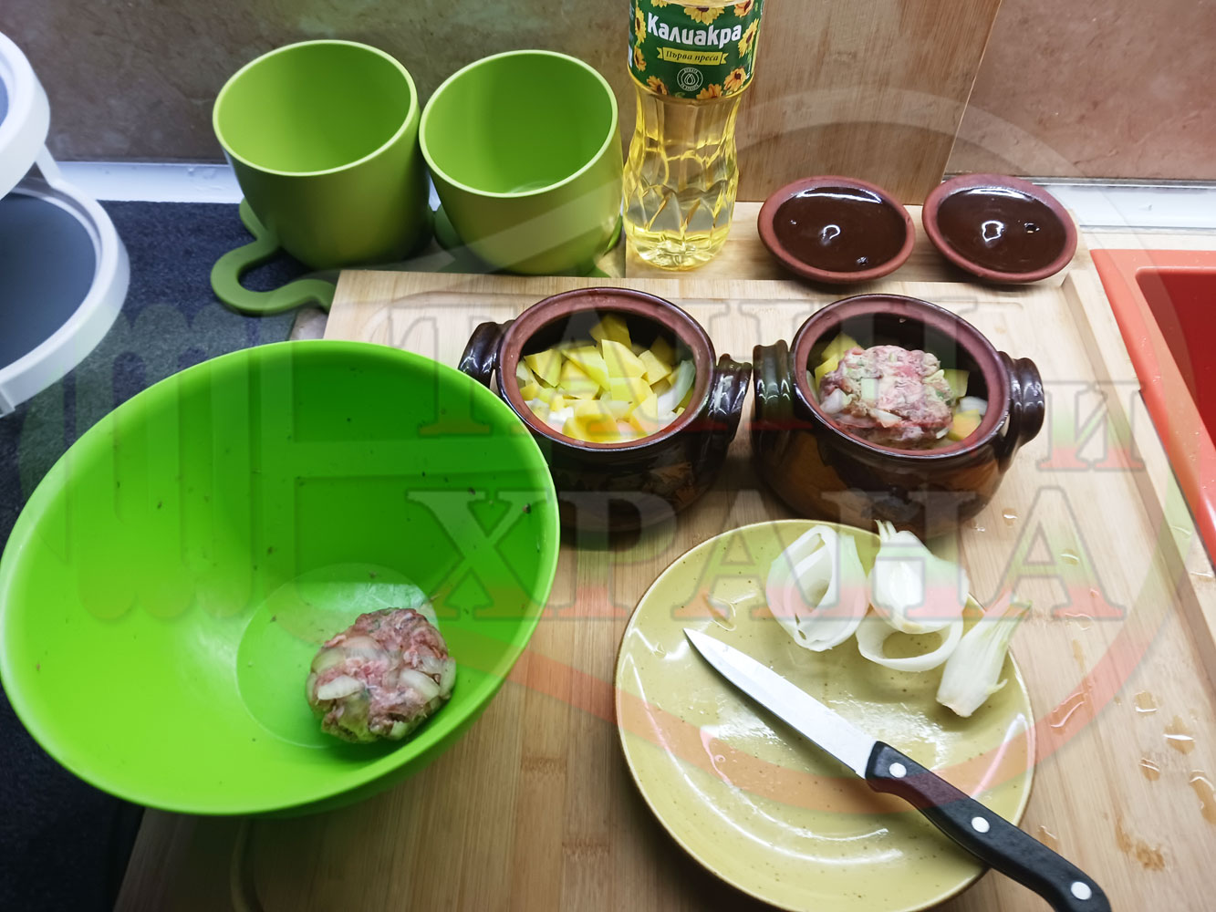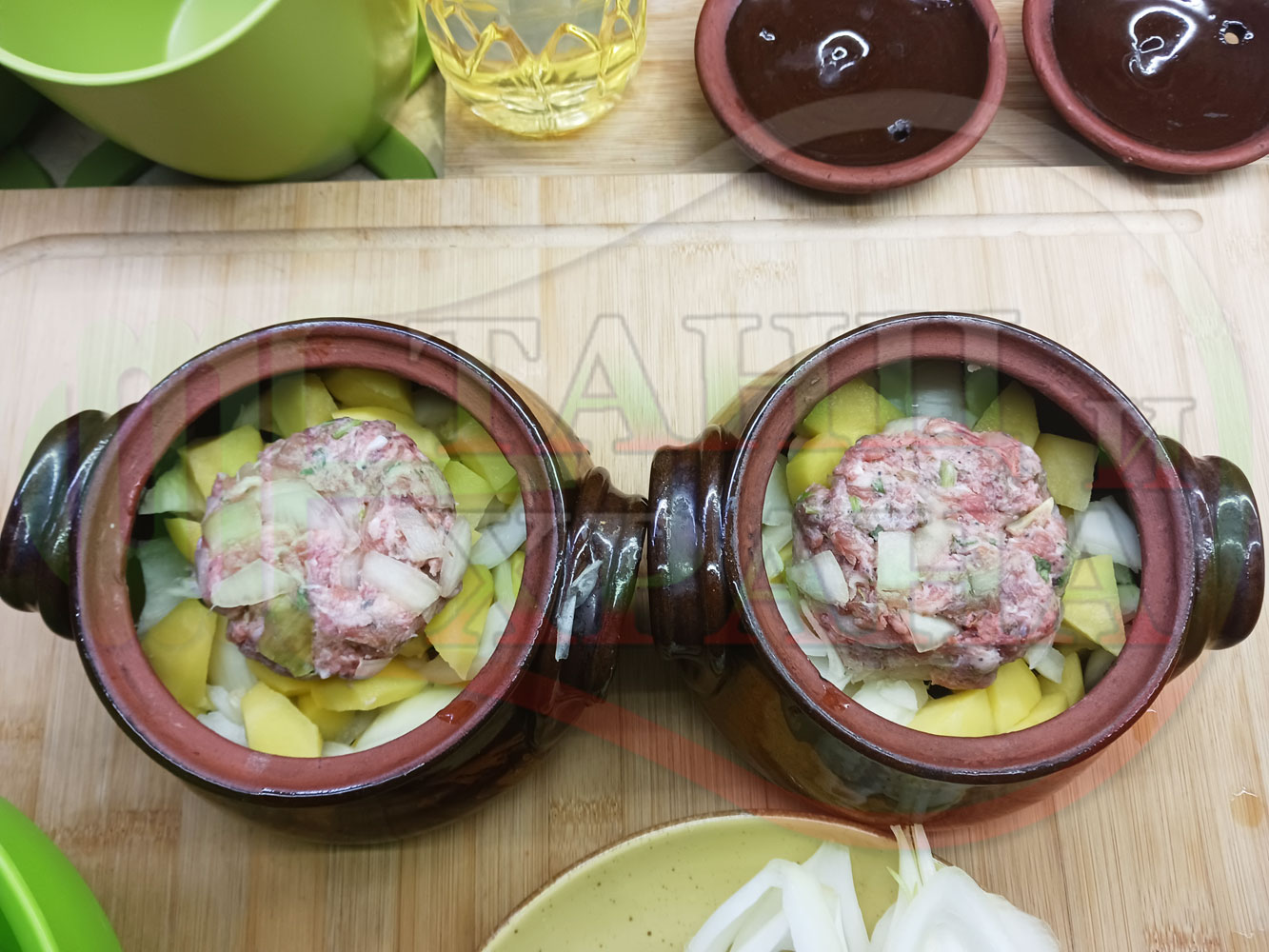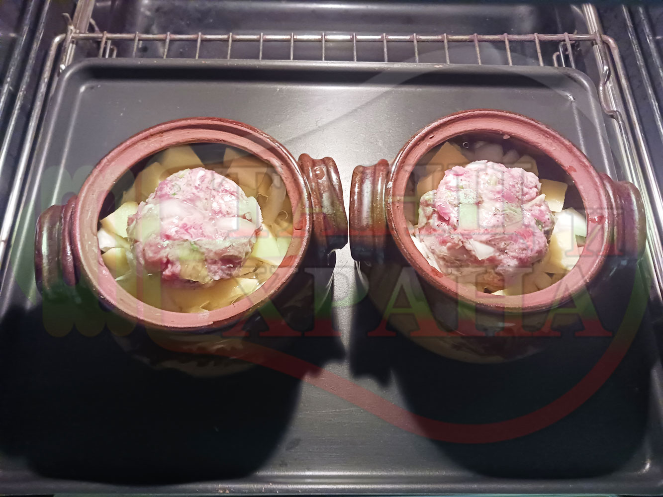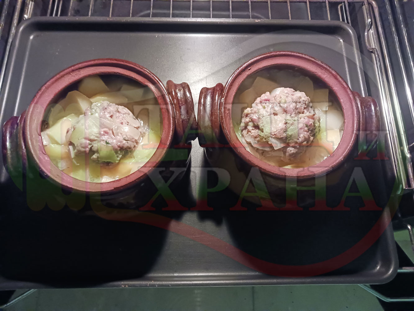 ВНИМАНИЕ: Фурните са различни и съответно времето за сваряване и леко запичане е ориентировъчно. Наблюдавайте процеса на запичане и при необходимост, открехнете капачетата на гювечетата или ги отстранете от фурната. Разбърквайте от време на време картофите и лука и при желание обърнете кюфтетата поне 1 път за да се запекат равномерно от 2-те страни (обърнете ги, в случай че желаете да са по-запечени).
