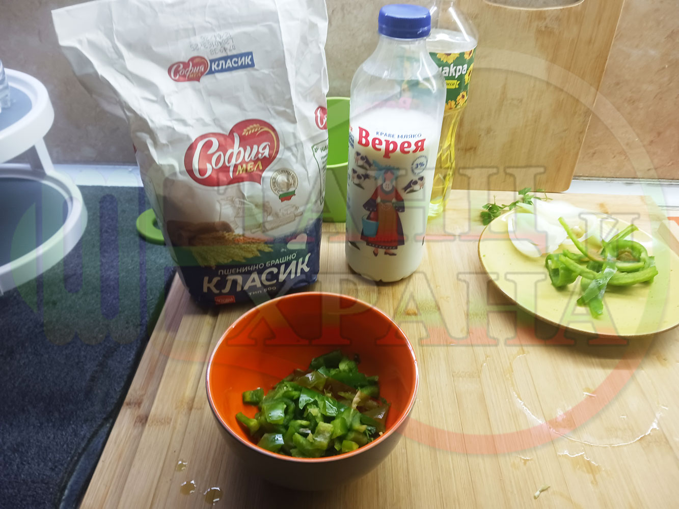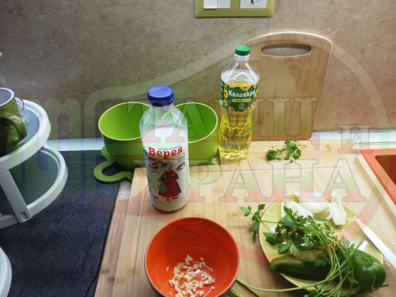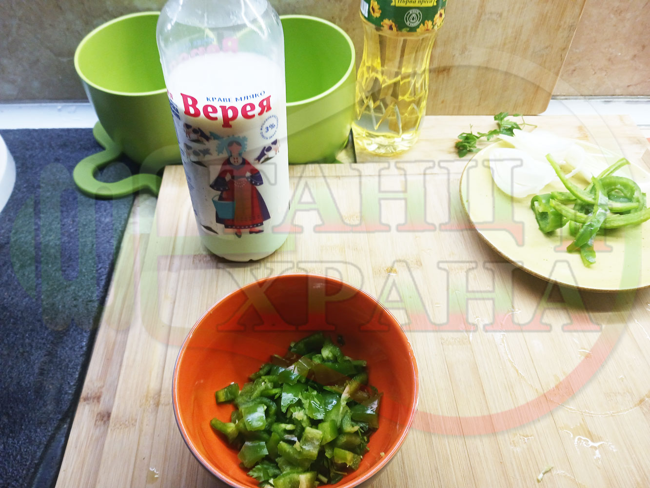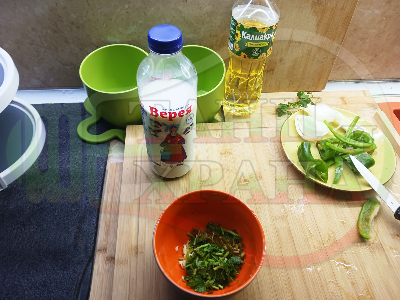Измийте магданоза, нарежете го на едро в купа заедно с обеления и нарязан на едро чесън и добавете измитата, почистена от семките чрез т.нар. "изтърбушване" и нарязана на малки парченца зелена чушка (нарежете част от чушката на ивички и "обръчи" и заделете връхчетата на чушката и стръкчета магданоз за украса). Сипете брашното, добавете кравето масло, сипете студеното прясно мляко и разбъркайте и намачкайте продуктите с вилица до образуване на рядък млечен, хомогенизиран сос с магданоз, чесън и зелени пресни чушки (млечен сос).