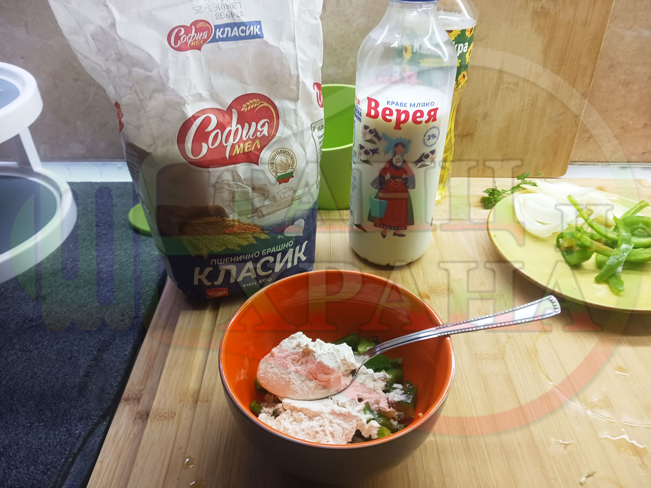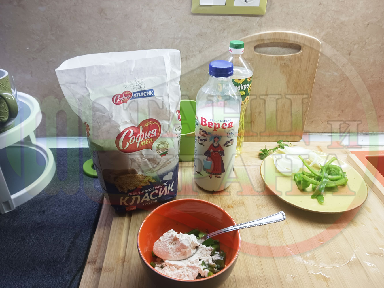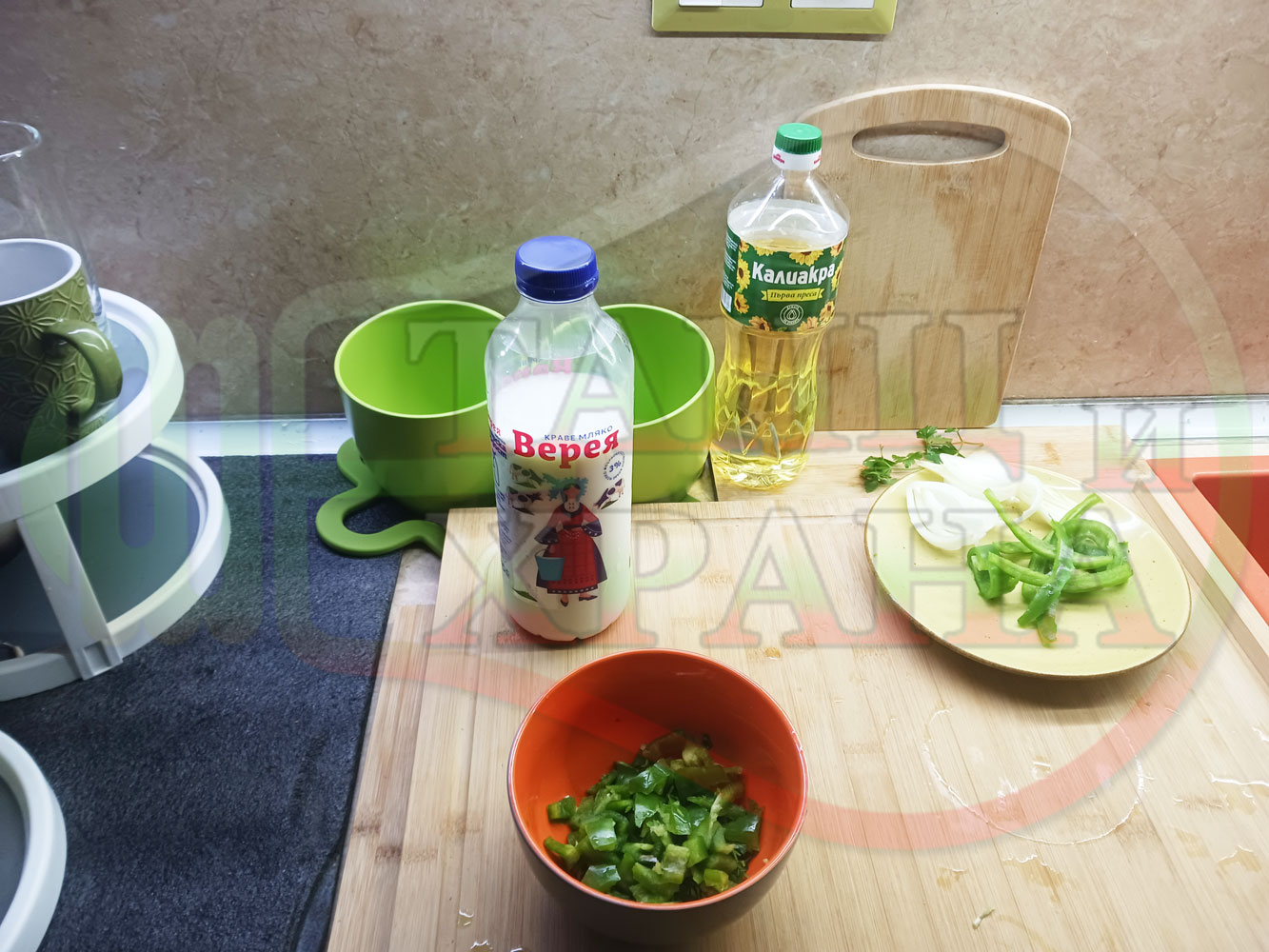 Измийте магданоза, нарежете го на едро в купа заедно с обеления и нарязан на едро чесън и добавете измитата, почистена от семките чрез т.нар. "изтърбушване" и нарязана на малки парченца зелена чушка (нарежете част от чушката на ивички и "обръчи" и заделете връхчетата на чушката и стръкчета магданоз за украса). Сипете брашното, добавете кравето масло, сипете студеното прясно мляко и разбъркайте и намачкайте продуктите с вилица до образуване на рядък млечен, хомогенизиран сос с магданоз, чесън и зелени пресни чушки (млечен сос).