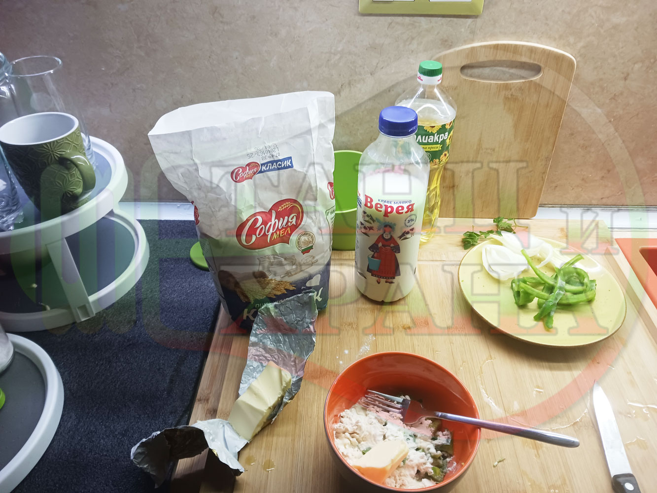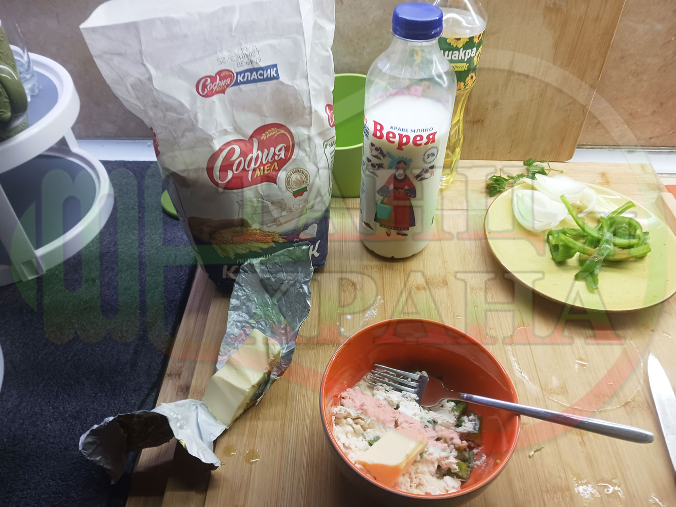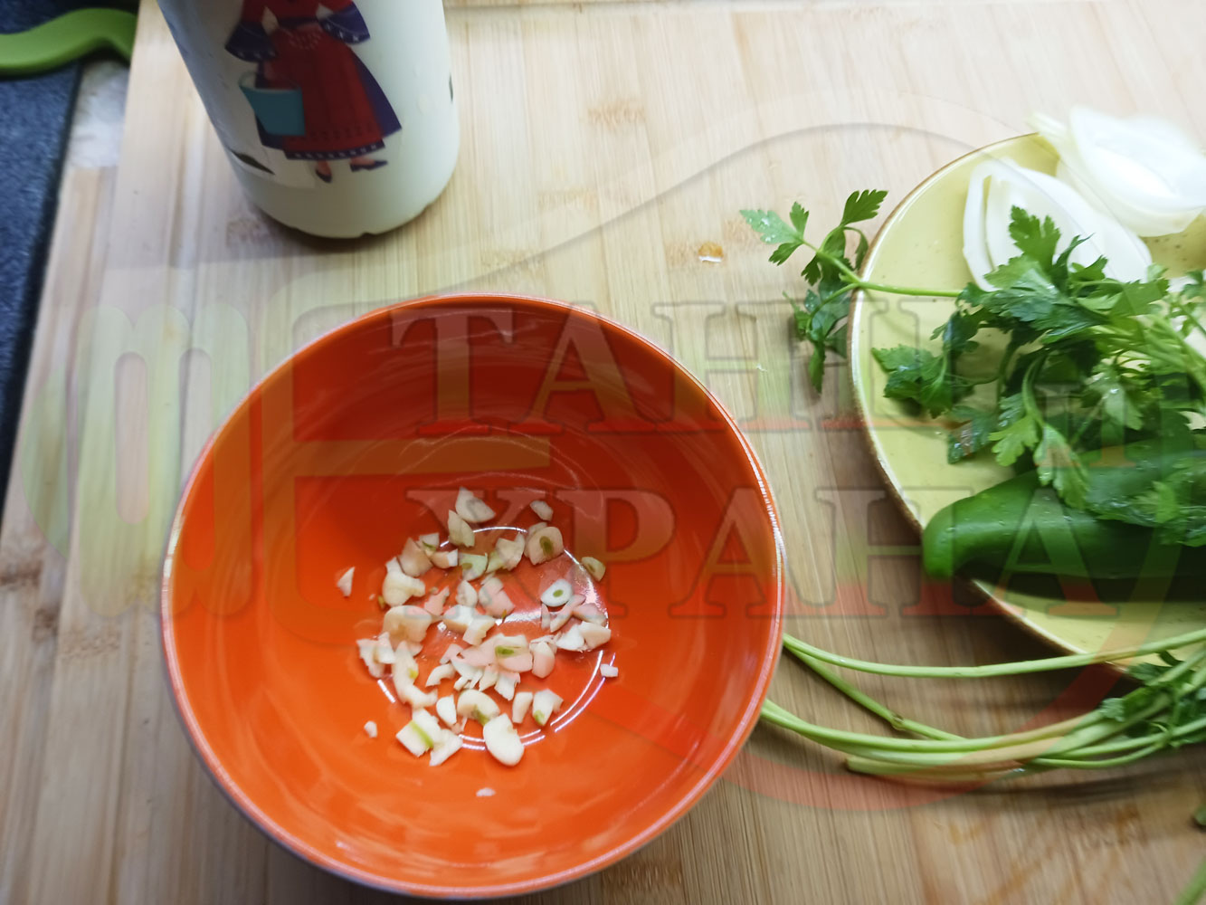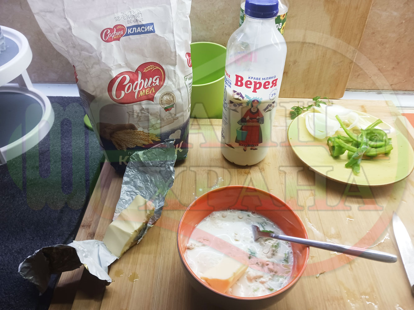 Измийте магданоза, нарежете го на едро в купа заедно с обеления и нарязан на едро чесън и добавете измитата, почистена от семките чрез т.нар. "изтърбушване" и нарязана на малки парченца зелена чушка (нарежете част от чушката на ивички и "обръчи" и заделете връхчетата на чушката и стръкчета магданоз за украса). Сипете брашното, добавете кравето масло, сипете студеното прясно мляко и разбъркайте и намачкайте продуктите с вилица до образуване на рядък млечен, хомогенизиран сос с магданоз, чесън и зелени пресни чушки (млечен сос).