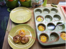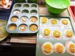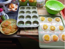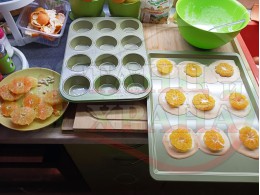 Сипете слънчогледово олио в тава за печене на курабии и във форма за печене на кексчета и размажте олиото равномерно. Измийте мандарините с гъба и веро, изплакнете ги хубаво, обелете ги и почистете от семките (измийте мандарините с веро, в случай че желаете да изсушите корите за приготвянето на различни сладкиши). Нарежете всяка мандарина на кръгли 3 части. Сипете по 1 супена лъжица от белтъчната смес в плоската тава и във формата за печене на кексове и поставете по 1 кръгче от нарязаните мандарини. Поставете тавата и формата за печене на кексове в предварително загрятата фурна (загрейте я за поне 5 минути). Запечете на фурна без вентилатор на 180 градуса за около 15 минути.