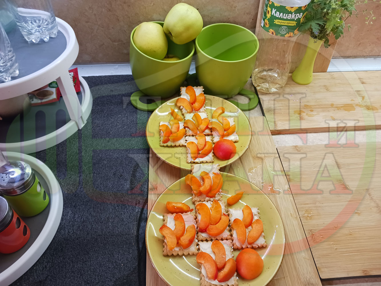 Бисквитен десерт "Кайсиевоканелен" приготвен от обикновени бисквити намазани с краве масло, поръсени с ароматна канела и гарнирани с пресни кайсии