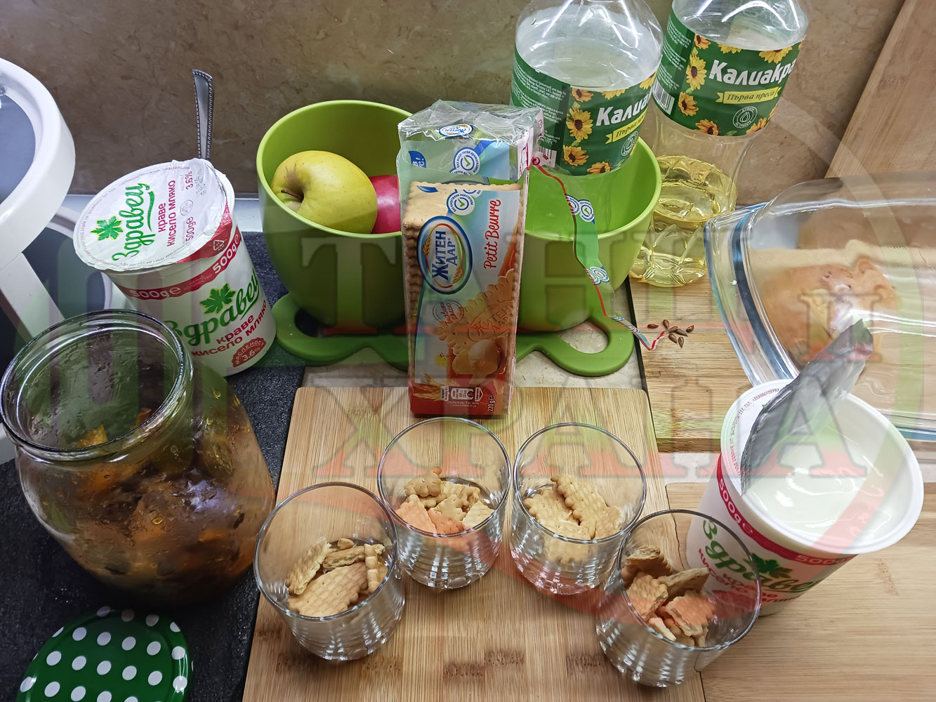 ПРОДУКТИ: Приблизителни количества за бисквитен млечен десерт "Ябълков с лимоновосладко с кайсии и стафиди" приготвен с обикновени бисквити, пресни ябълки и кисело мляко от България гарниран със сладко от лимони със сушени плодове