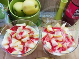 Сипете по 2,5 супени лъжици от малиновия сироп върху ябълките и украсете всяка порция с ябълковите резени и с по 1 цяла, обикновена бисквита (украсете по ваше желание и усмотрение).