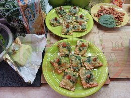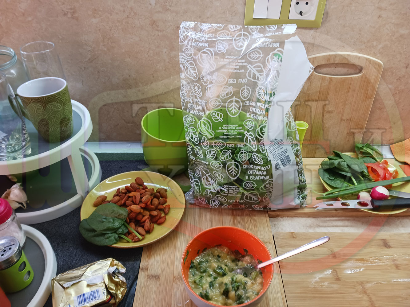 Бисквитен суров десерт "Спаначенобананов бадемоворепичков" приготвен от обикновени бисквити с масло намазани със спаначен бананов крем от свеж спанак и банани гарниран с печени осолени бадеми и малки репи