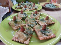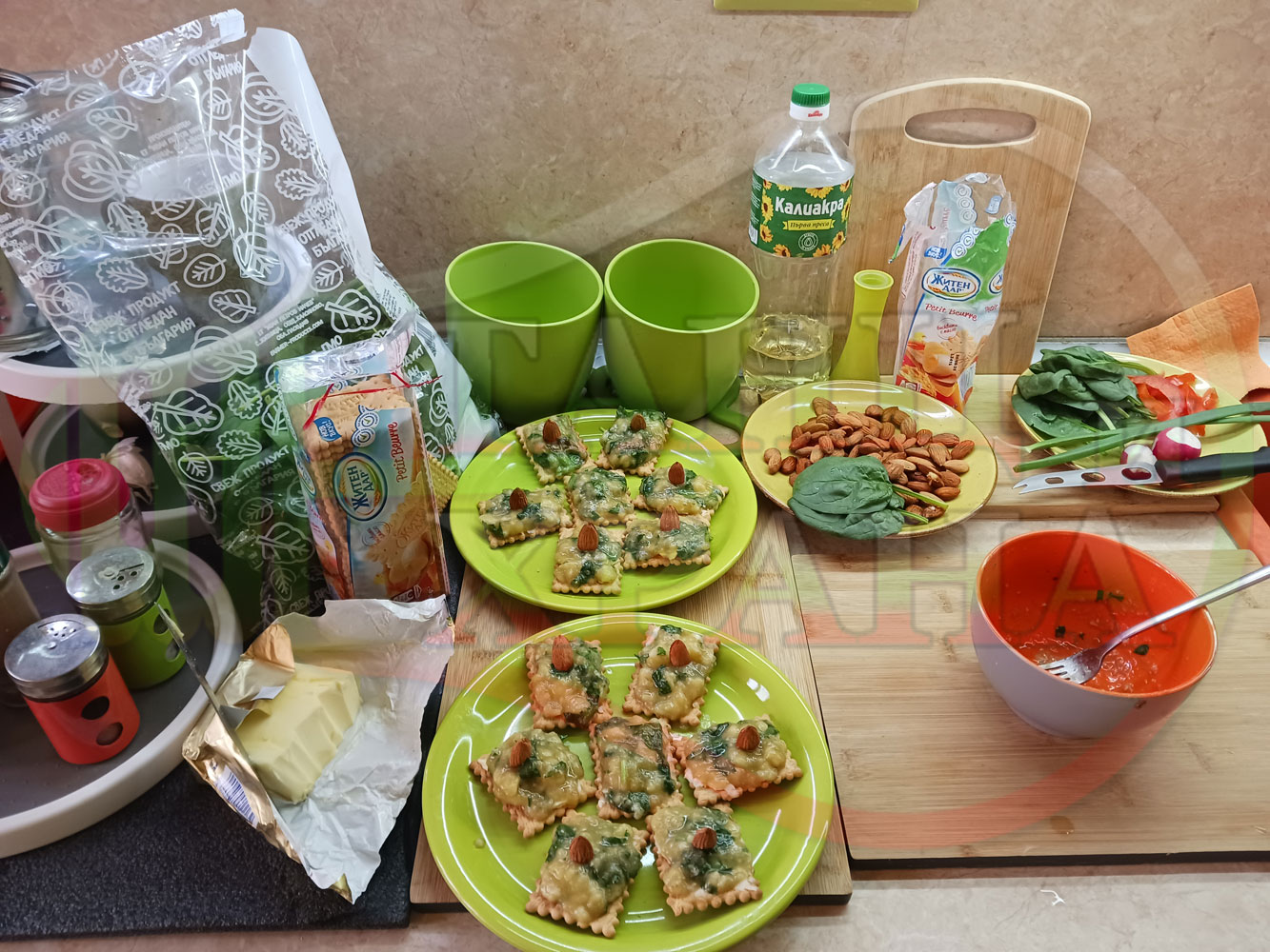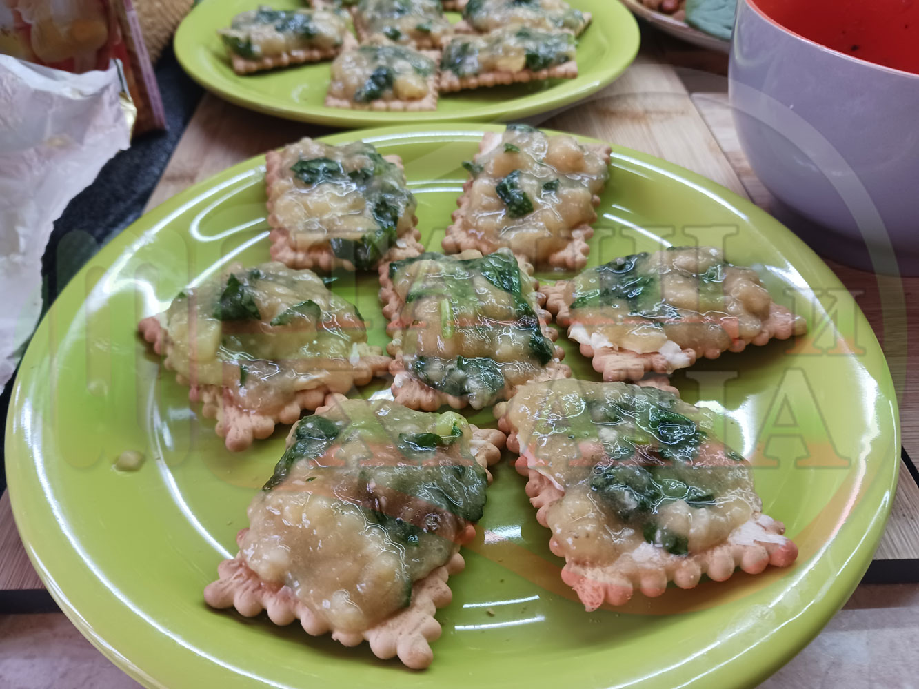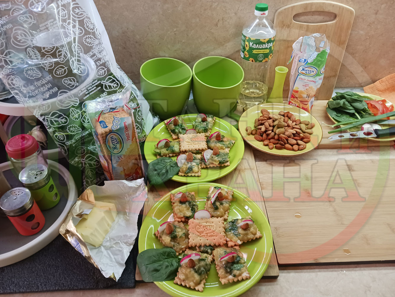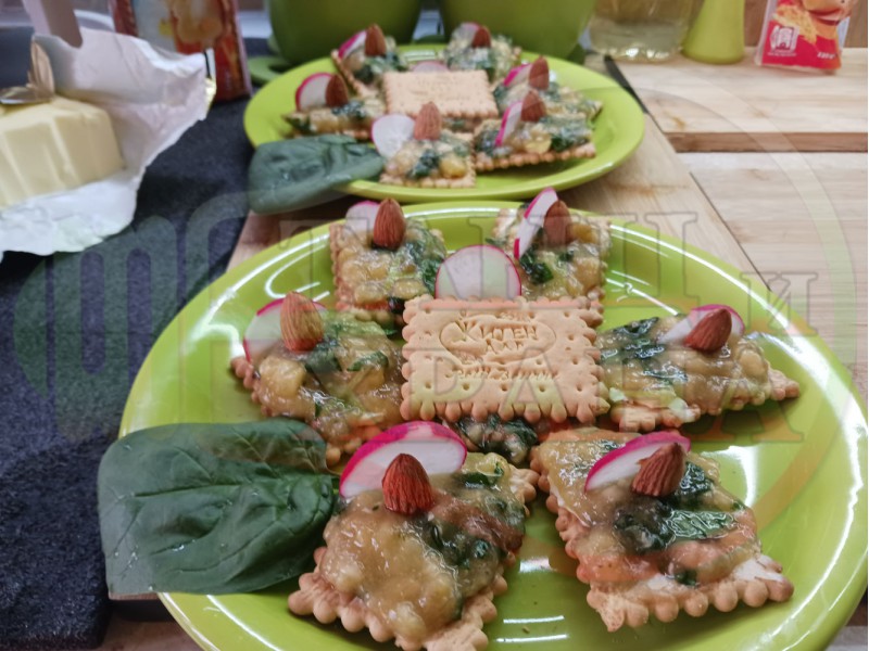 Разпределете равномерно спаначено банановия крем върху намазаните с масло бисквити. Поставете по една бадемова ядка в крема и украсете с по една измита и нарязана на кръгчета от малките репи. Поставете една цяла бисквитка върху централната бисквитка, така че да се образува нещо като "бисквитен сандвич". Украсете с листенца от свежия спанак (украсете по ваше желание и усмотрение).