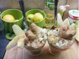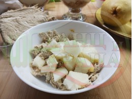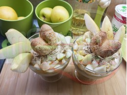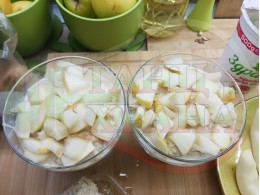 В  "Свързани продукти" вижте рецептите на други видове млечни, плодови и зеленчукови десерти с българско кисело мляко и пресни круши, салати, сурови млечни супи с плодове и техни"ТЕ" производни.