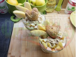 Български курабиен плодов млечен десерт "Крушов халвяноорехов киселомлечен" приготвен с готови курабии, кисело мляко от България и халвян крем с пресни круши и биологична орехова тахан халва