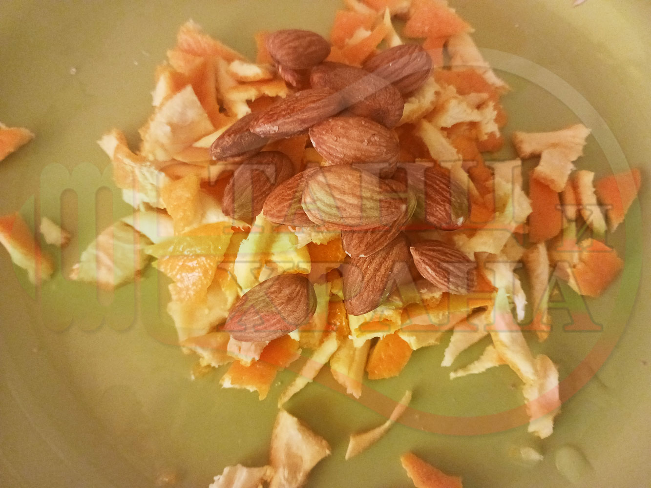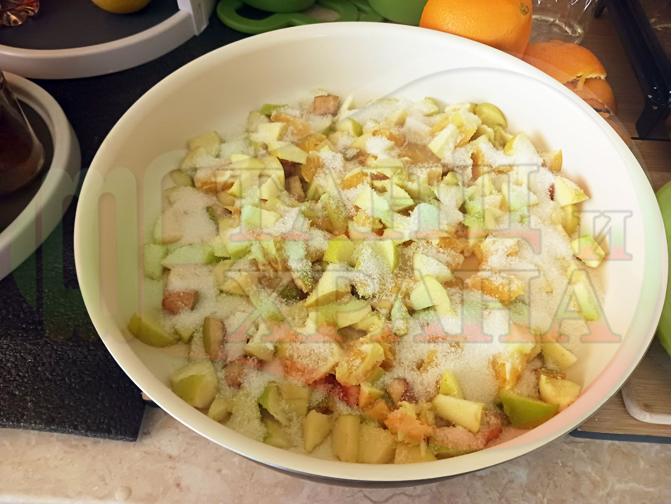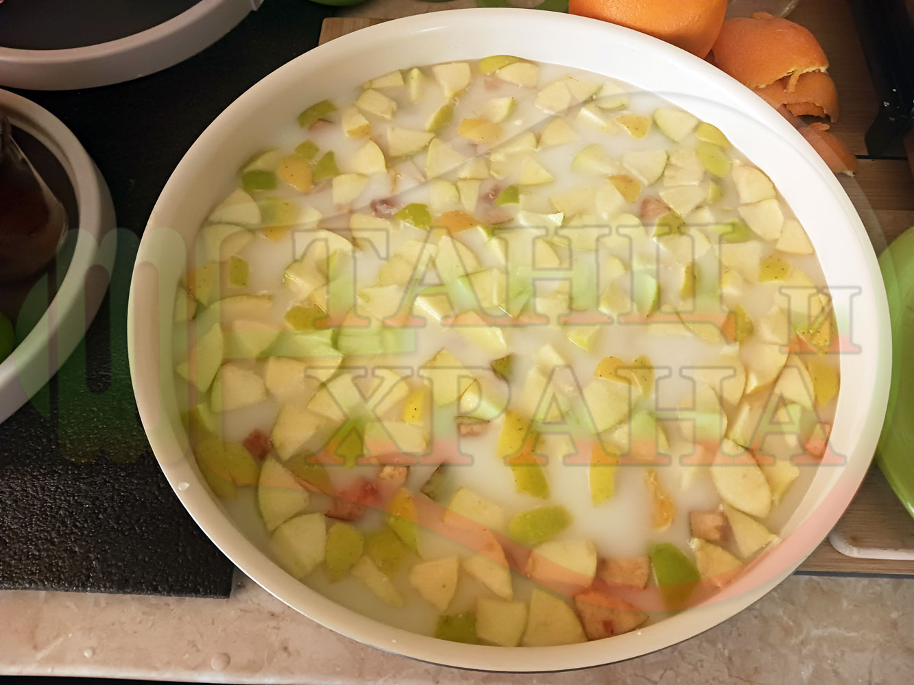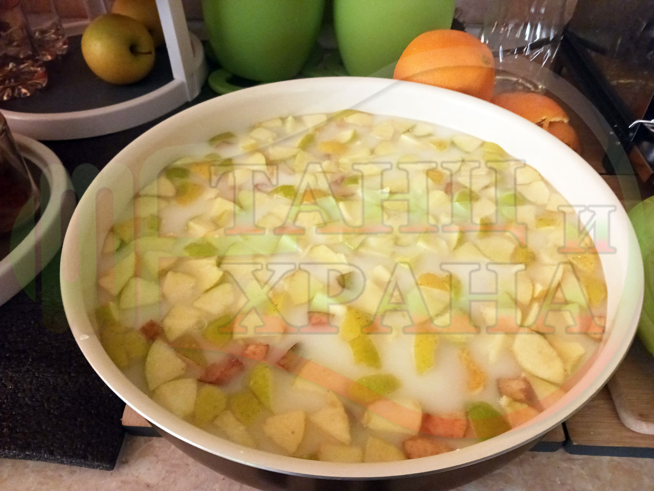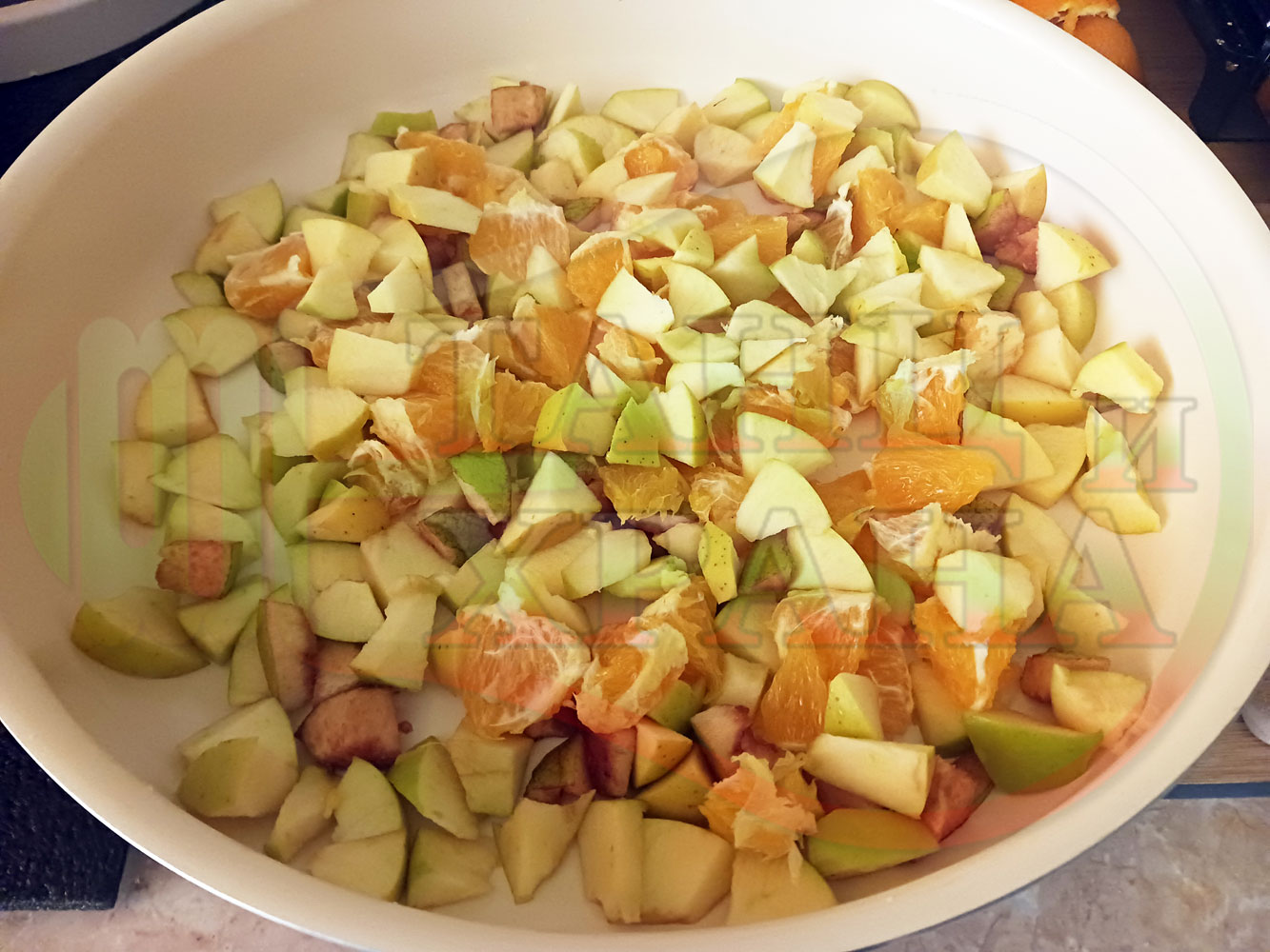 Измийте, нарежете и почистете плодовете. Нарежете ги на средни по големина парченца и ги сипете в тава за печене. Добавете захарта и прясното мляко. Налейте топла към гореща вода от чешмата и разбъркайте за да се разтопи захарта (може да не я разтопявате напълно). Заделете част от орехите и бадемите за украса. Начупете по-голямото количество от орехите на едро и ги сипете в тавата. Ако имате домашна извара може да я добавите към продуктите. Поставете тавата в предварително загрятата фурна. Варете и леко запечете на фурна без вентилатор на 180 градуса за около 1 час до пълно извиране на млякото с водата.