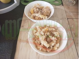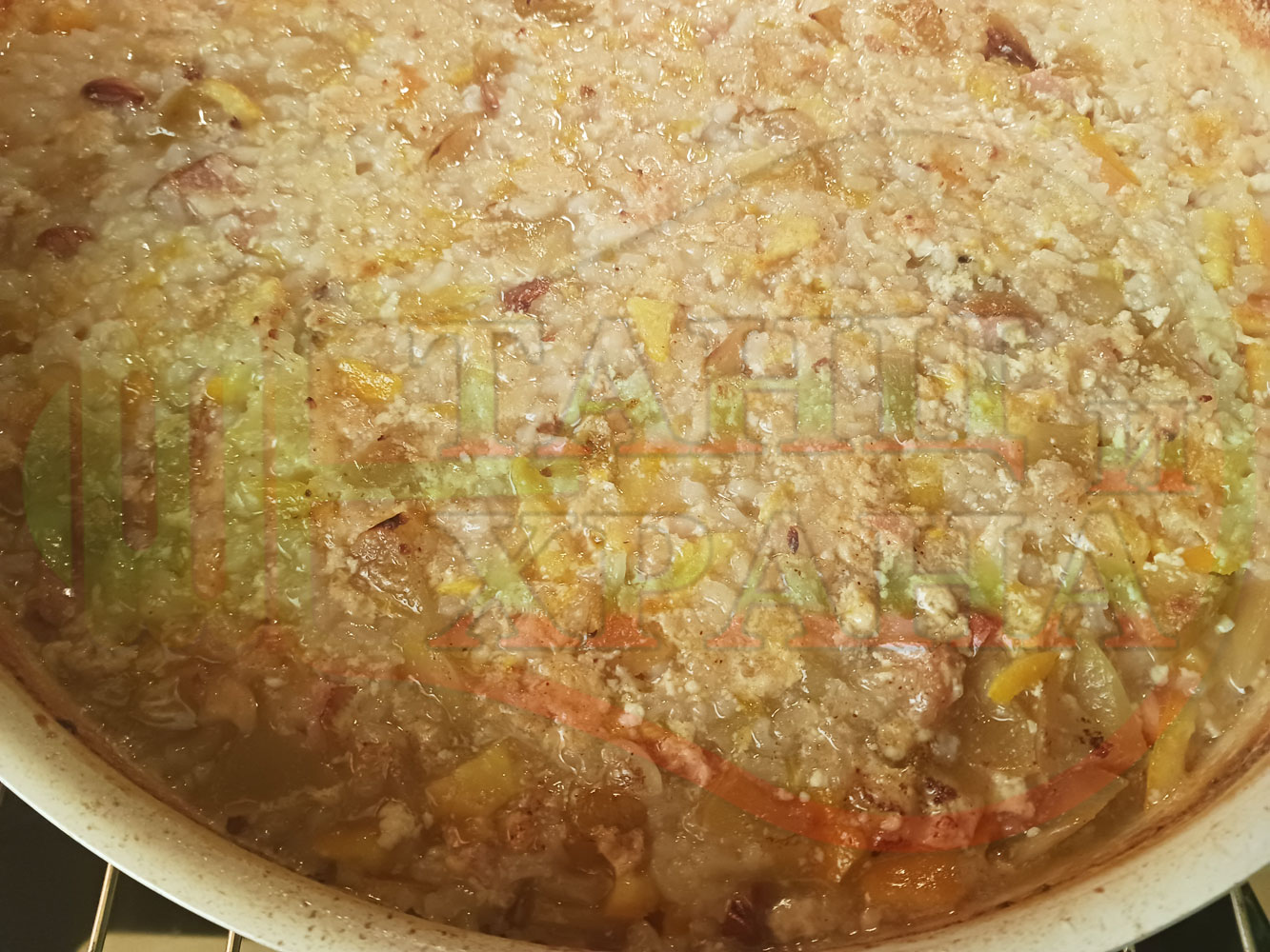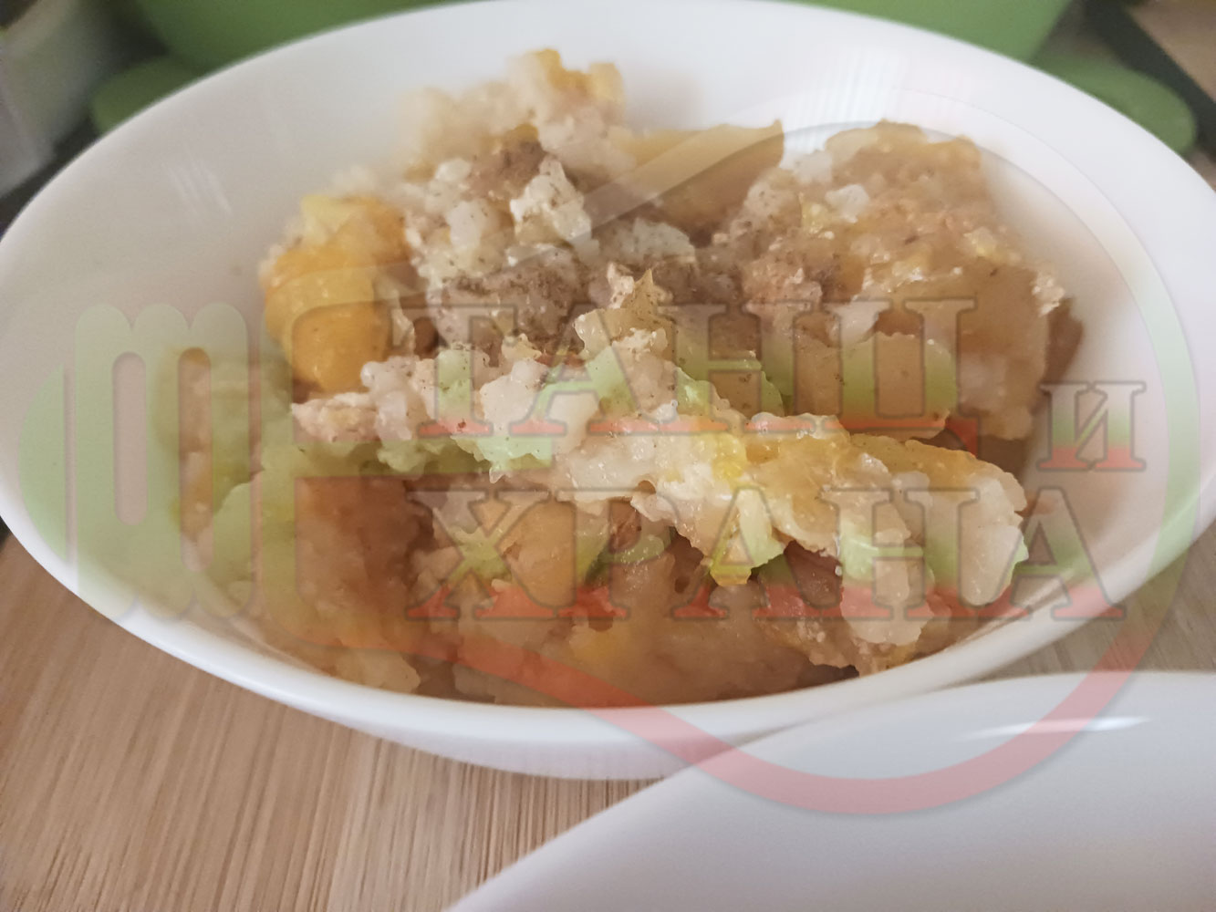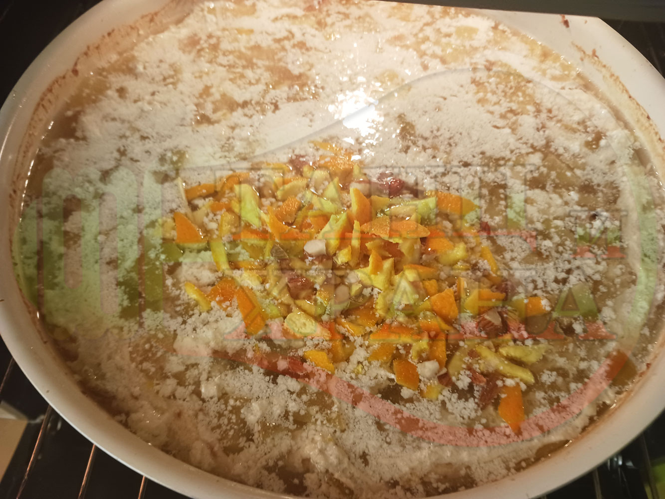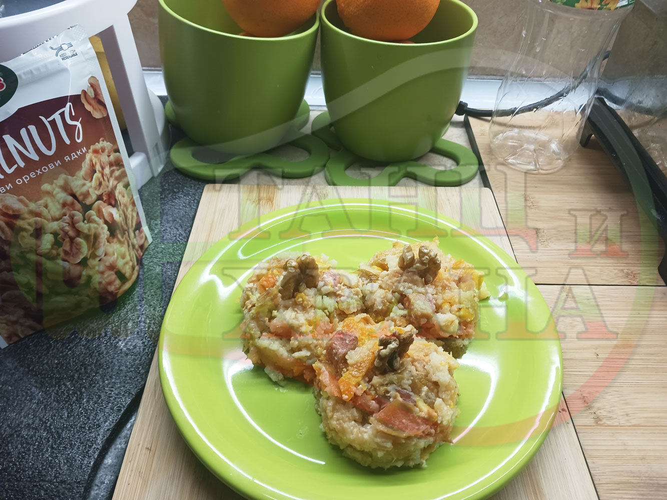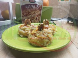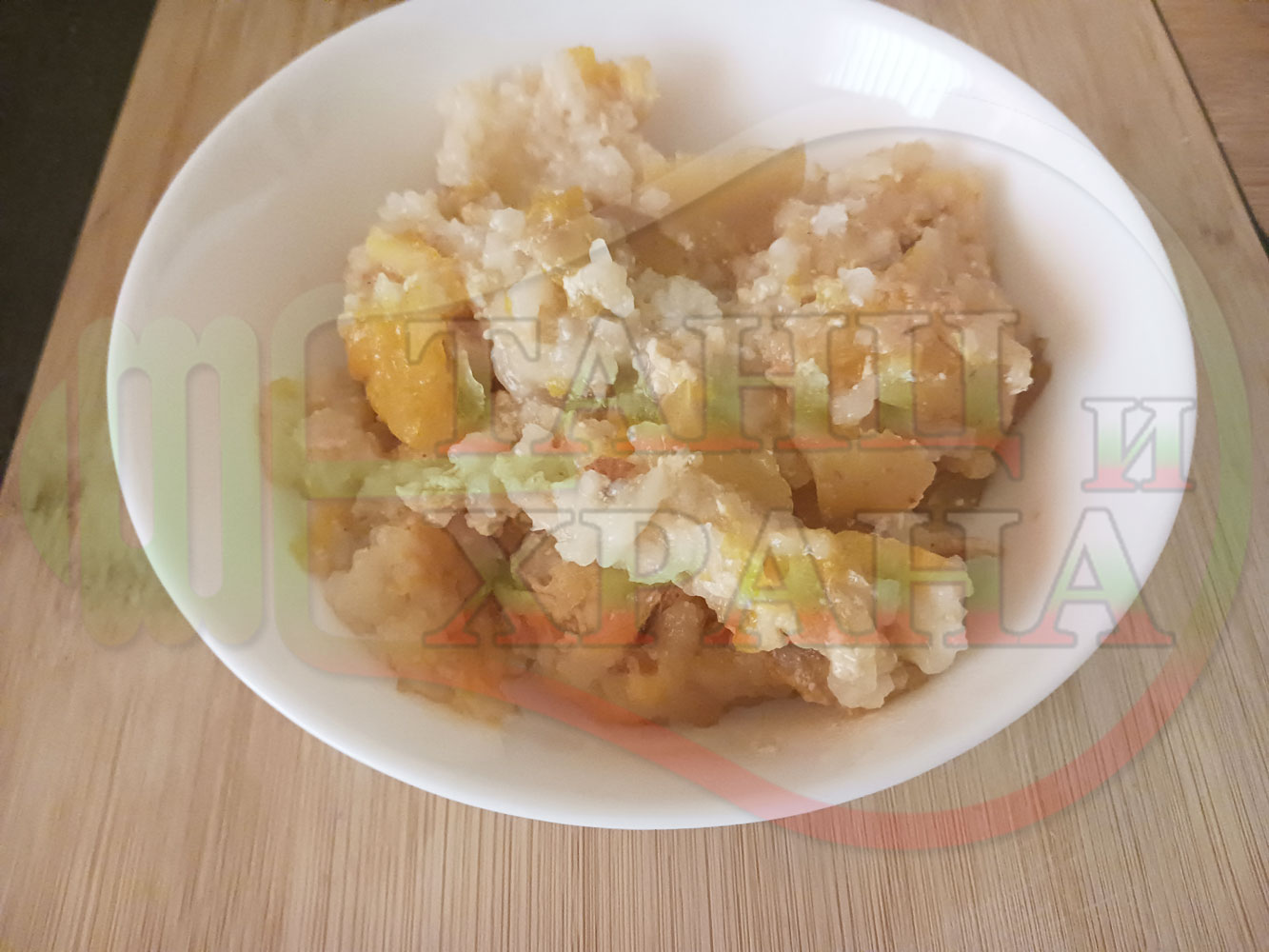 Българско мляко с ориз "Грейпфрутали ябълководюлено" сварено на фурна с прясно мляко, пресни дюли, ябълки, портокали, сурови орехи и грейпфрути гарнирано със сурови бадеми