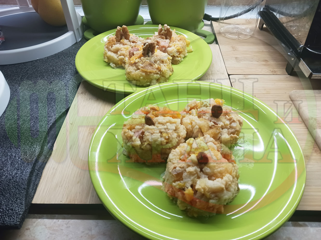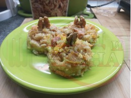 Добавете 2-та вида ядки, канелата и изварата при приготвянето на ориза или поръсете, гарнирайте и украсете готовите порции. Оформете ориза в кръгла форма чрез метален ринг или в каквато форма пожелаете.