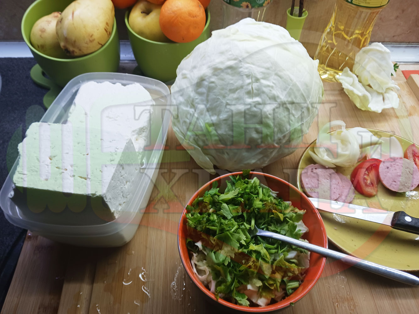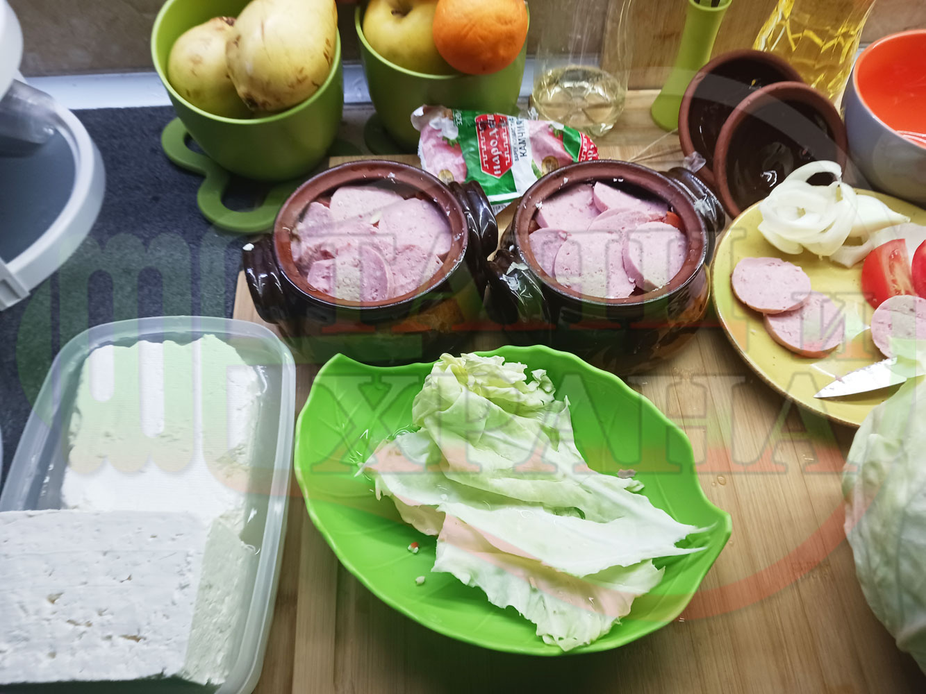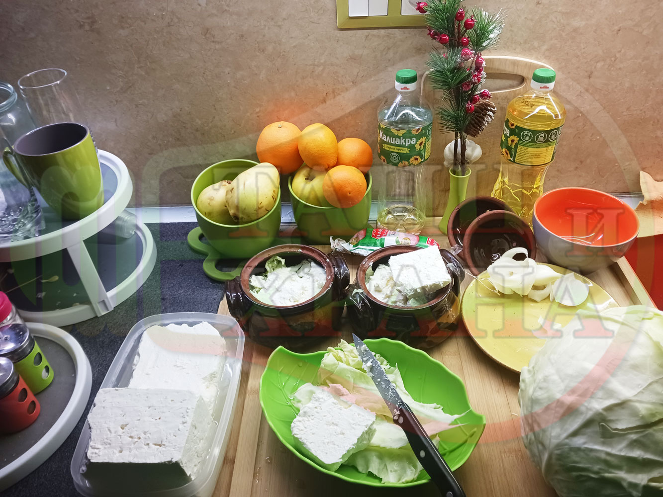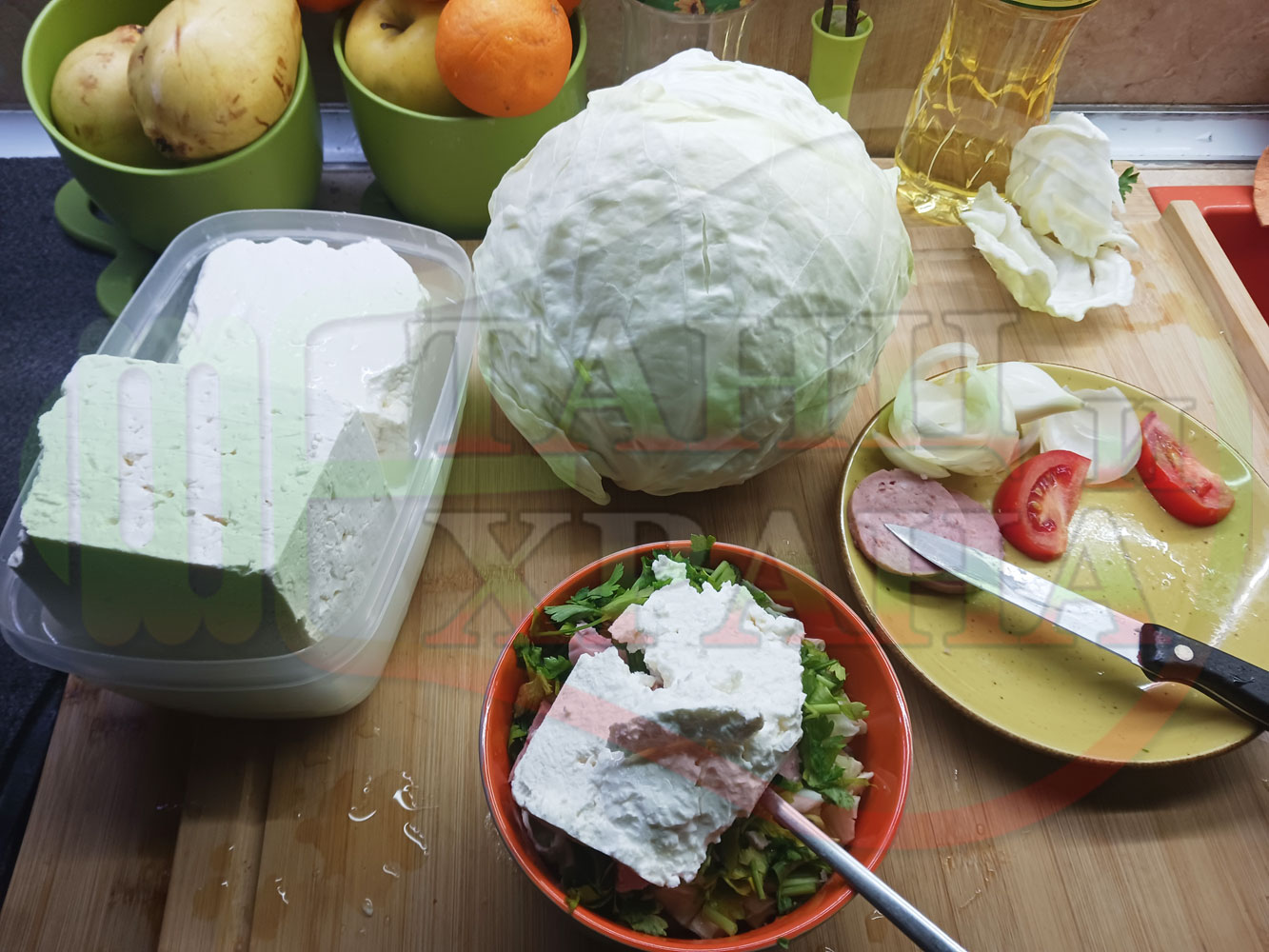 ПРОДУКТИ: Приблизителни количества за български гювечета "Пряснозелеви камчиевосаламени с БГсирене" запечени на фурна с прясно зеле, домати, лук, чесън и чеснов салам гарнирани с големи топки от сиреново зелев крем с краве бяло сирене (българско, саламурено) и магданоз - двукомпонентни