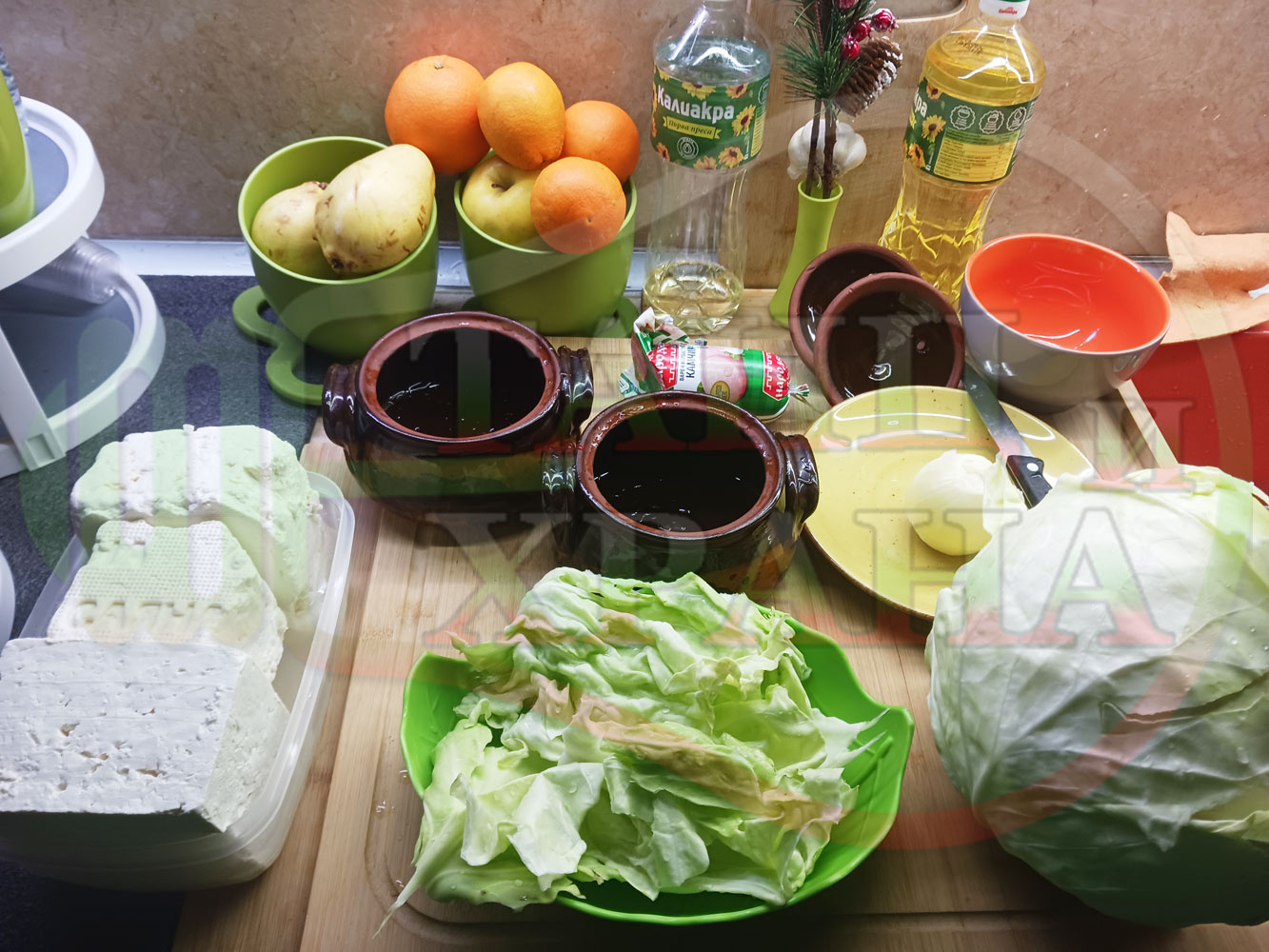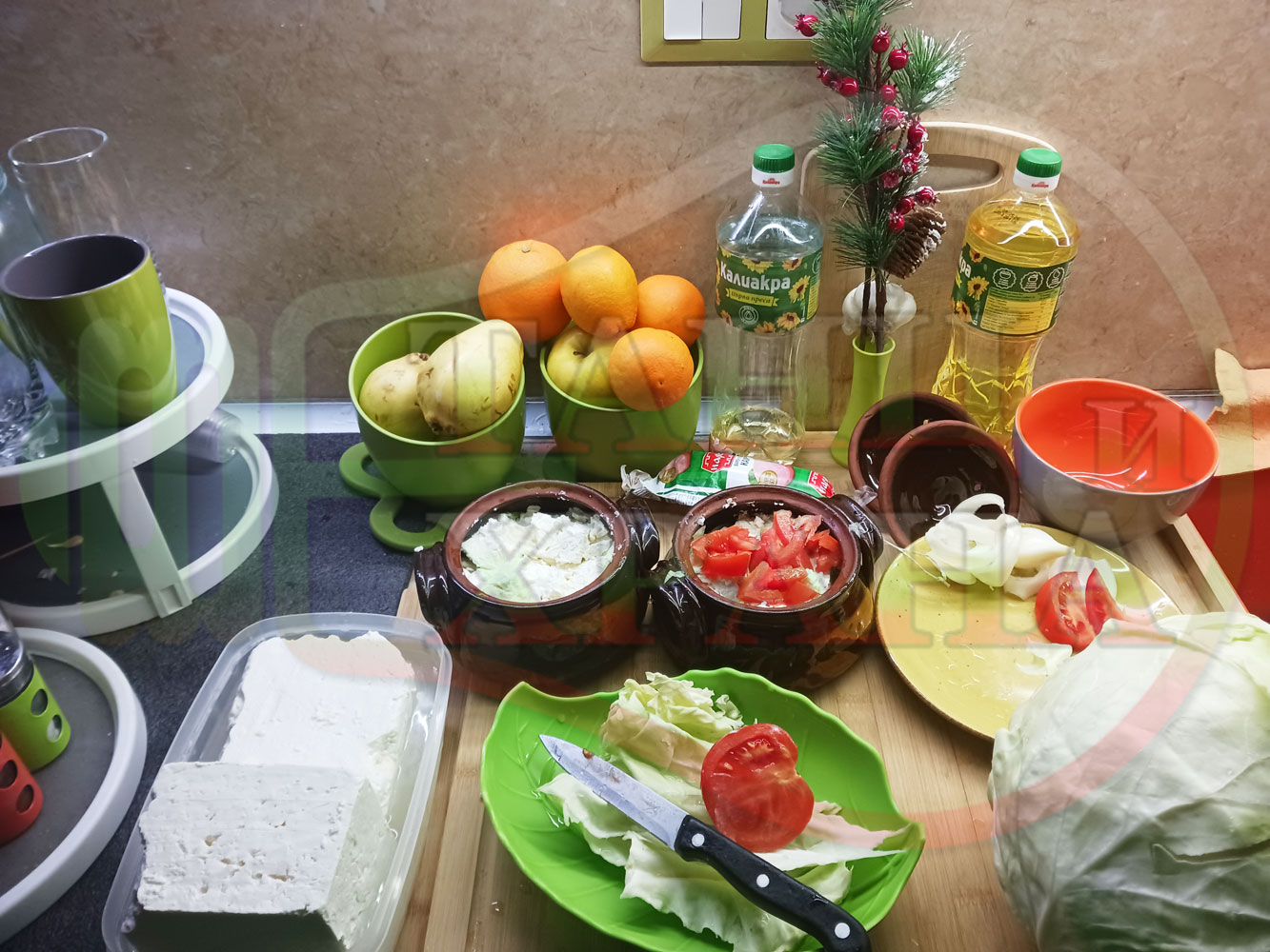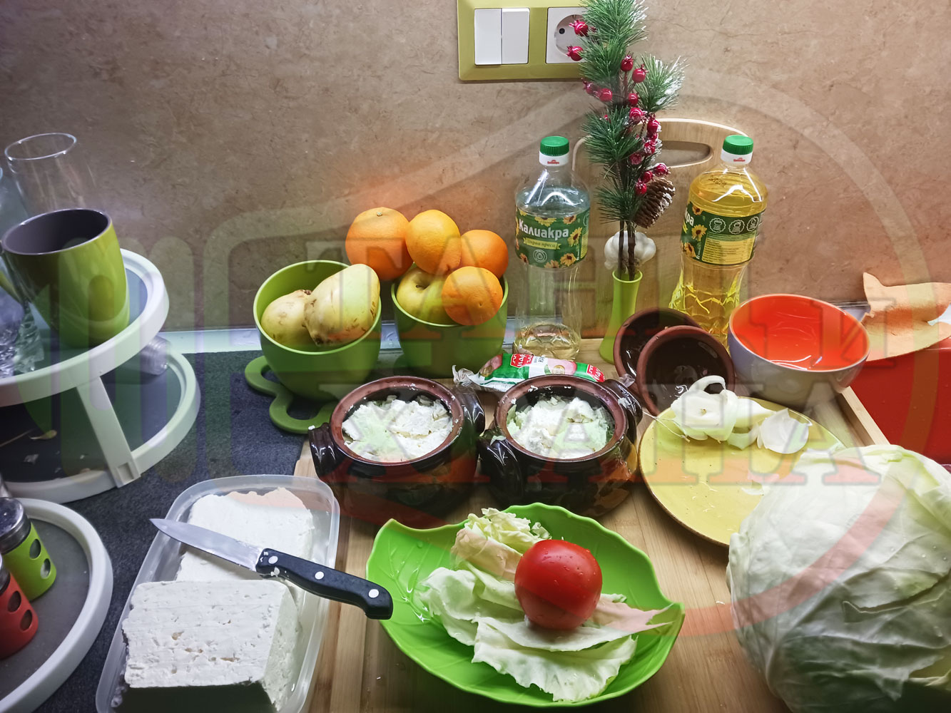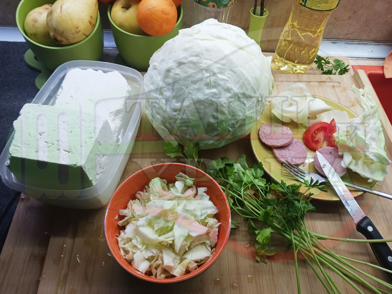 ПРОДУКТИ: Приблизителни количества за български гювечета "Пряснозелеви камчиевосаламени с БГсирене" запечени на фурна с прясно зеле, домати, лук, чесън и чеснов салам гарнирани с големи топки от сиреново зелев крем с краве бяло сирене (българско, саламурено) и магданоз - двукомпонентни