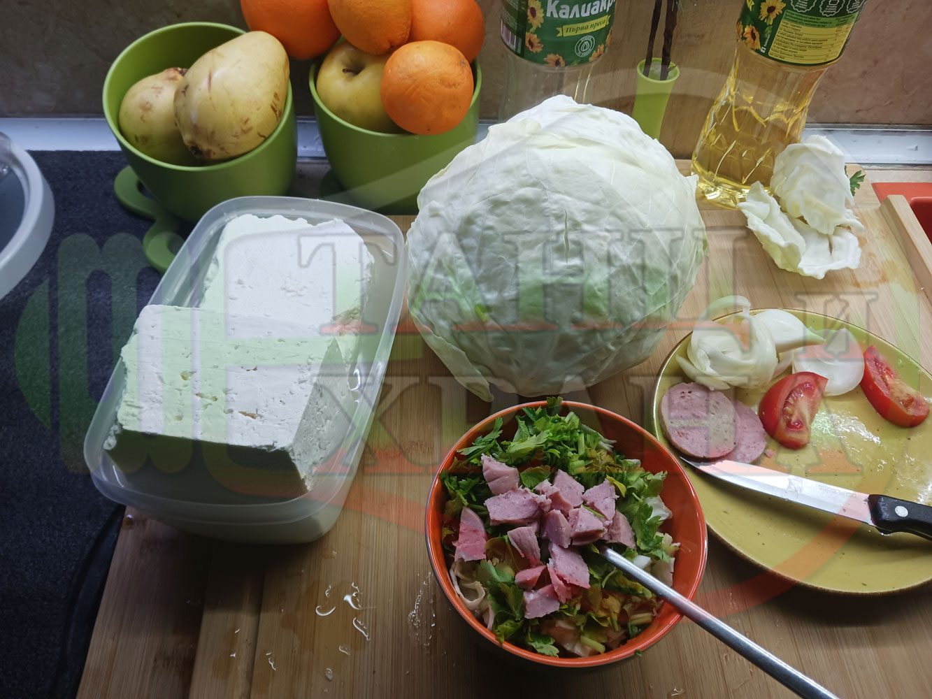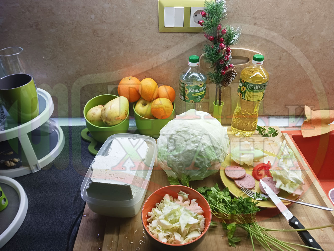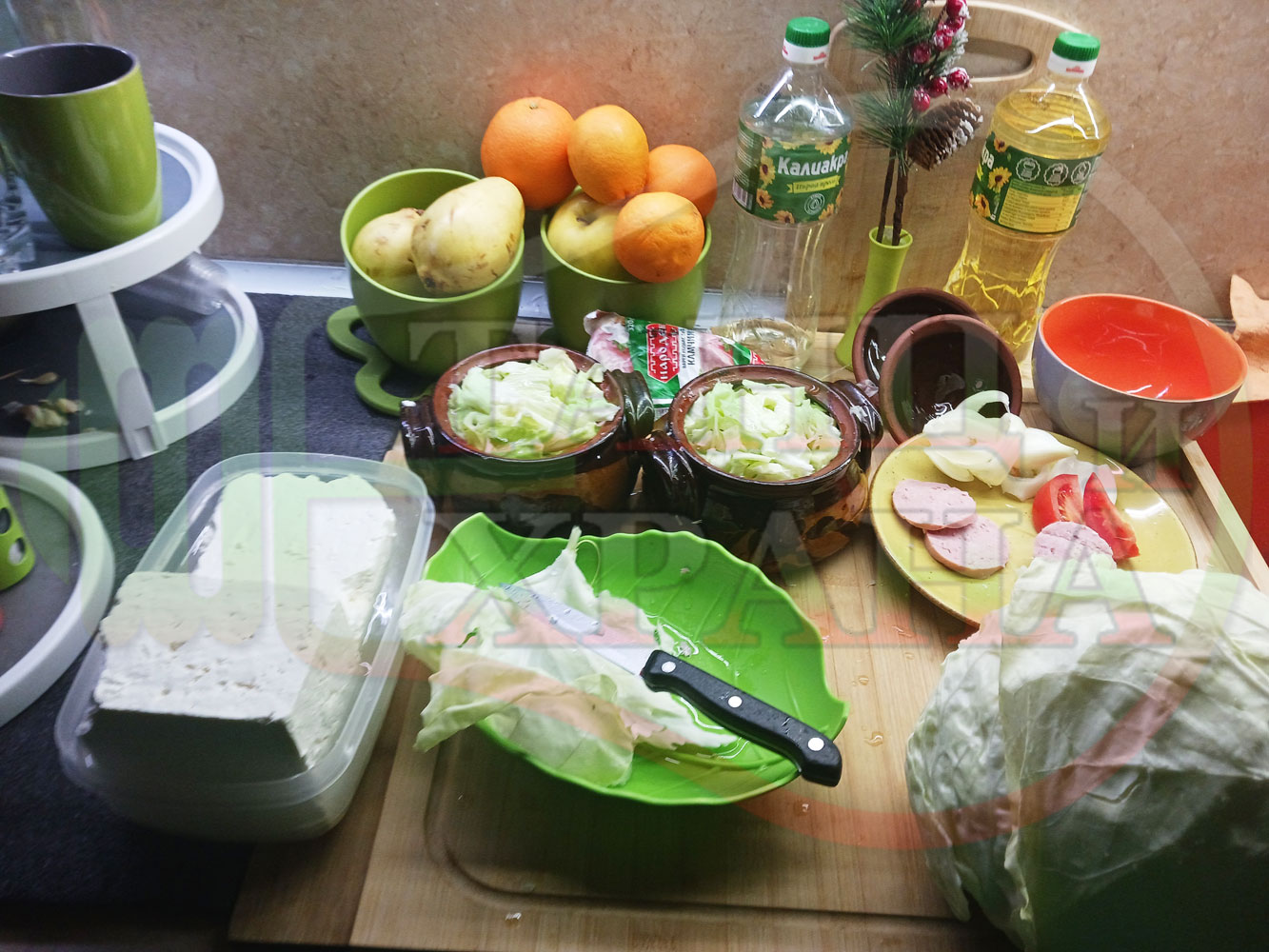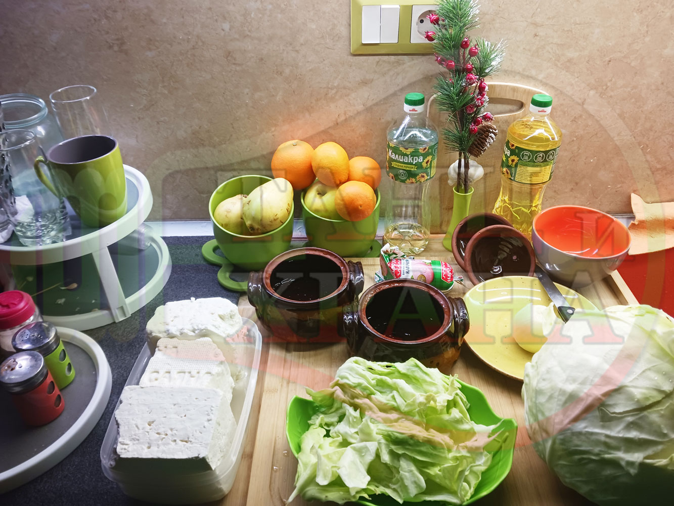 ПРОДУКТИ: Приблизителни количества за български гювечета "Пряснозелеви камчиевосаламени с БГсирене" запечени на фурна с прясно зеле, домати, лук, чесън и чеснов салам гарнирани с големи топки от сиреново зелев крем с краве бяло сирене (българско, саламурено) и магданоз - двукомпонентни