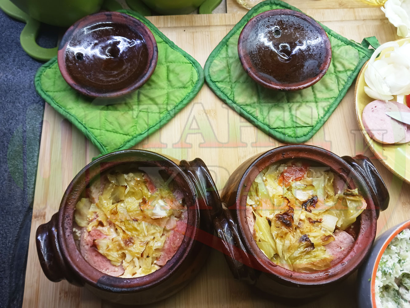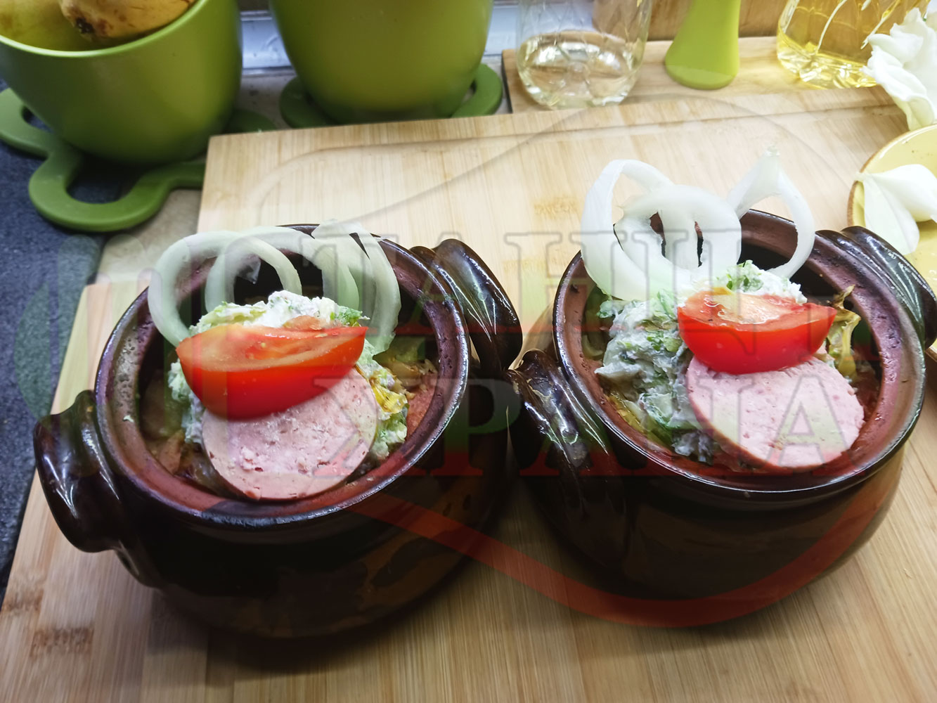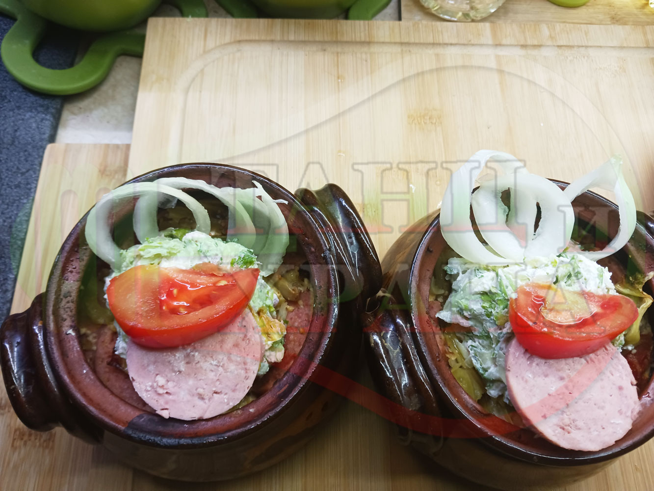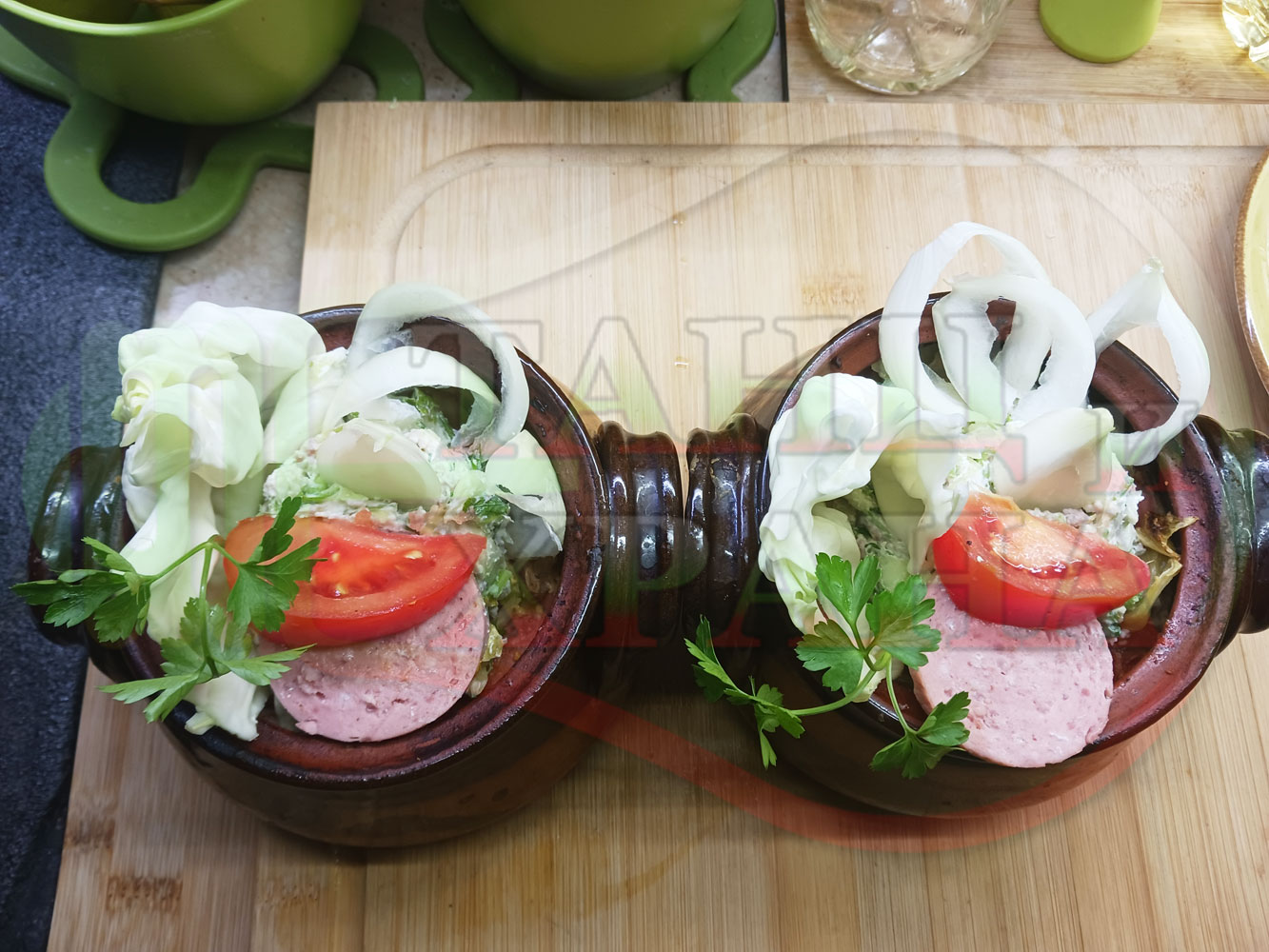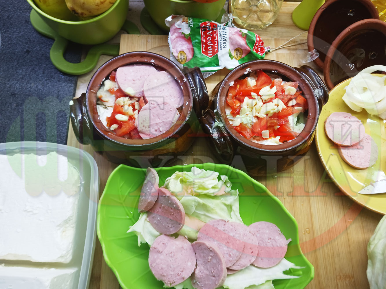 Български гювечета "Пряснозелеви камчиевосаламени с БГсирене" запечени на фурна с прясно зеле, домати, лук, чесън и чеснов салам гарнирани с големи топки от сиреново зелев крем с краве бяло сирене (българско, саламурено) и магданоз - двукомпонентни