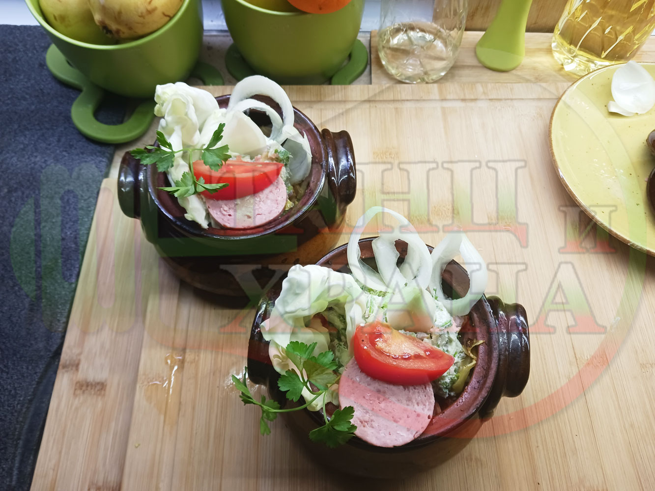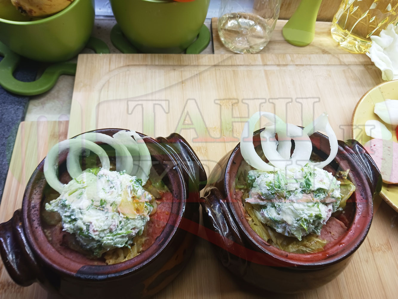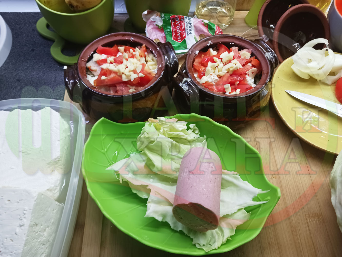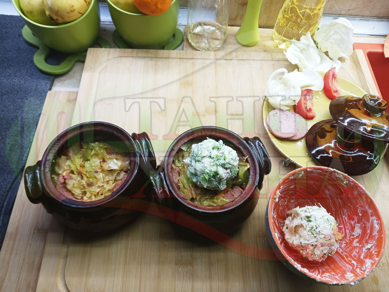 Български гювечета "Пряснозелеви камчиевосаламени с БГсирене" запечени на фурна с прясно зеле, домати, лук, чесън и чеснов салам гарнирани с големи топки от сиреново зелев крем с краве бяло сирене (българско, саламурено) и магданоз - двукомпонентни