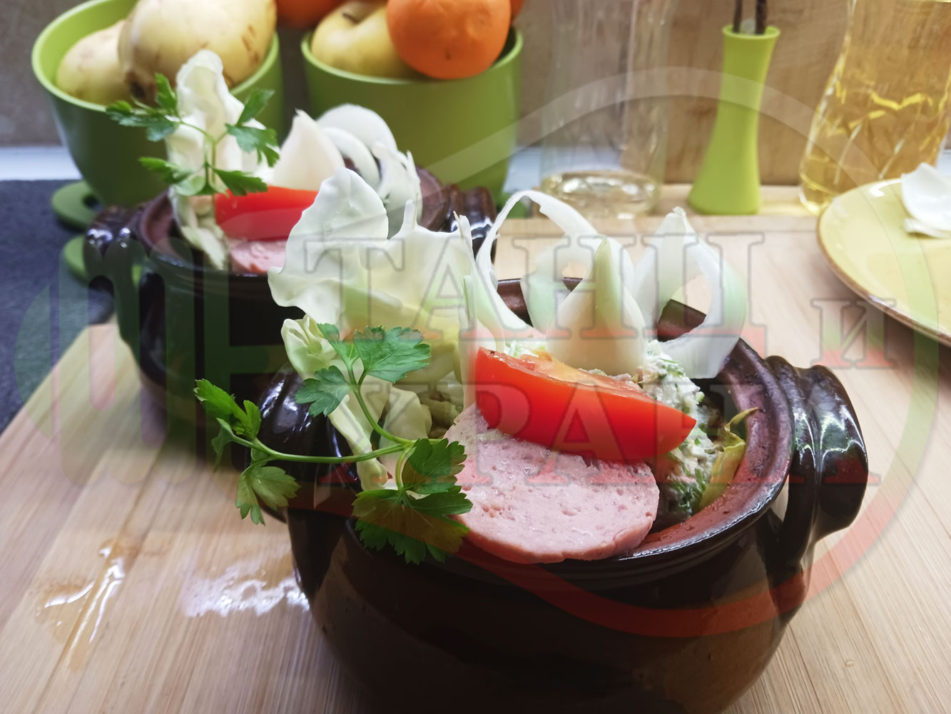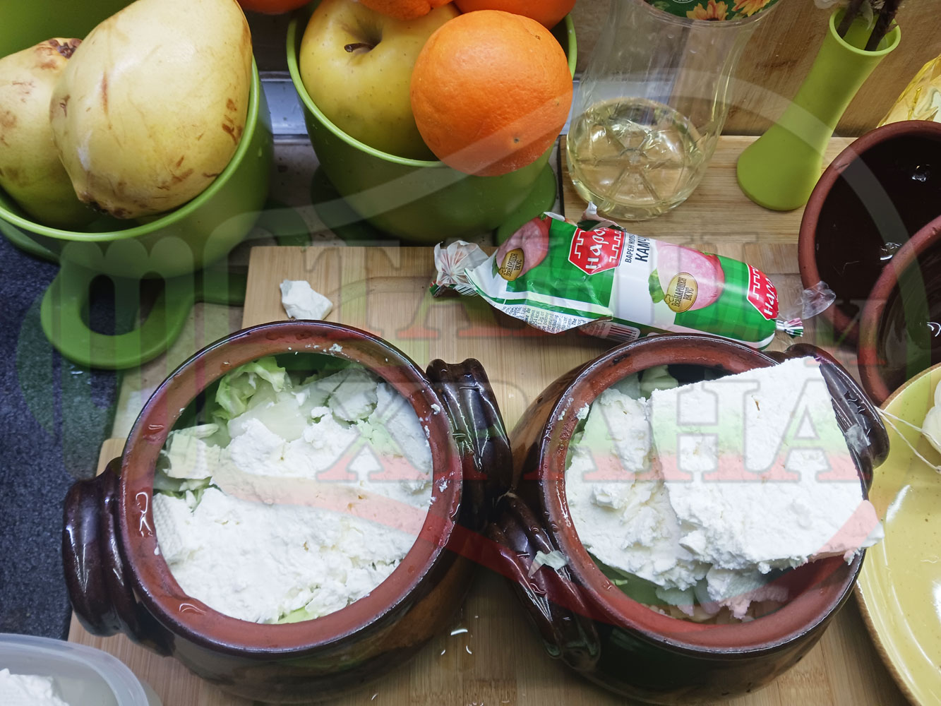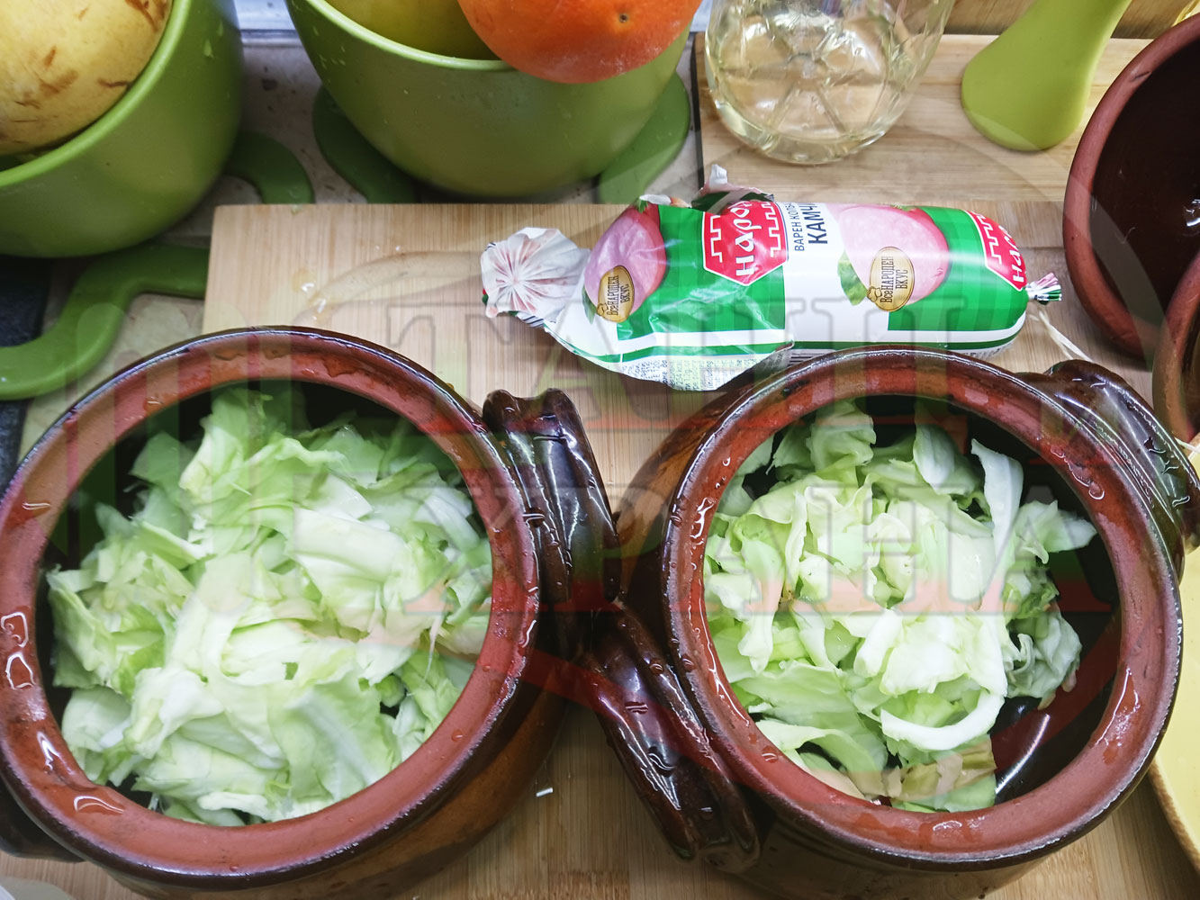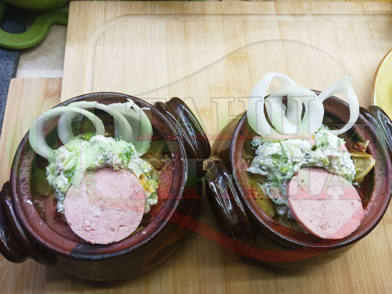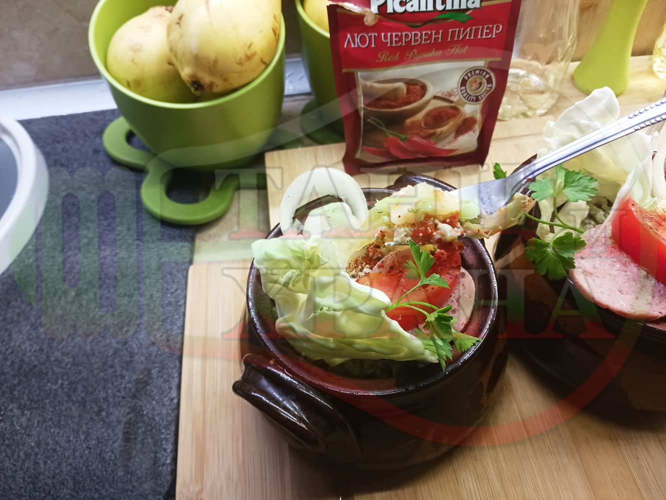 Български гювечета "Пряснозелеви камчиевосаламени с БГсирене" запечени на фурна с прясно зеле, домати, лук, чесън и чеснов салам гарнирани с големи топки от сиреново зелев крем с краве бяло сирене (българско, саламурено) и магданоз - двукомпонентни