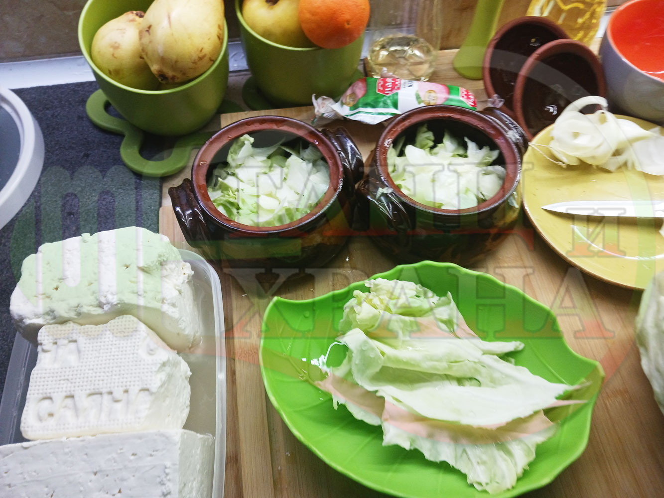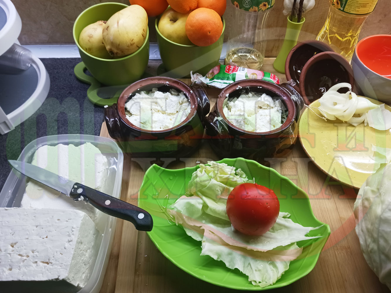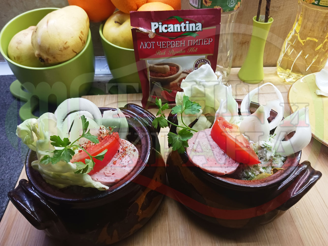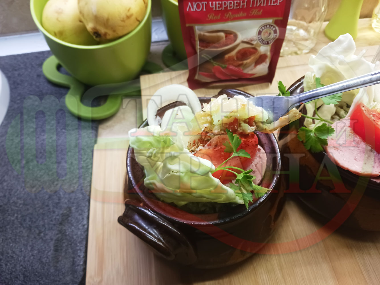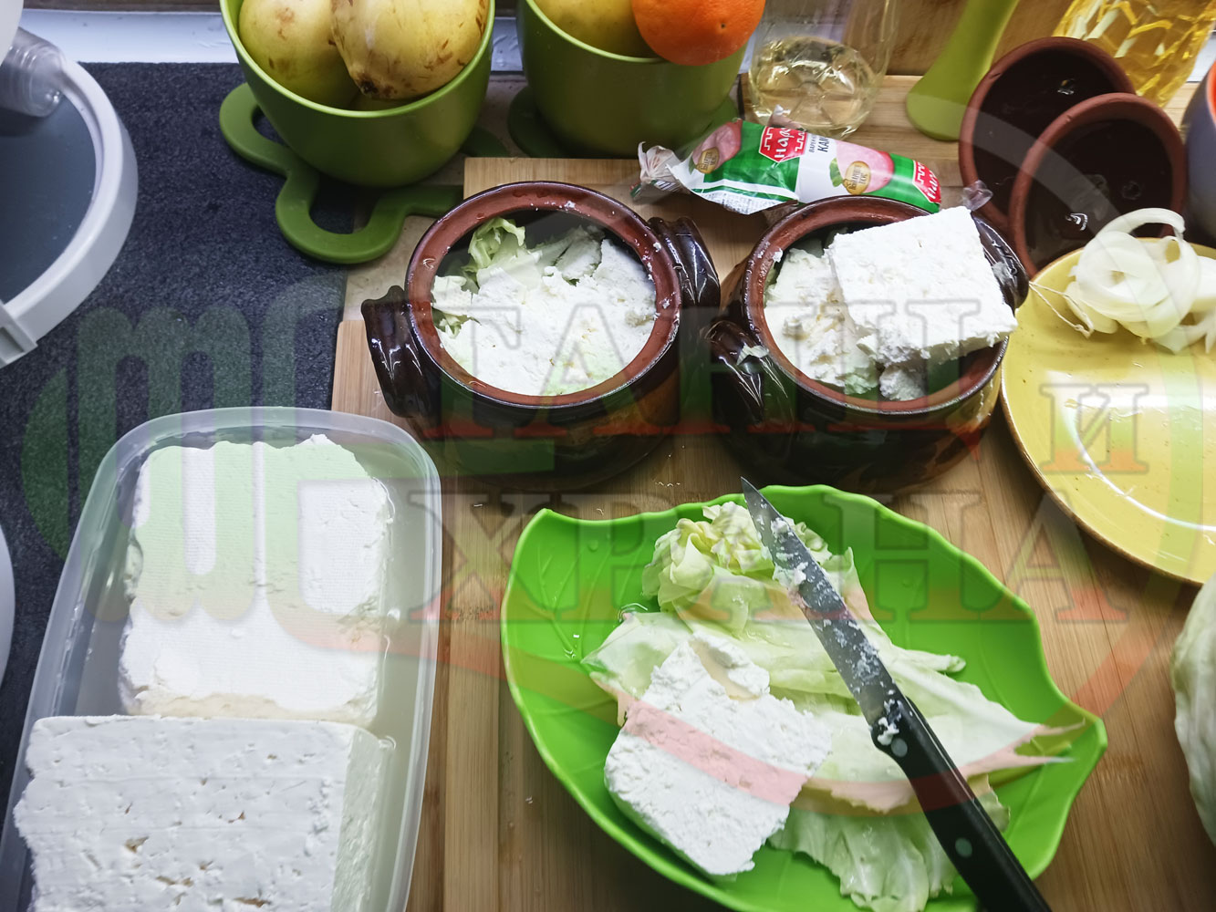 Български гювечета "Пряснозелеви камчиевосаламени с БГсирене" запечени на фурна с прясно зеле, домати, лук, чесън и чеснов салам гарнирани с големи топки от сиреново зелев крем с краве бяло сирене (българско, саламурено) и магданоз - двукомпонентни