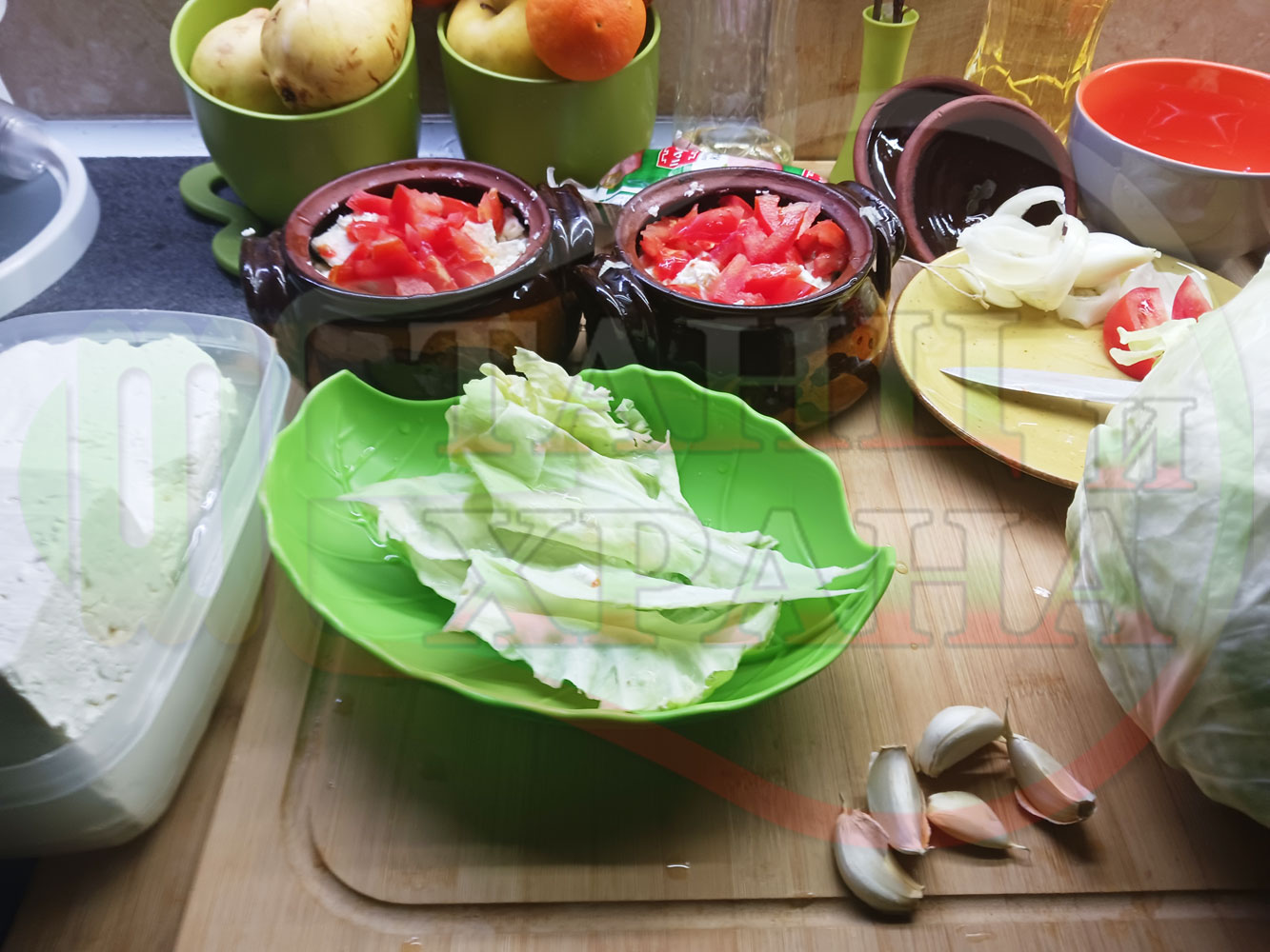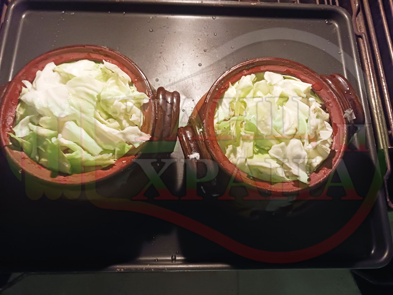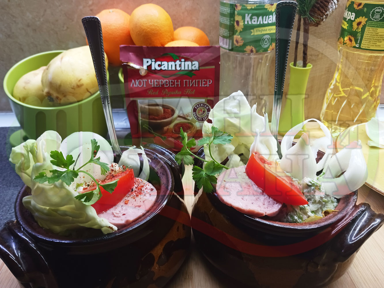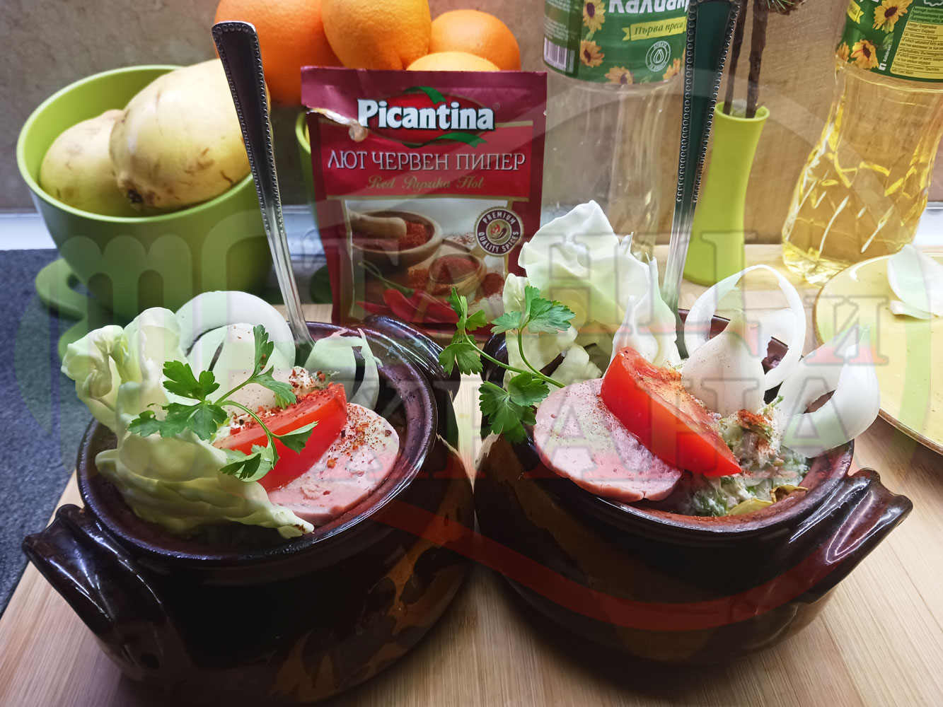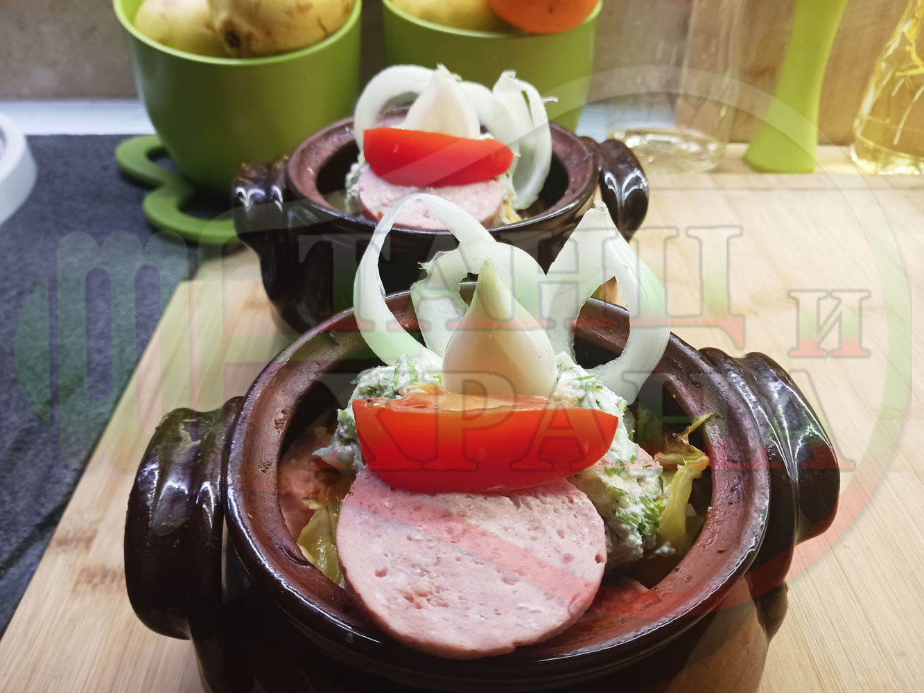 Български гювечета "Пряснозелеви камчиевосаламени с БГсирене" запечени на фурна с прясно зеле, домати, лук, чесън и чеснов салам гарнирани с големи топки от сиреново зелев крем с краве бяло сирене (българско, саламурено) и магданоз - двукомпонентни