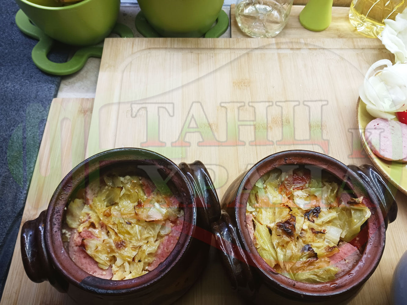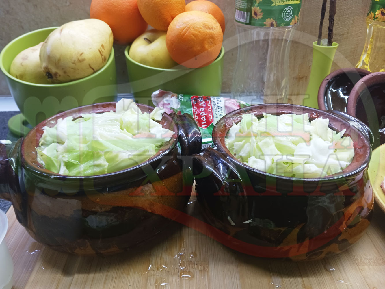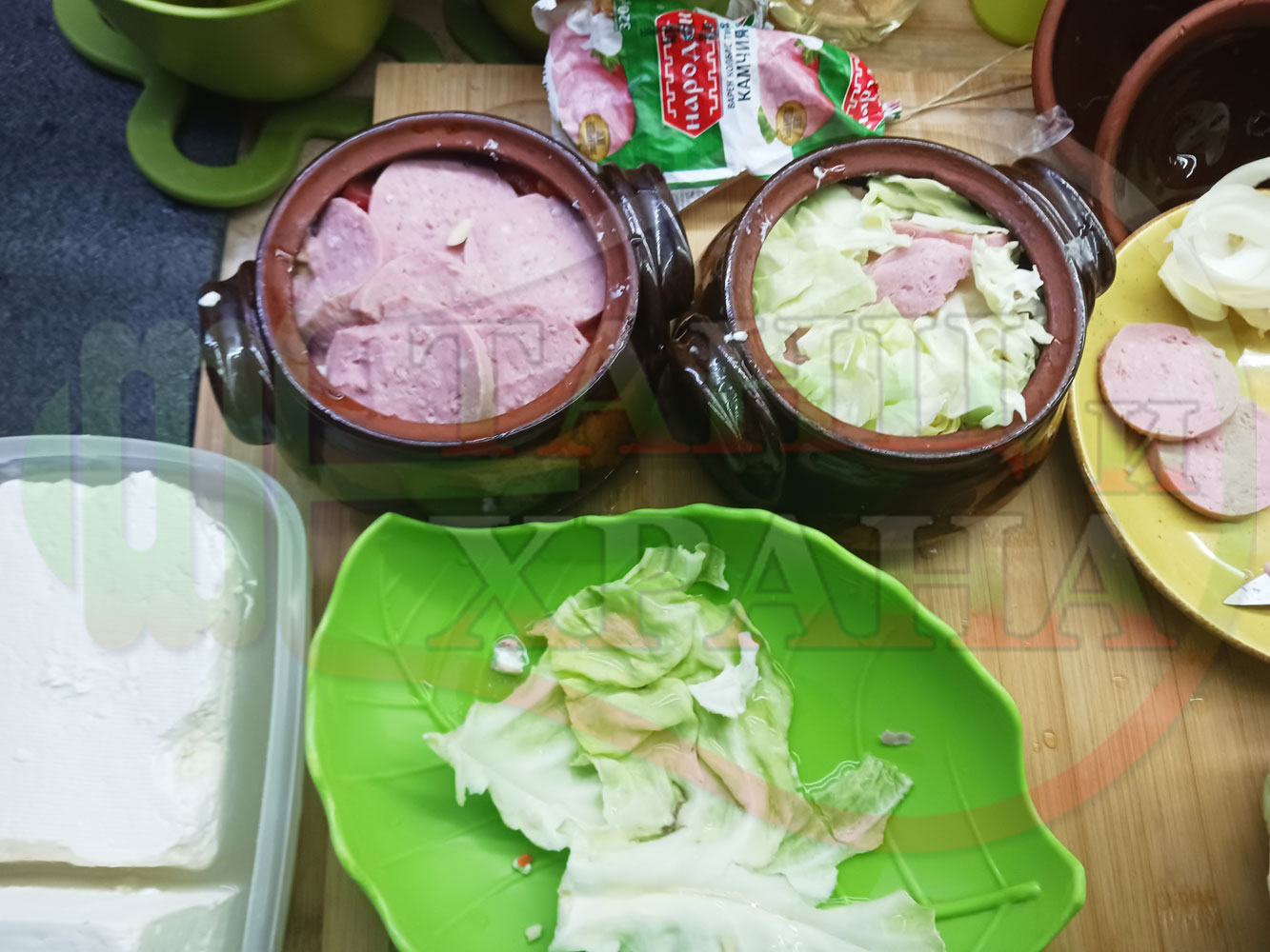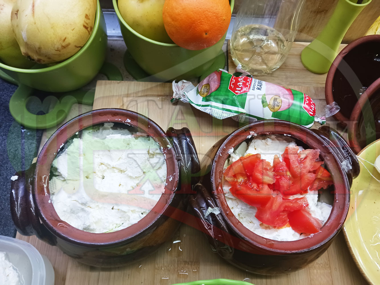 Български гювечета "Пряснозелеви камчиевосаламени с БГсирене" запечени на фурна с прясно зеле, домати, лук, чесън и чеснов салам гарнирани с големи топки от сиреново зелев крем с краве бяло сирене (българско, саламурено) и магданоз - двукомпонентни