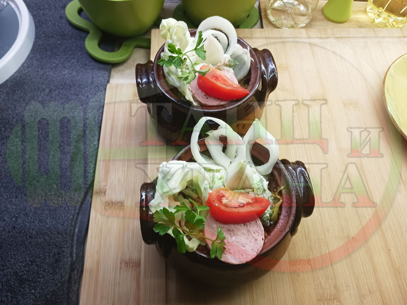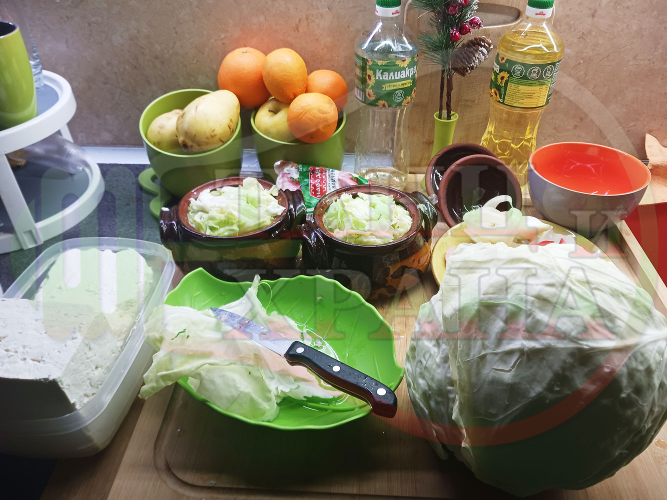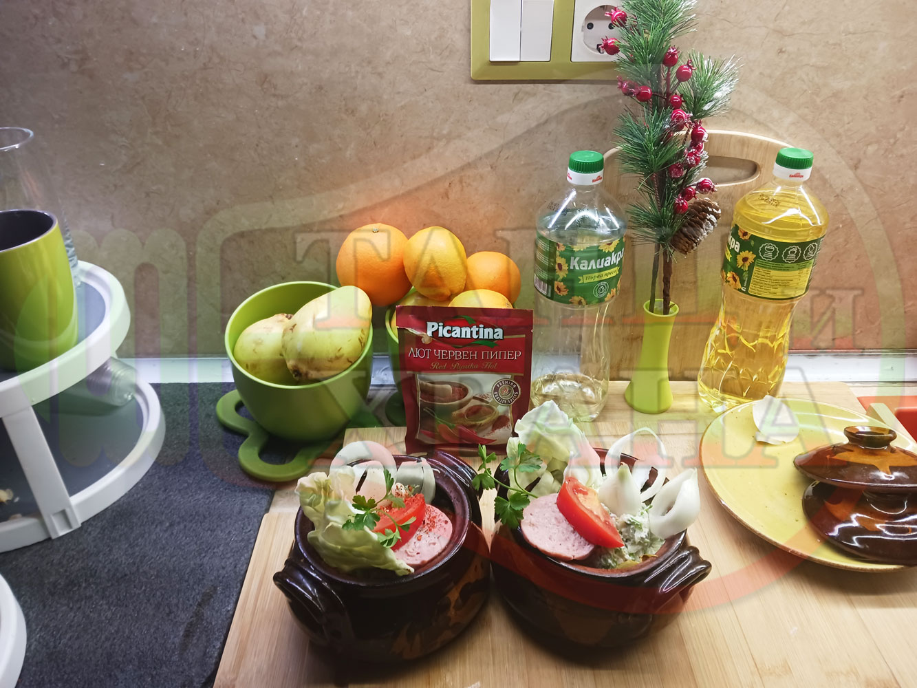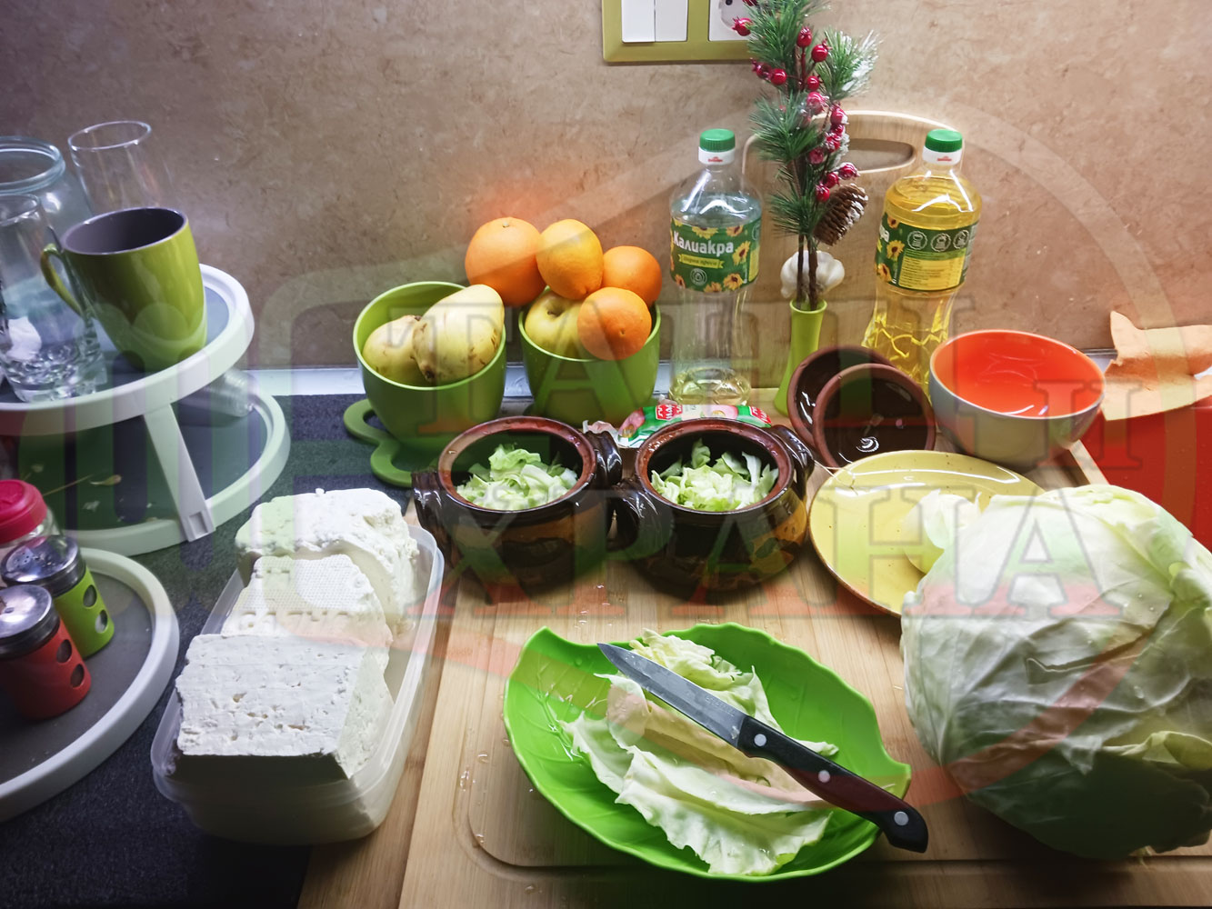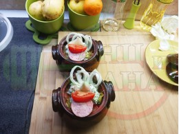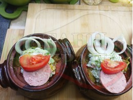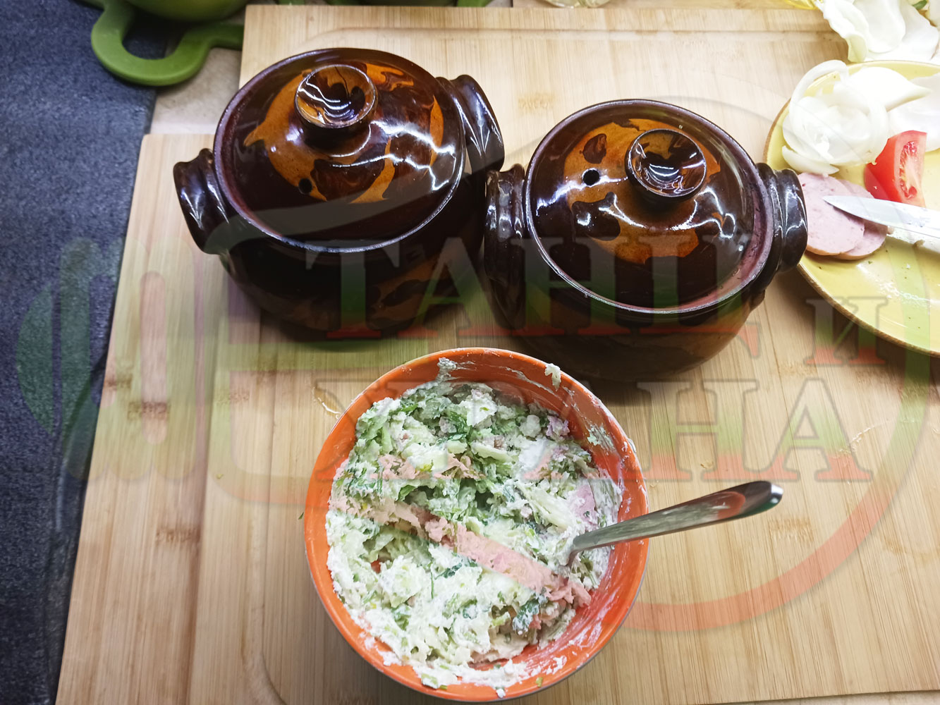 Български гювечета "Пряснозелеви камчиевосаламени с БГсирене" запечени на фурна с прясно зеле, домати, лук, чесън и чеснов салам гарнирани с големи топки от сиреново зелев крем с краве бяло сирене (българско, саламурено) и магданоз - двукомпонентни