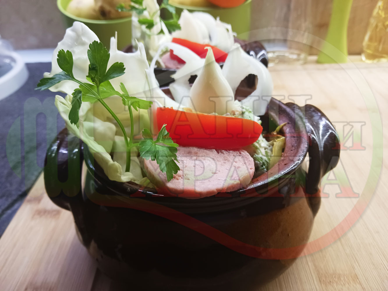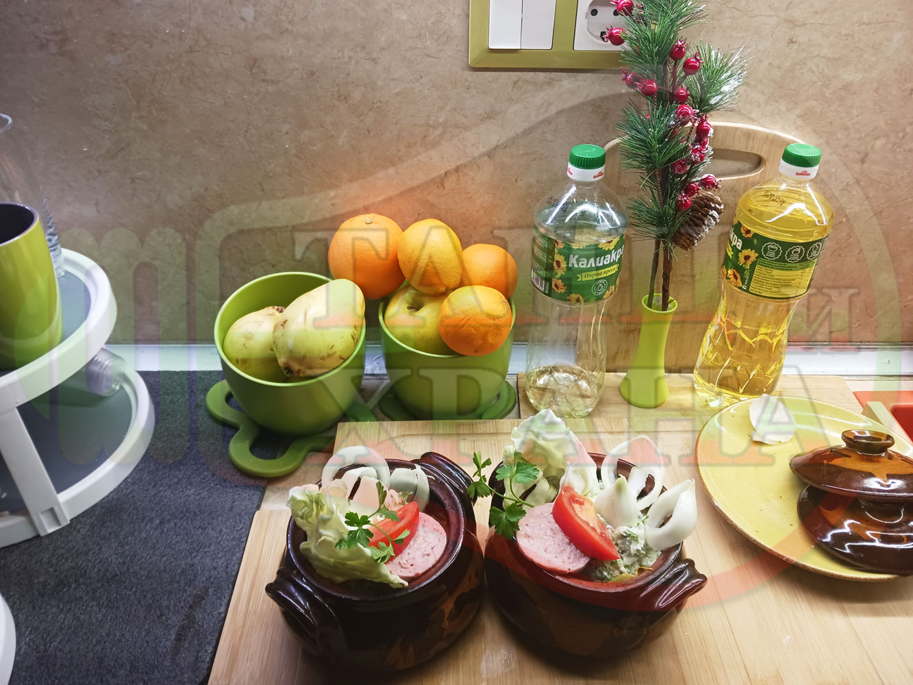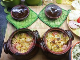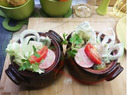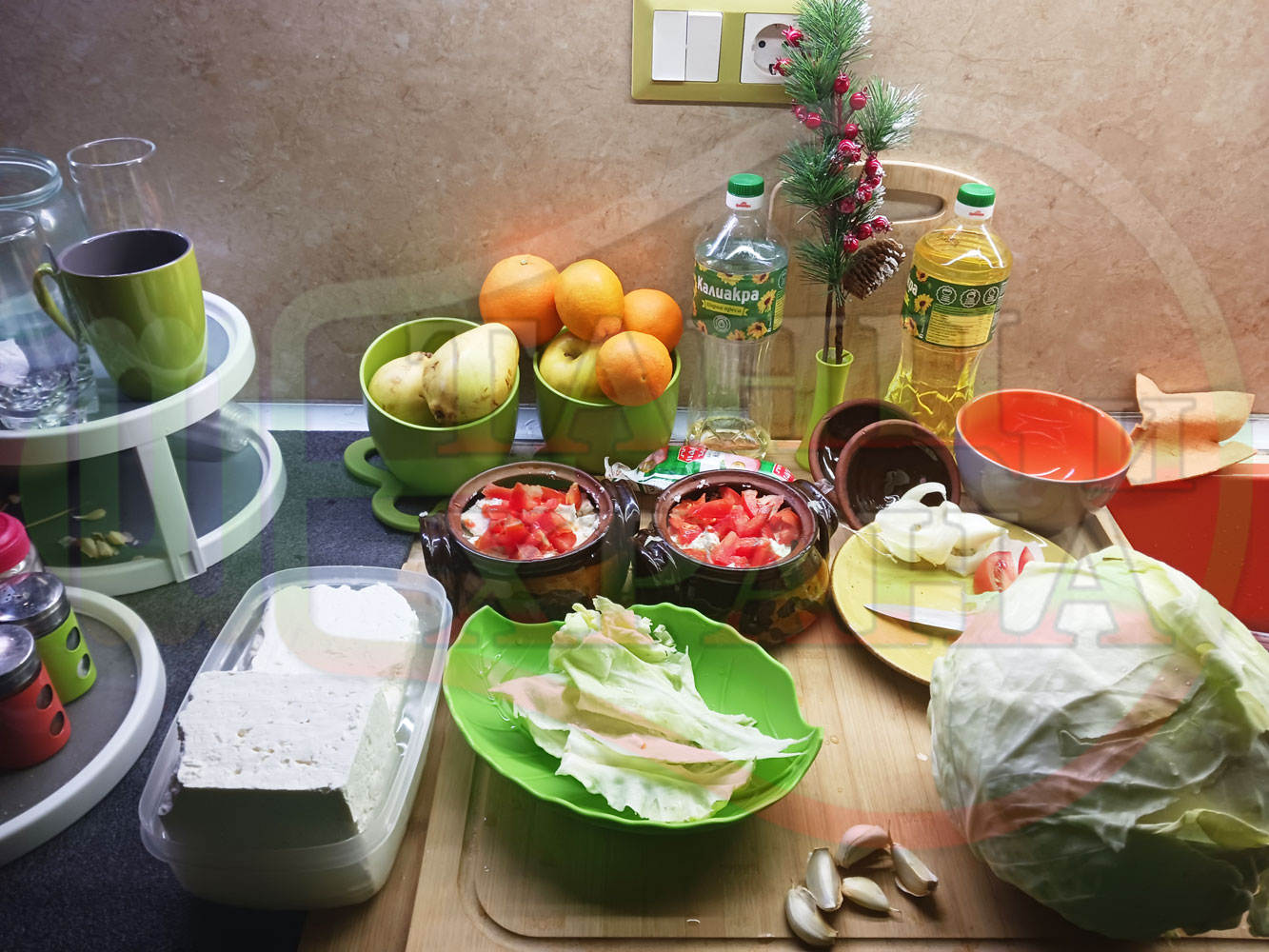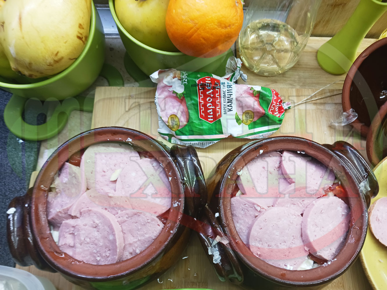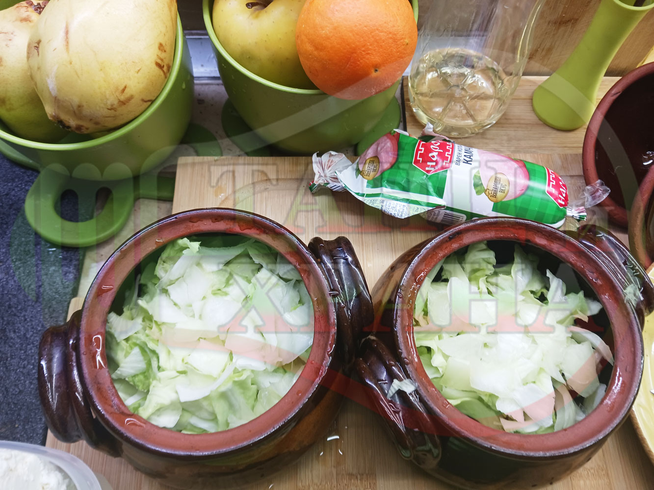 Български гювечета "Пряснозелеви камчиевосаламени с БГсирене" запечени на фурна с прясно зеле, домати, лук, чесън и чеснов салам гарнирани с големи топки от сиреново зелев крем с краве бяло сирене (българско, саламурено) и магданоз - двукомпонентни