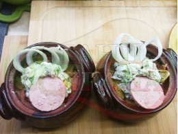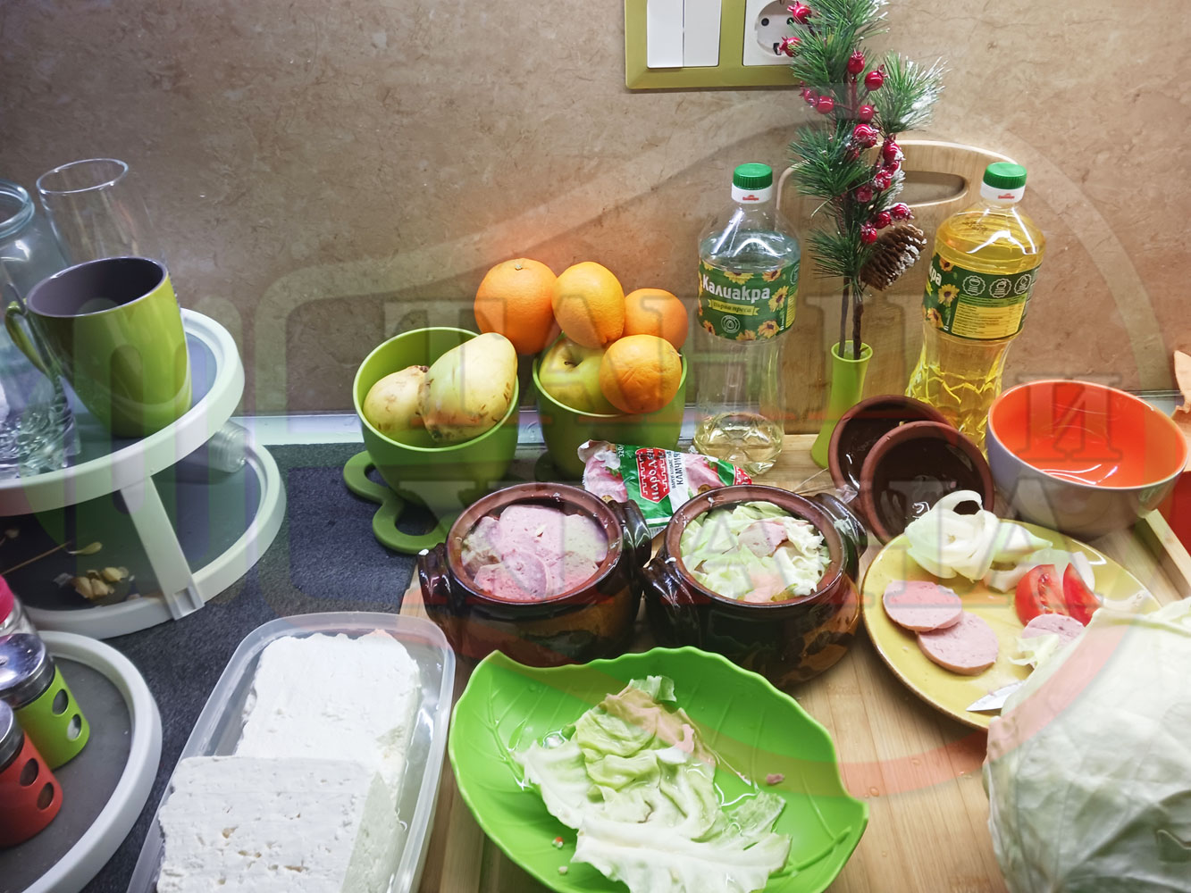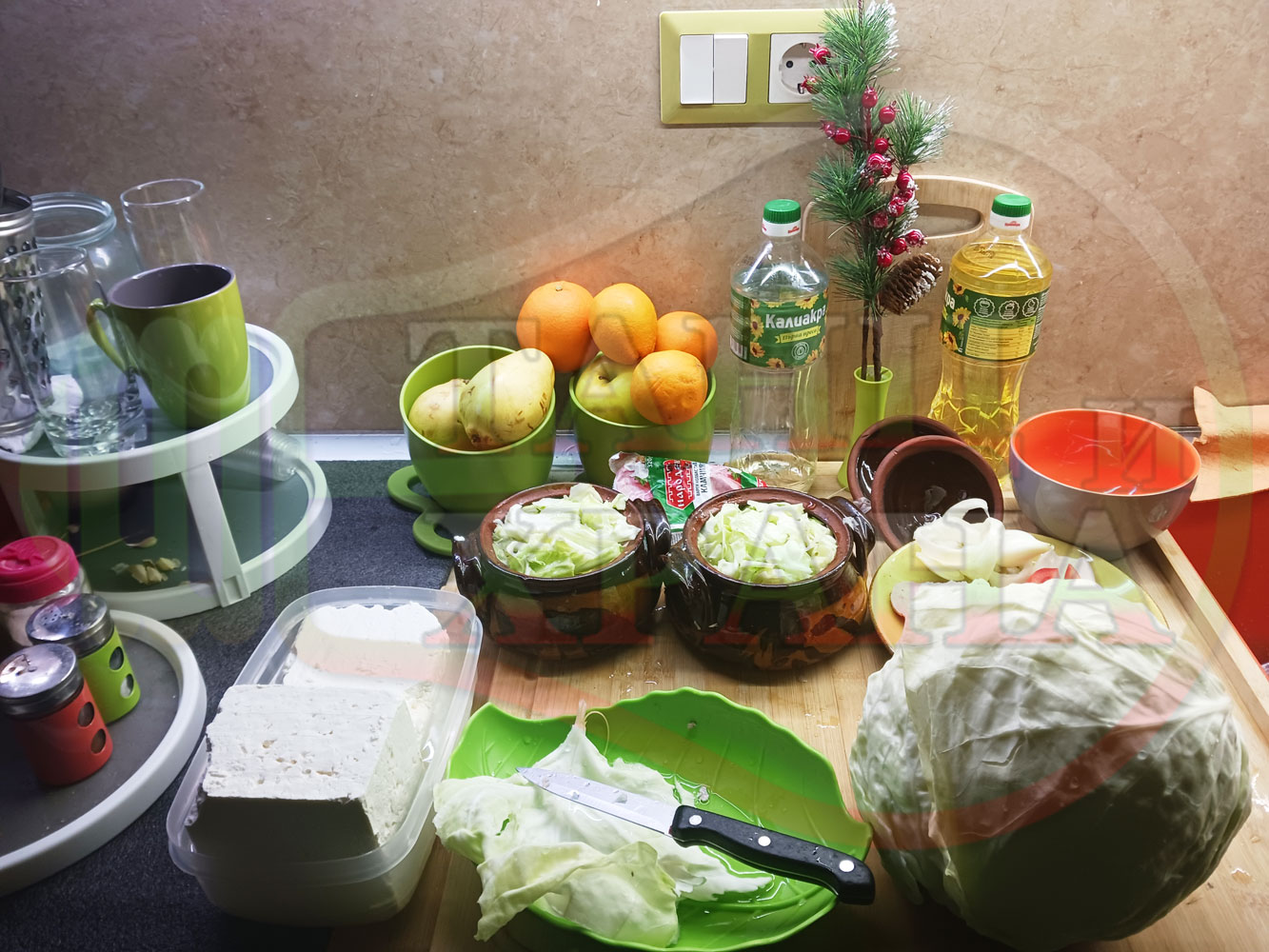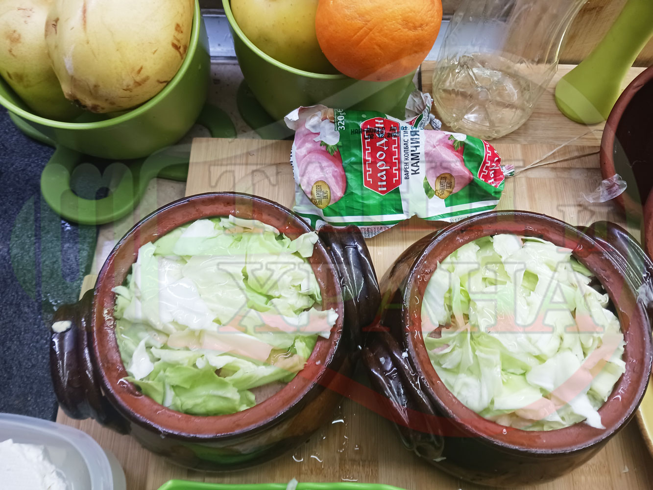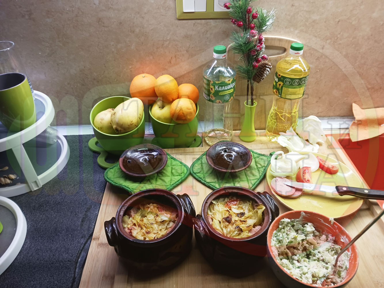 Български гювечета "Пряснозелеви камчиевосаламени с БГсирене" запечени на фурна с прясно зеле, домати, лук, чесън и чеснов салам гарнирани с големи топки от сиреново зелев крем с краве бяло сирене (българско, саламурено) и магданоз - двукомпонентни