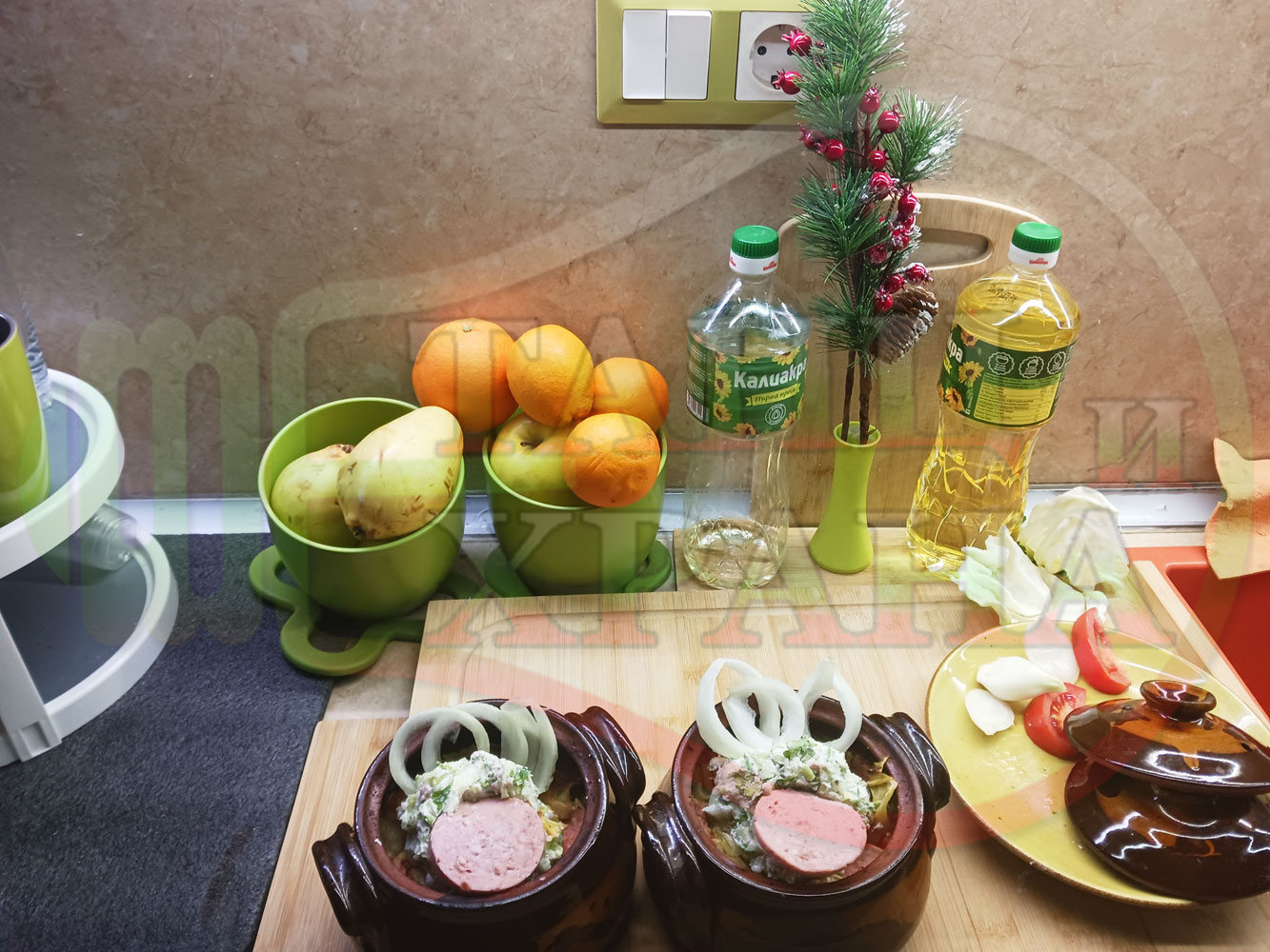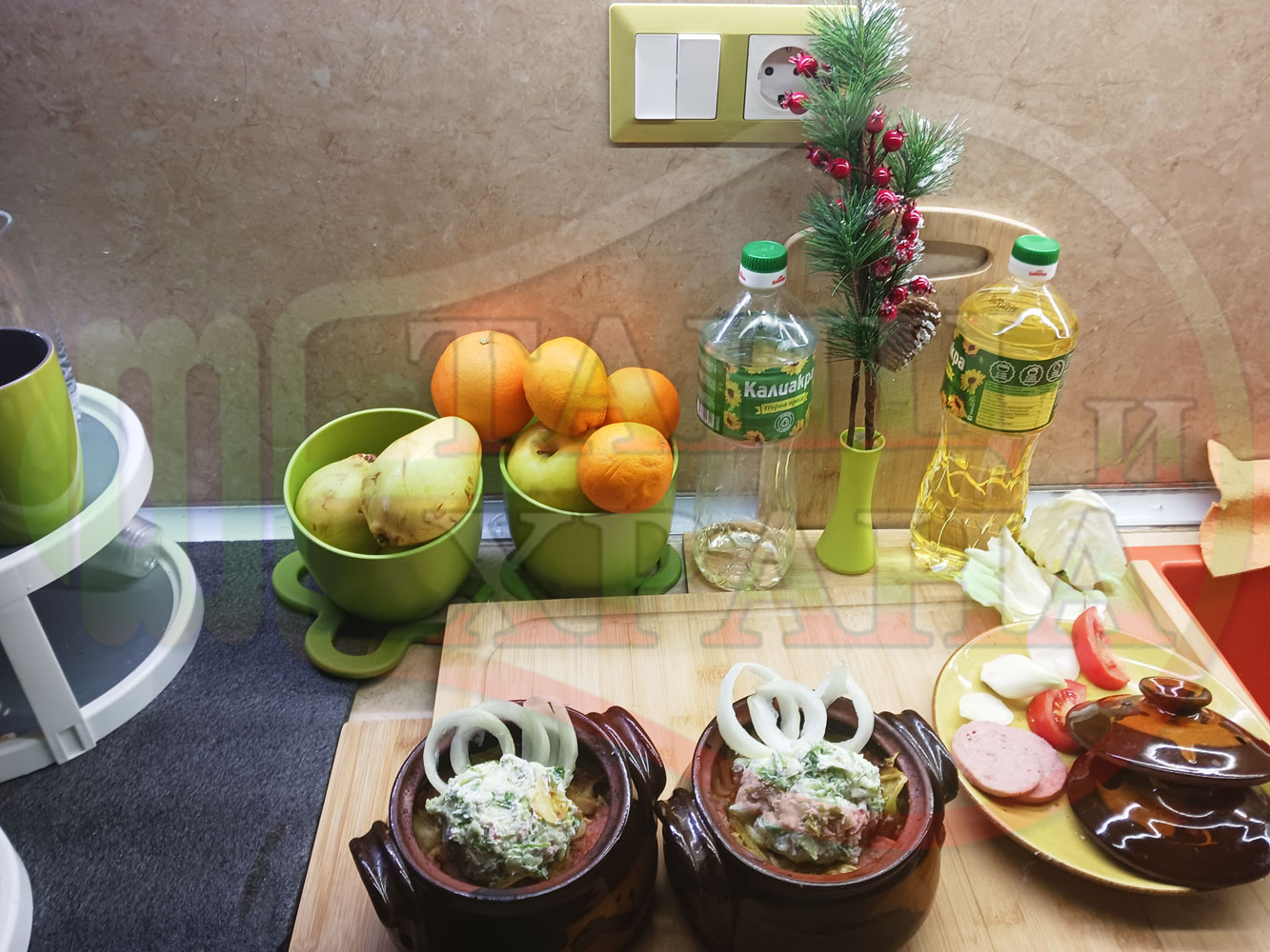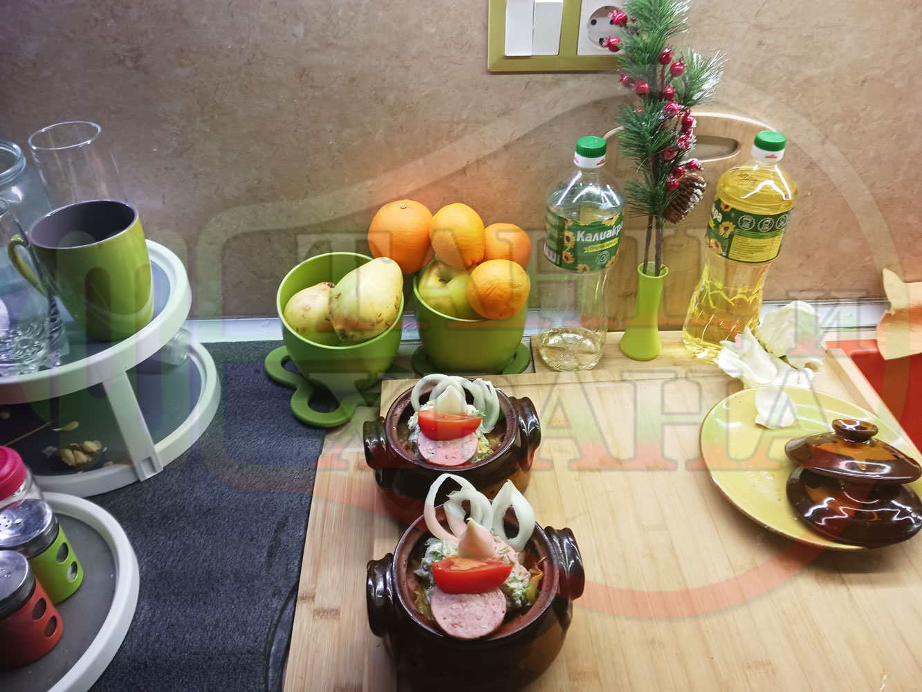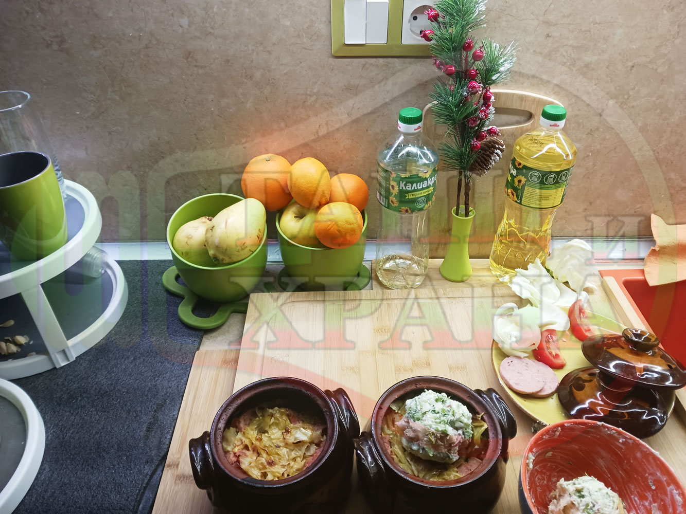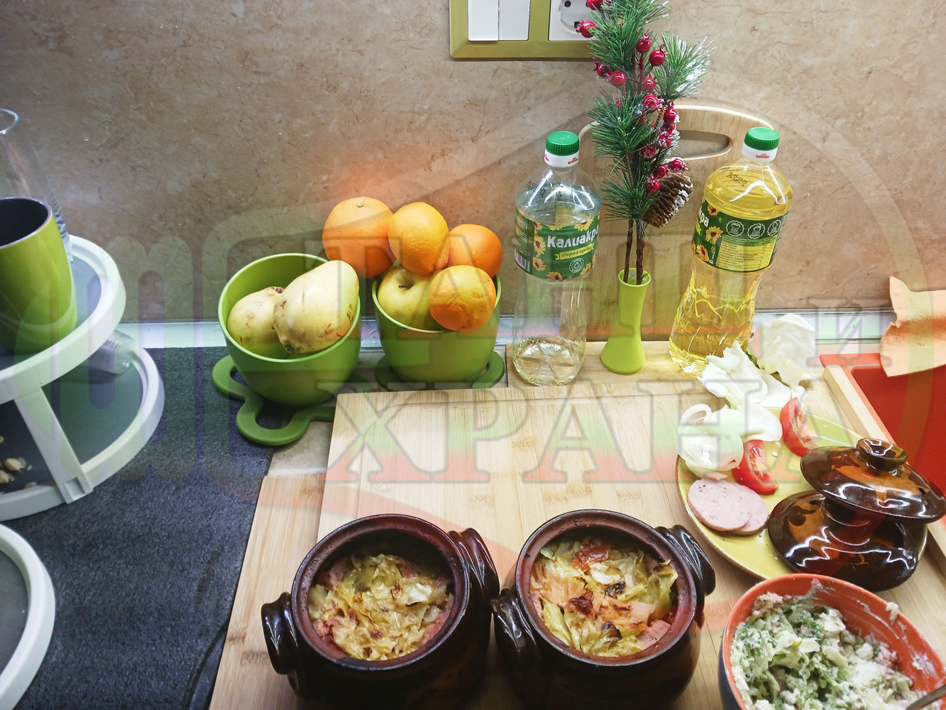 Български гювечета "Пряснозелеви камчиевосаламени с БГсирене" запечени на фурна с прясно зеле, домати, лук, чесън и чеснов салам гарнирани с големи топки от сиреново зелев крем с краве бяло сирене (българско, саламурено) и магданоз - двукомпонентни