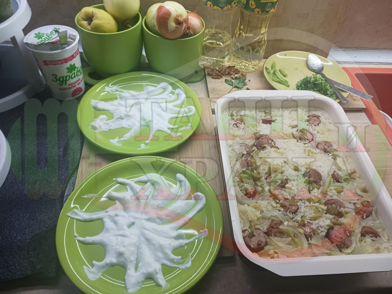 Вкусен ориз, сварен и запечен на фурна с родопска наденица шпикована със зелени пресни чушки. Аромат на запечени чушки и едва доловима карамелизация и сладост на лука. Киселото мляко от България е един от почти задължителните продукти, когато хапваме някакво ястие с ориз или зеленолистни като спанак и лапад. Оризът обича млякото и вкусът на ястието се балансира.