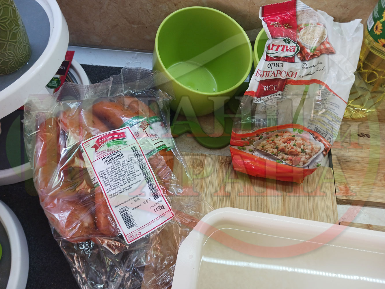 ПРОДУКТИ: Приблизителни количества за ориз "Родопсконаденицов лютеничен" сварен на фурна с чесън и родопска наденица (с български мерудии) оформен като кладенче напълнено с едросмляна лютеница