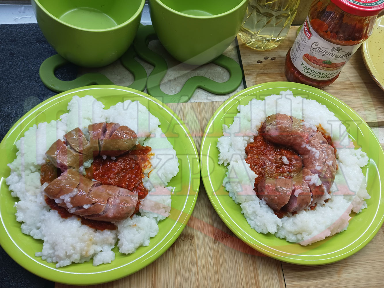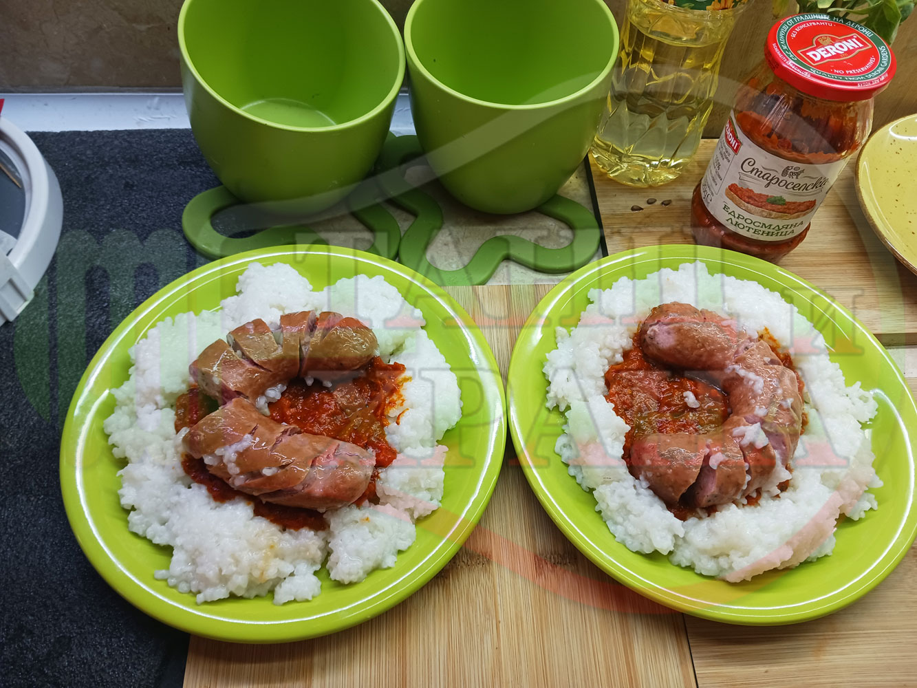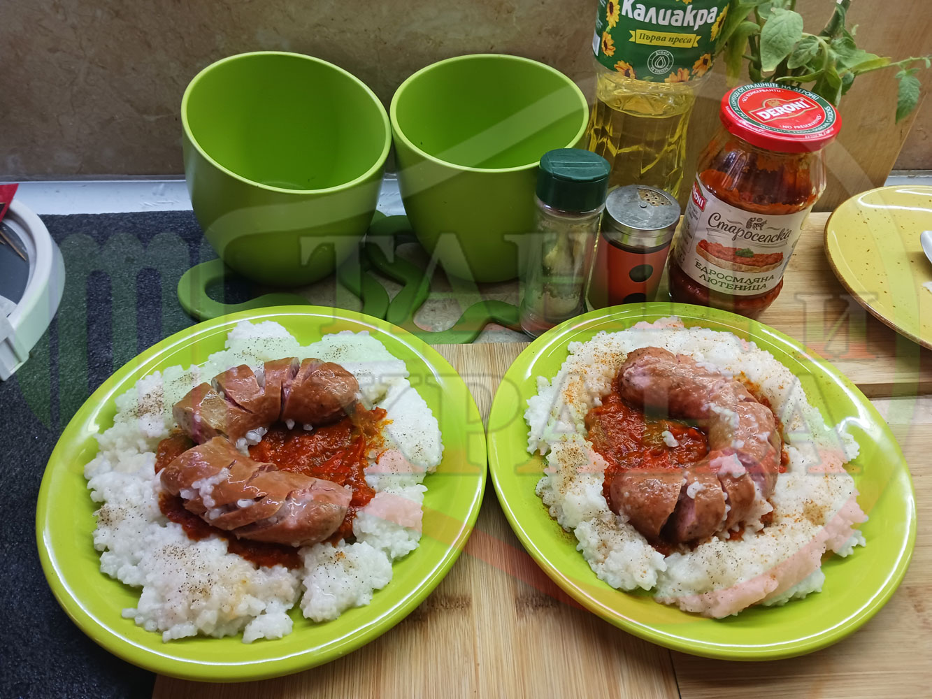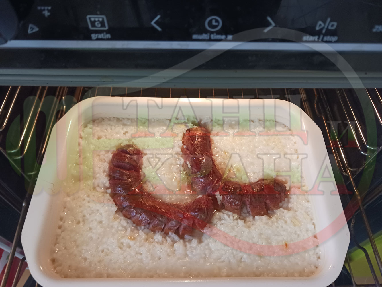 ВНИМАНИЕ: Фурните са различни и съответно времето за сваряване и запичане е ориентировъчно. Наблюдавайте процеса на запичане и при необходимост, покрийте с капак или отстранете тавата от фурната. Обърнете поне 1 път наденицата за да се запече от 2-те страни (имайте предвид, че едната страна на наденицата остава по-светла (страната, която е в ориза)).