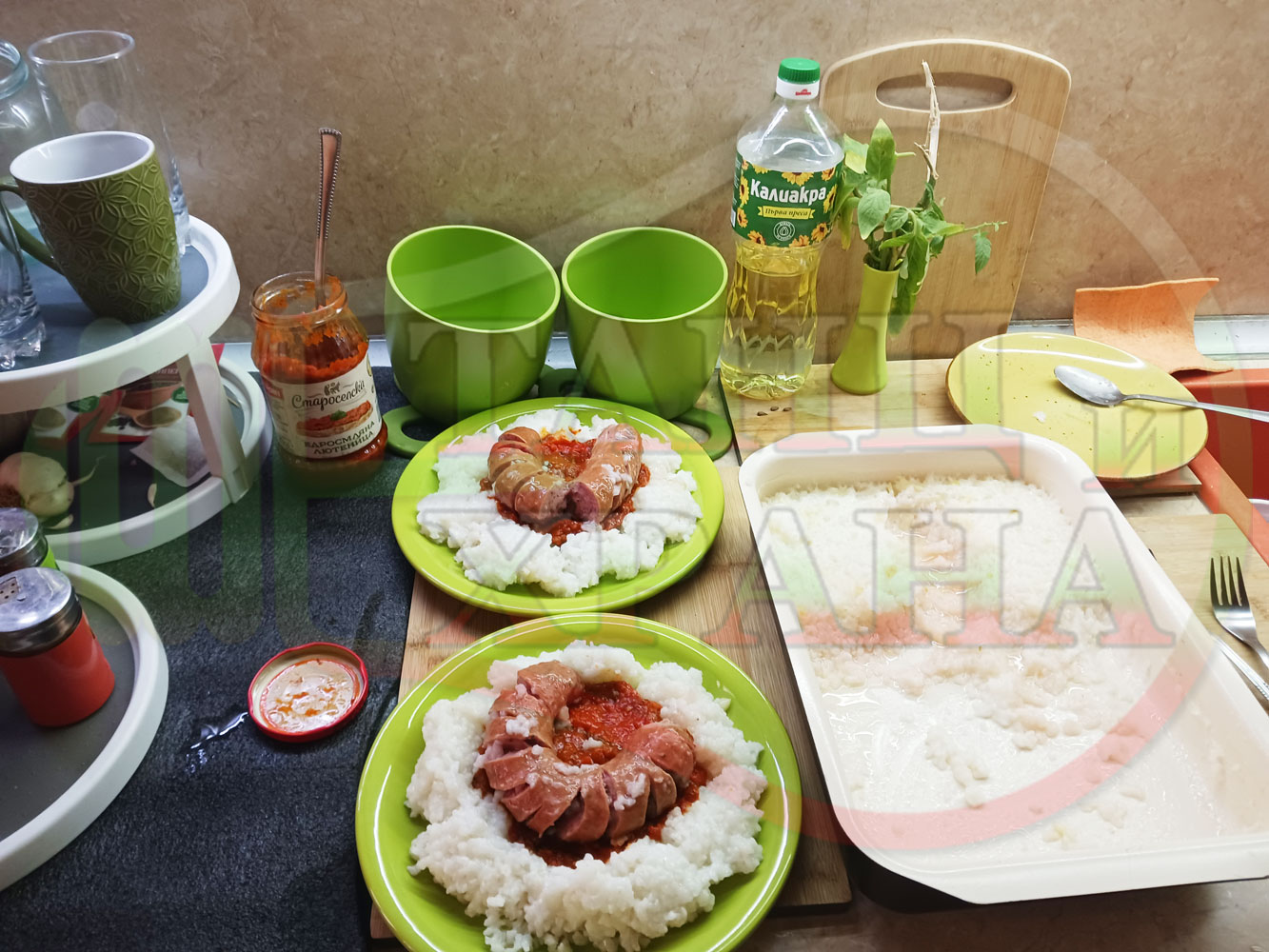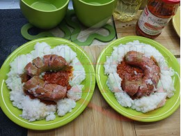 Оформете от ориза "кладенчета" по диаметъра на чиниите и сипете по 2 супени лъжици ориз в средата. Разстелете ориза в средата на кладенчетата и ги напълнете с по 2 супени лъжици лютеница. Загладете лютеницата и поставете по 1 наденица върху нея.