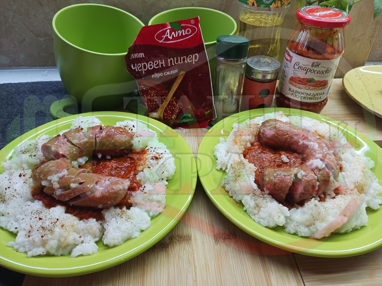 Ориз "Родопсконаденицов лютеничен" сварен на фурна с чесън и родопска наденица (с български мерудии) оформен като кладенче напълнено с едросмляна лютеница