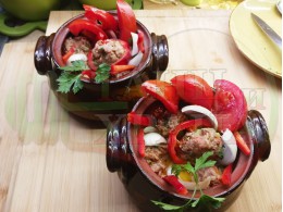 Гювечета "Луканкови с БГсирене и тиквички" запечени на фурна с луканка, краве бяло сирене, моркови, домати, лютеница, стар чесън, кромид лук и яйца гарнирани с мариновани печени люти чушлета