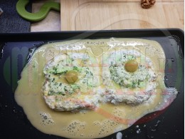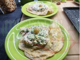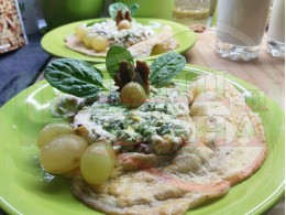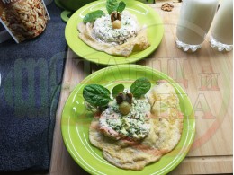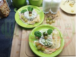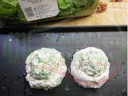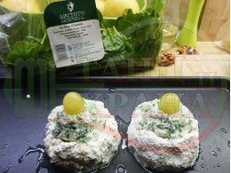 Български сиренови кладенчета "Гроздовоспаначени чеснови с БГсирене" приготвени със сиреново гроздов и спаначен крем от прясно грозде, орехи, спанак, стар чесън и краве бяло сирене (българско, саламурено) запечени на фурна с яйца - двукомпонентна