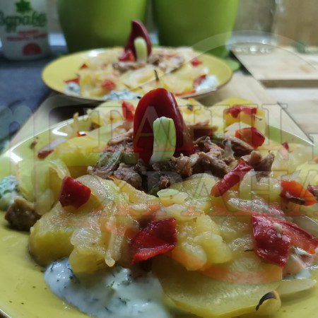 ЯСТИЯ С ПИЛЕ - ОТ ВСИЧКИ КАТЕГОРИИ ЯСТИЯ С АГНЕШКО И ГОВЕЖДО МЕСО Категорията съдържа различни традиционни български и осъвременени рецепти за ястия с агнешко и говеждо месо и техни"ТЕ" производни. Покажи: 5 10 15 20 25 30 50 100 Всички Агнешка дроб сарма на фурна "Агнешко гергьовденска краставичноспаначена" приготвена от ориз, агнешки комплект, пресен лук и краставици с тънка млечно яйчена спаначена заливка с яйца, чесън, спанак и кисело мляко от България (2025 г.) Агнешка плешка "Фидеморковена ябълковотиквичкова" запечена на фурна с пресни червени чушки, кромид лук и пресни лук и чесън досварена с моркови и фиде приготвена в кладенче от пресни ябълки и тиквички - производно Великденска агнешка яхния "Фидеморковена" запечена на фурна с пресни червени чушки, кромид лук и пресни лук и чесън досварена с моркови и фиде гарнирана с кисело мляко от България - производно Великденска агнешка плешка "Фидеморковена ябълковоспаначена" запечена на фурна с пресни червени чушки, кромид лук и пресни лук и чесън досварена с моркови и фиде приготвена върху млечна основа от ябълки, спанак и кисело мляко от България - производно Великденска агнешка плешка "Агнешкочервеночушкова зеленочушковомлечна" запечена на фурна с пресни червени чушки, кромид лук и пресни лук и чесън приготвена върху млечна зеленочушкова основа от свеж копър, чесън и кисело мляко от България - производно Великденска агнешка плешка "Агнешкочервеночушкова" запечена на фурна с пресни червени чушки, кромид лук и пресни лук и чесън приготвена върху млечно спаначена основа от свеж спанак, стар чесън и кисело мляко от България (2025 г.) Агнешка картофена салата "Червеночушкова млечна" приготвена от запечени на фурна картофи, червени пресни чушки, кромид лук и варено агнешко гарнирана върху млечна основа от свеж копър, чесън и кисело мляко от България Агнешка зеленчукова топчеста салата "Червенозеленочушкова с БГсирене" приготвена от червени и зелени пресни чушки, домати и варено агнешко гарнирана със сиреново магданозени топчета с кисело мляко от България Говеждо с картофи "Говеждо с червени чушки върху млечна сиренова основа" приготвено на фурна с червени пресни чушки, чесън и свеж магданоз гарнирано с млечна сиренова основа с кисело мляко от България Великденска агнешка плешка на фурна "Копривноспаначена червеночушкова" запечена с плънка от ориз, червени чушки, коприва, спанак, зелен лук, червен сладък пипер и ронена чубрица гарнирана с млечна основа от див чесън и кисело мляко от България-2024 г Великденско агнешко "Майчиноприготвено празлучено с БГмерудии" запечено на фурна с дроб сарма с ориз и праз лук, червен сладък пипер, ронена чубрица, черен пипер и краве масло