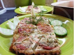 Хлебна плоска торта "Каймянотопчеста със сметана" омесена от хляб с лютеница, прясно мляко, заквасена сметана и ронена чубрица изпечена на фурна с кромид лук, зелени пресни чушки и кайма със заливка от яйца, топено сирене и кашкавал