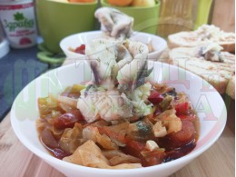 Зеле с риба "Херингово пряснозелево доматеночервеночушково" запечено на фурна с прясно зеле, кромид лук, домати, червени пресни чушки, краве масло, свеж магданоз, чесън и червен сладък пипер гарнирано с маринована херинга и кашкавал - производно